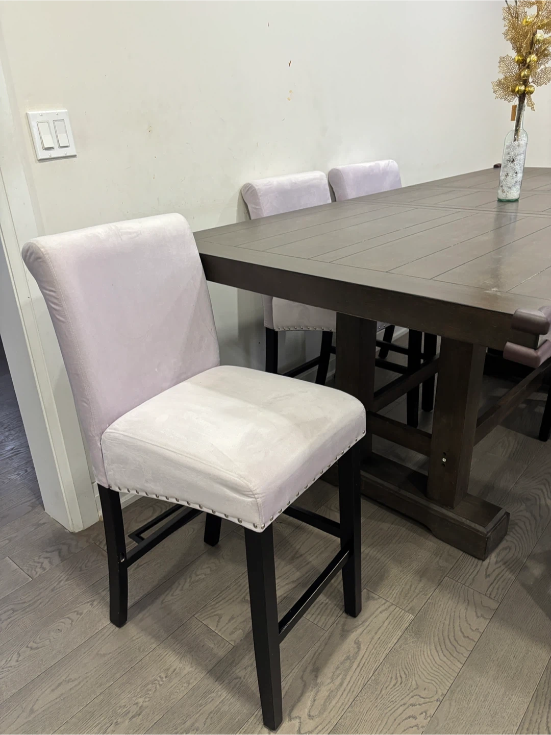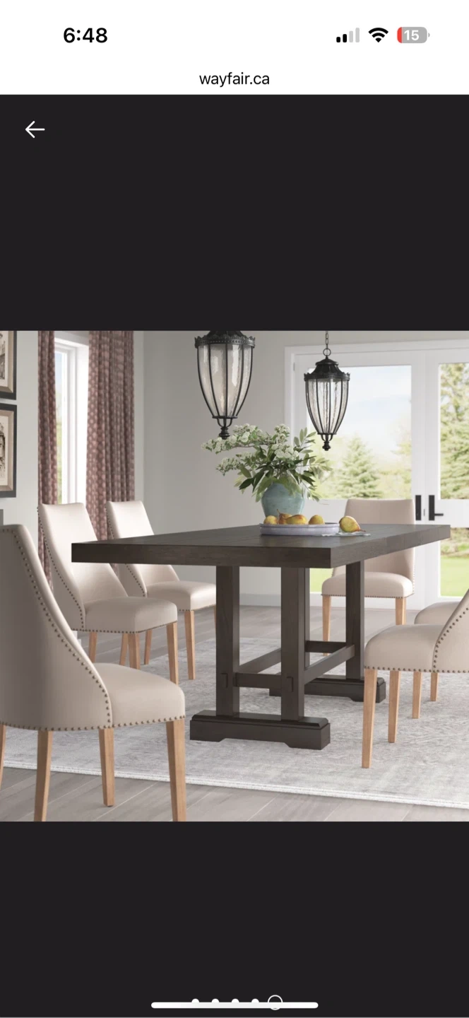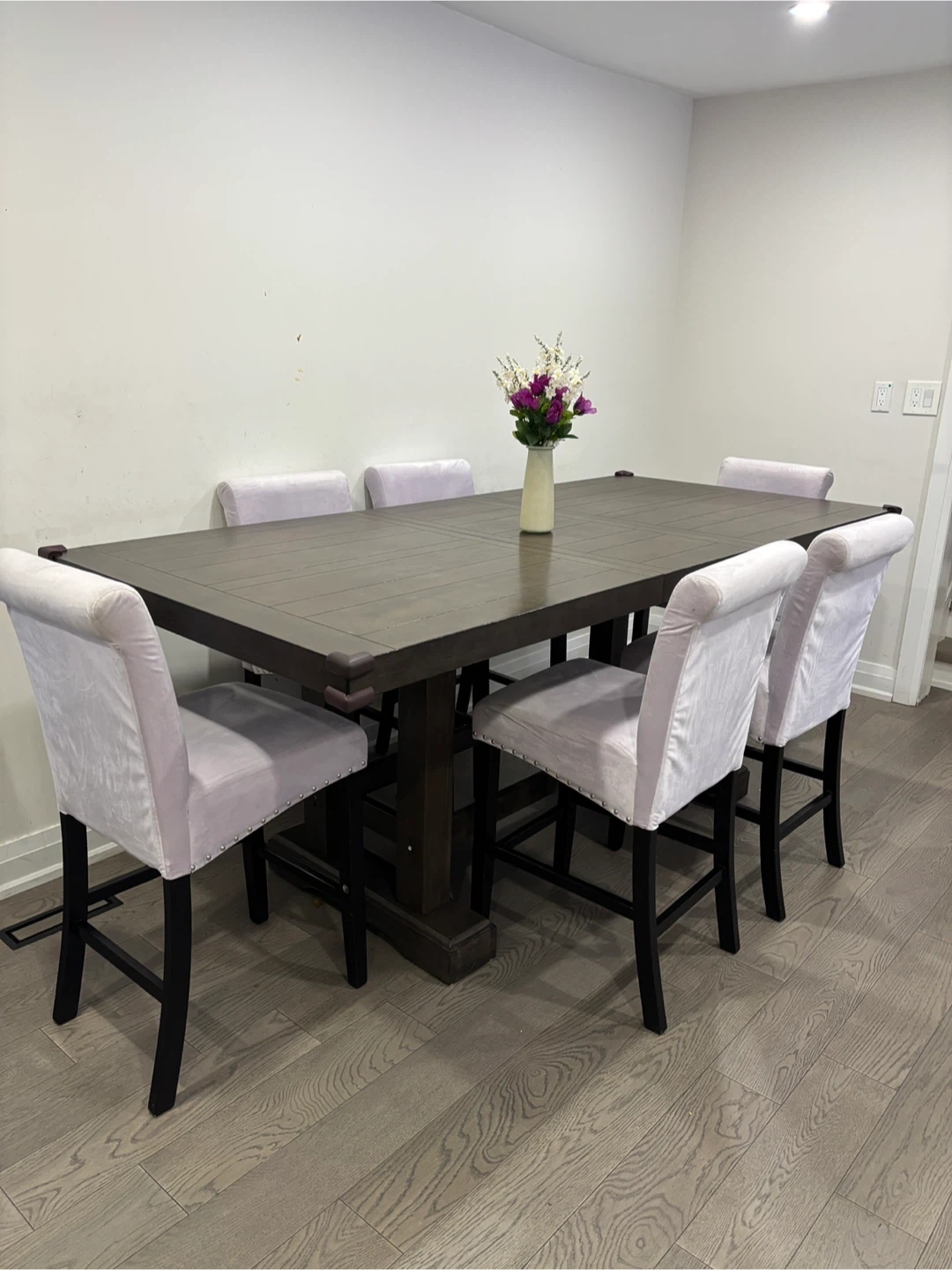 Selling a wayfair dining table with six chairs. The table has a dark wood finish and the chairs are upholstered in a light purple fabric.