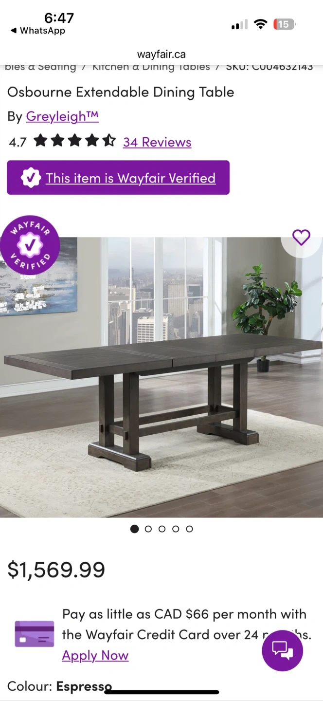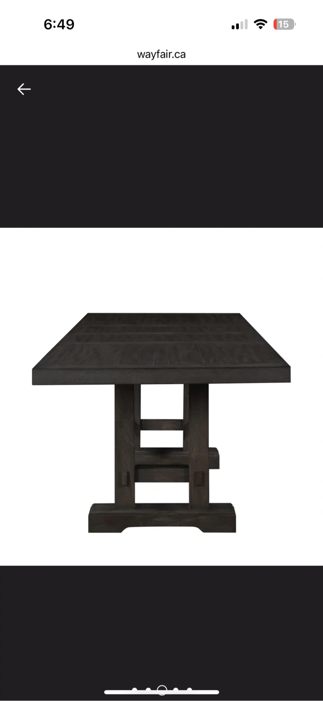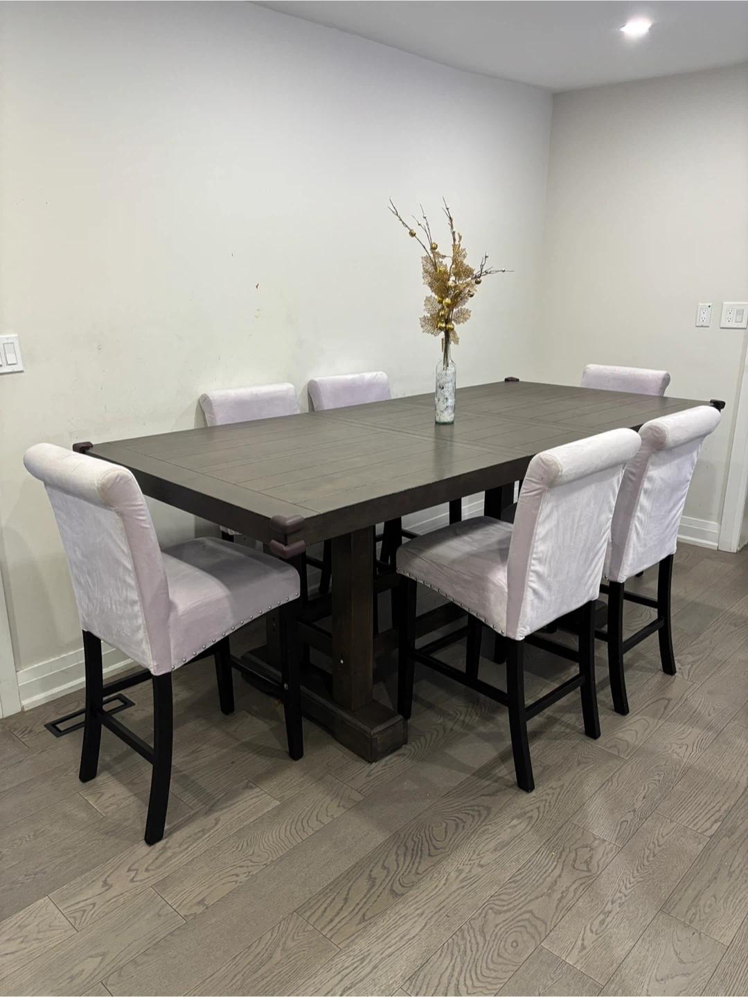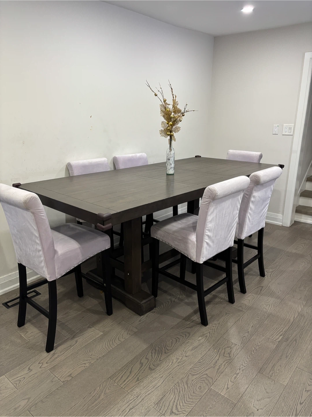 Selling a wayfair dining table with six chairs. The table has a dark wood finish and the chairs are upholstered in a light purple fabric.