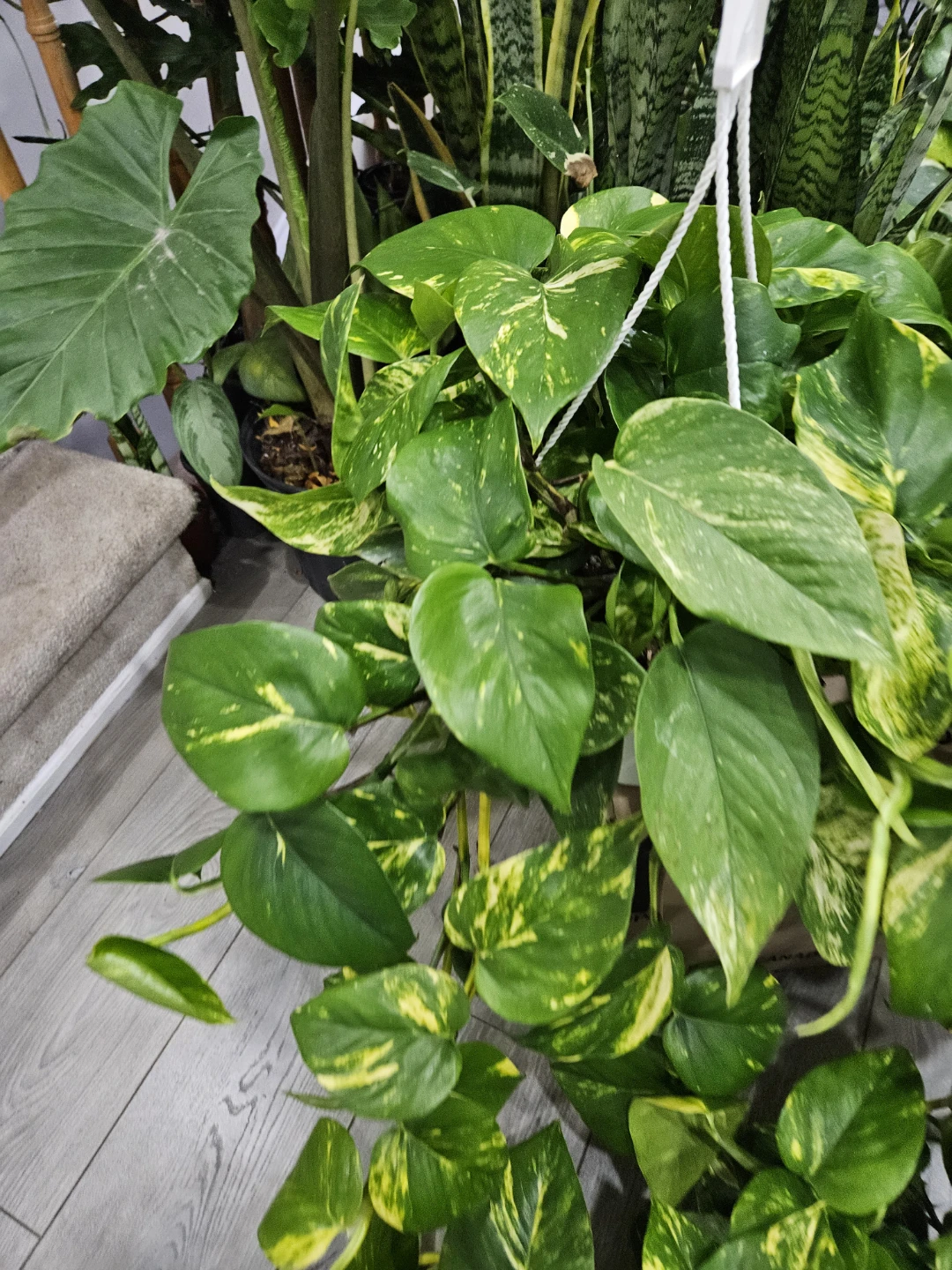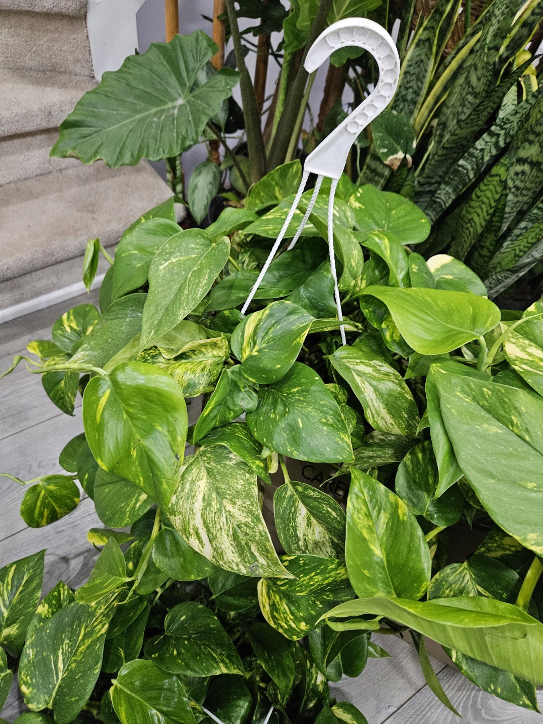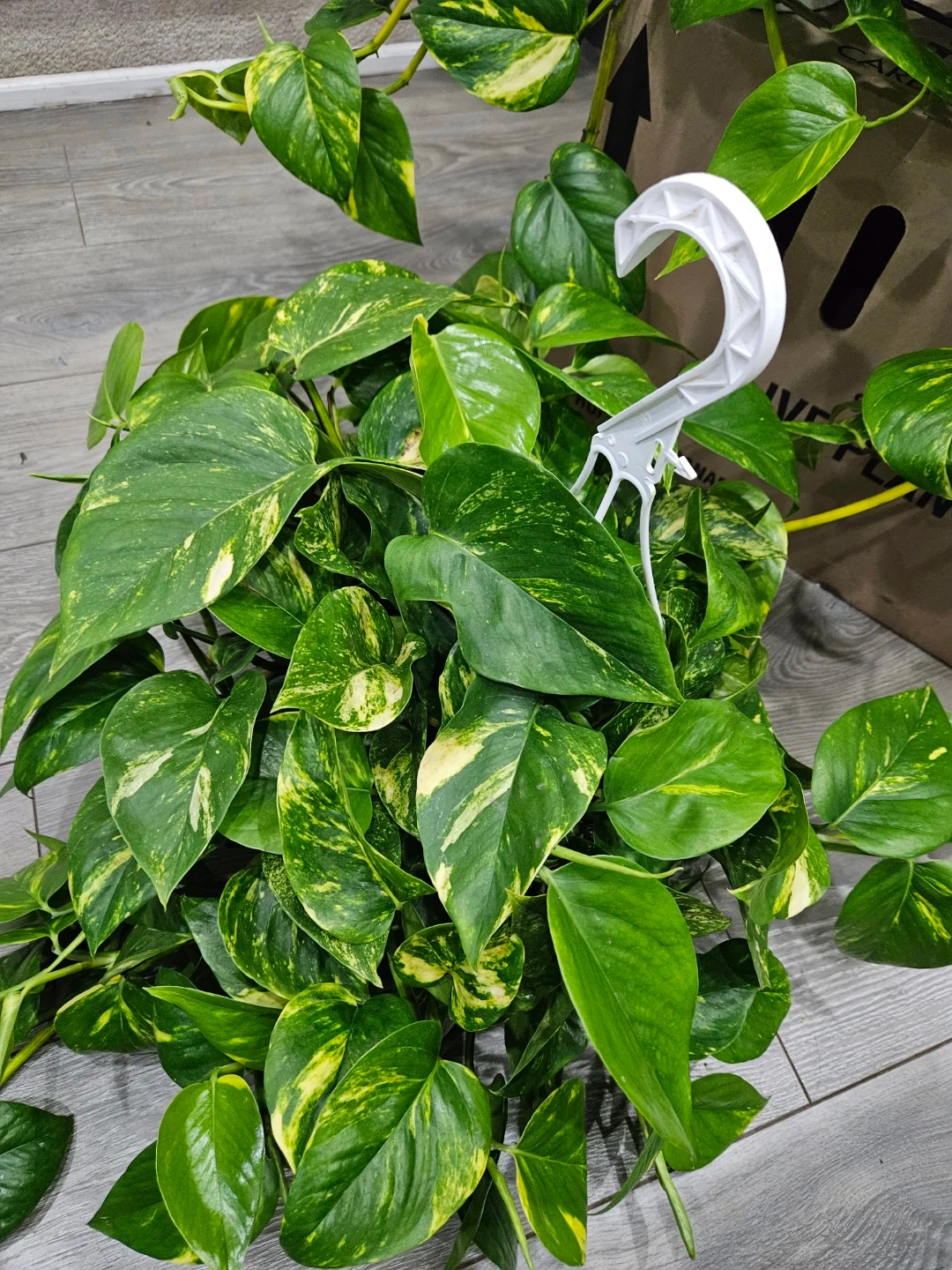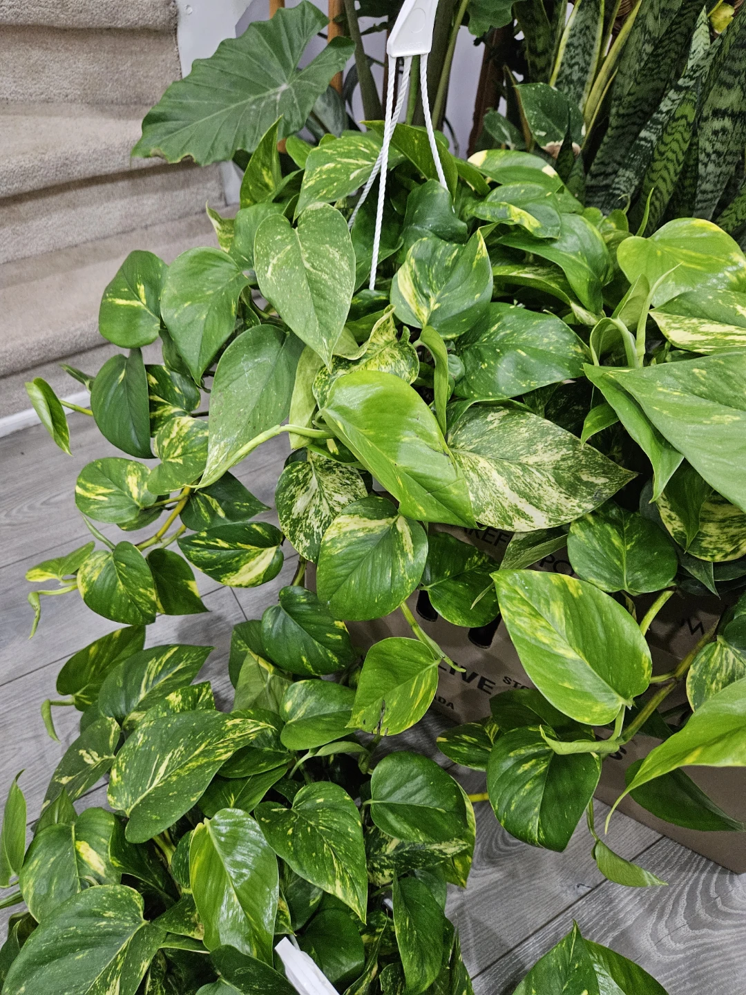 Selling a beautiful golden pothos hanging plant. It's a great way to add some greenery to your home. This plant features vibrant green leaves with striking yellow variegation.