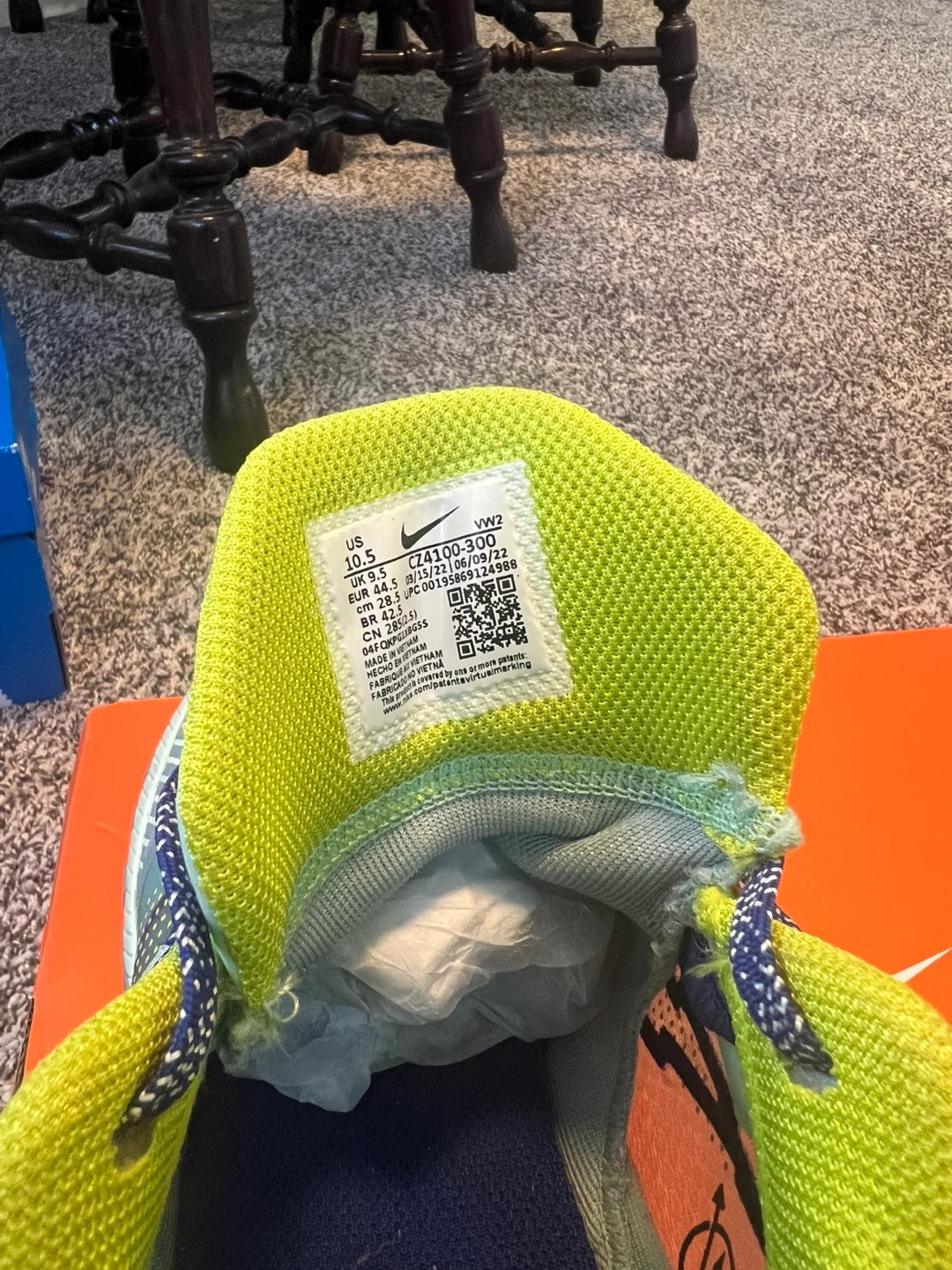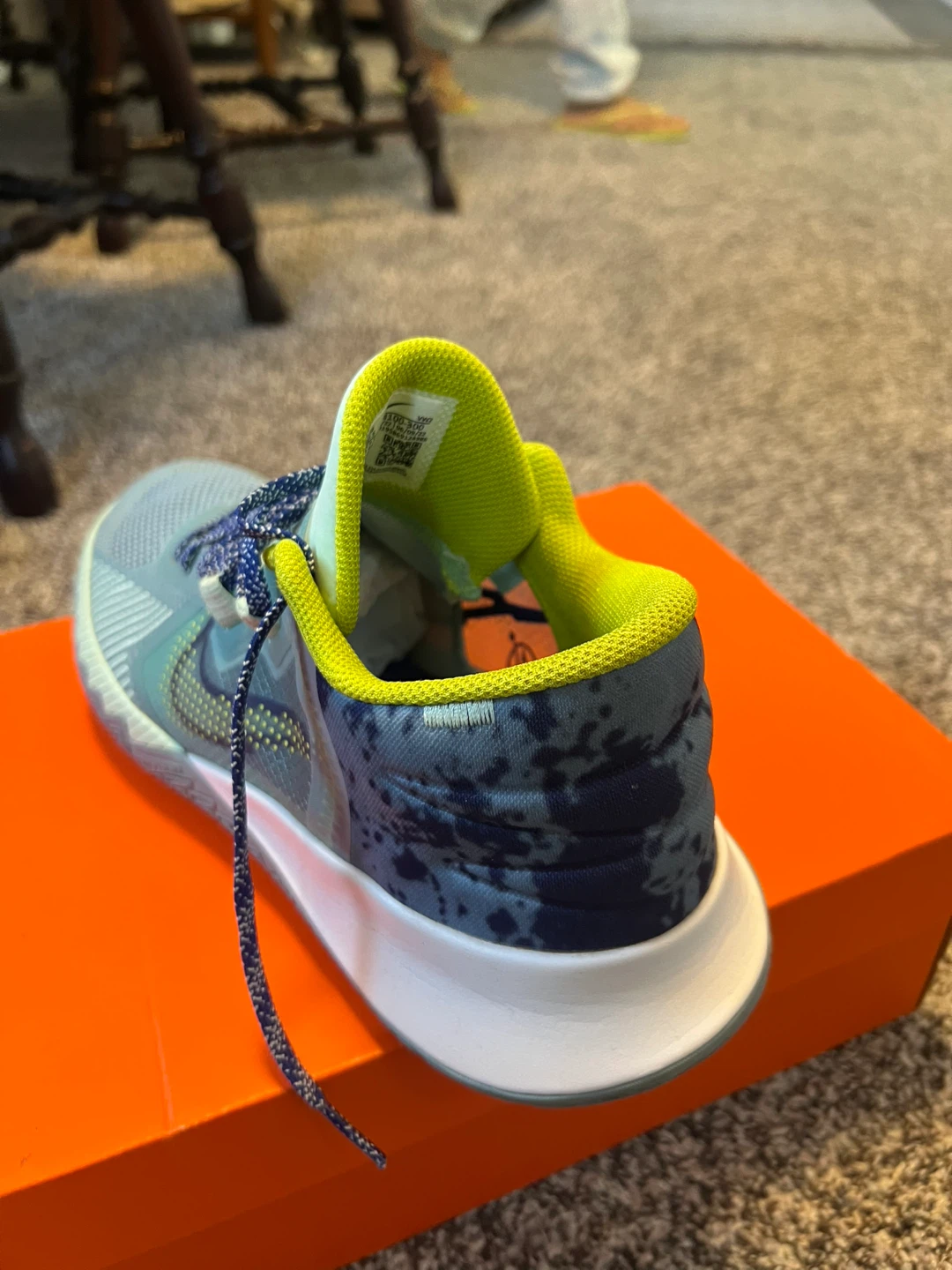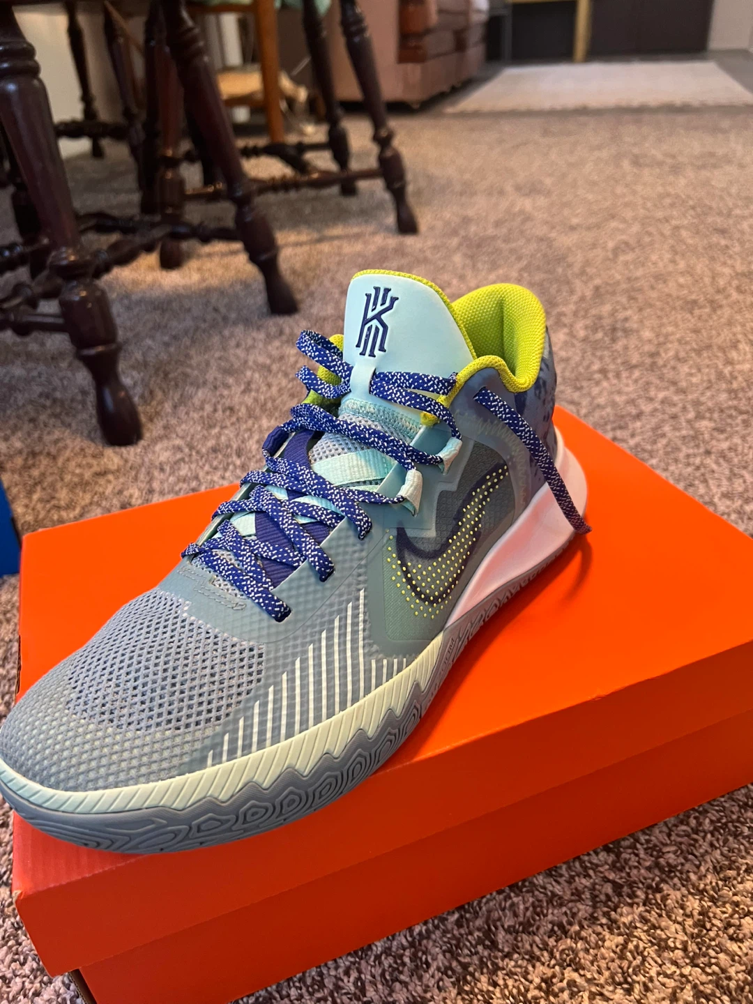 Selling a pair of Nike Kyrie Flytrap 6 basketball shoes in US size 10.5. They're in great shape and ready for the court or casual wear. The shoes feature a unique blue and green colourway with a distinctive pattern on the heel. Don't miss out!