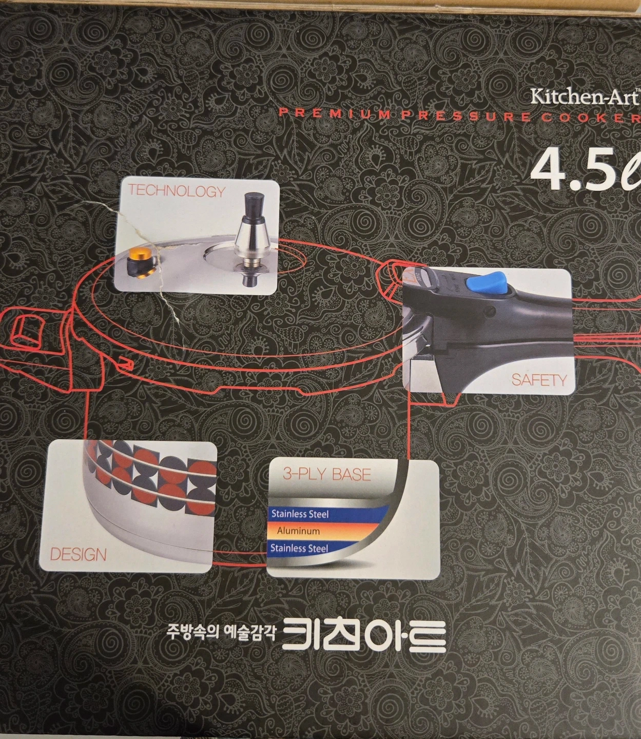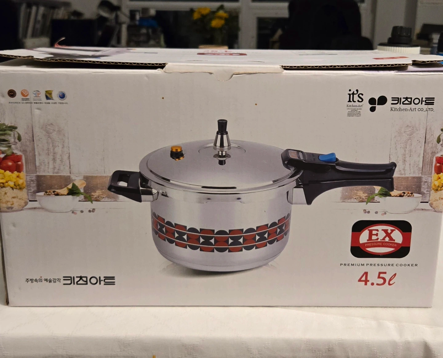 Selling a Kitchen-Art premium pressure cooker with a 4.5L capacity! It features a 3-ply base made with stainless steel and aluminum for even heat distribution. The design incorporates safety technology