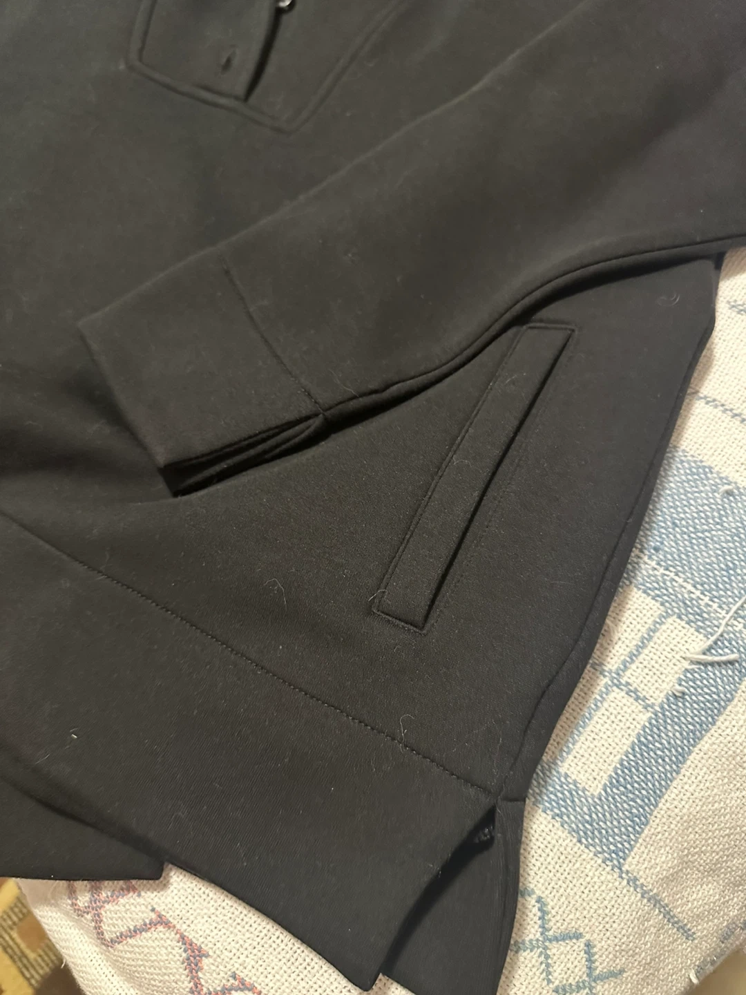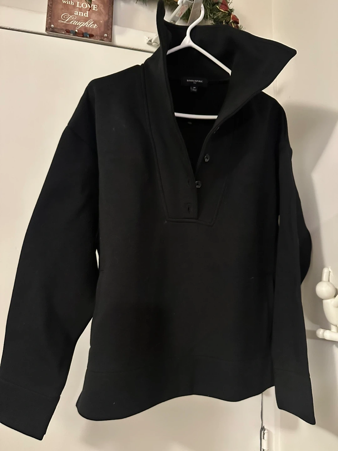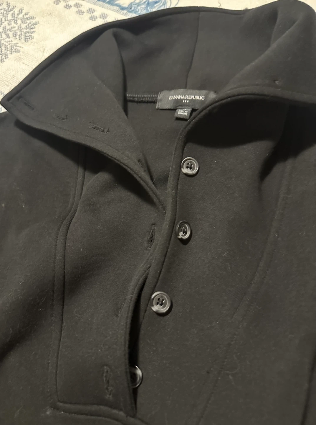 Selling a Banana Republic black pullover in size medium. It features a unique collar and button-up design. The material is comfortable and in great condition!