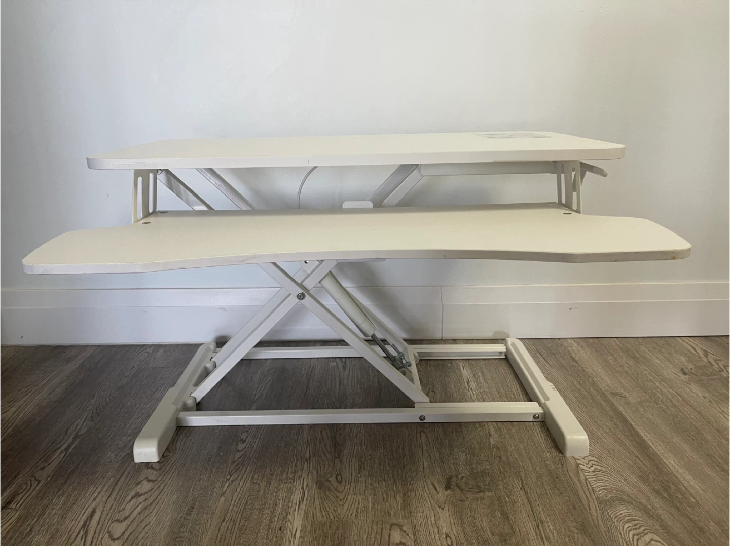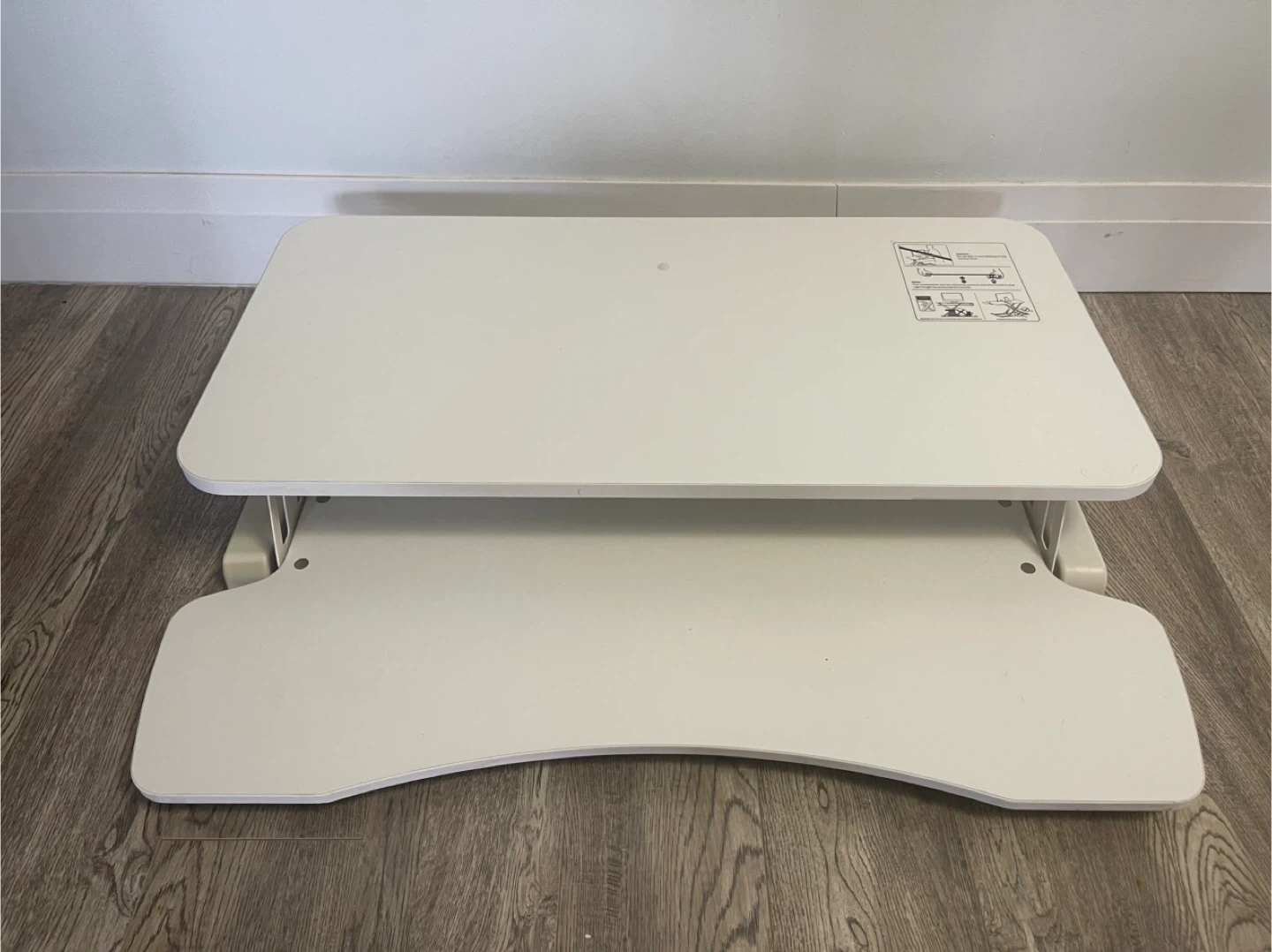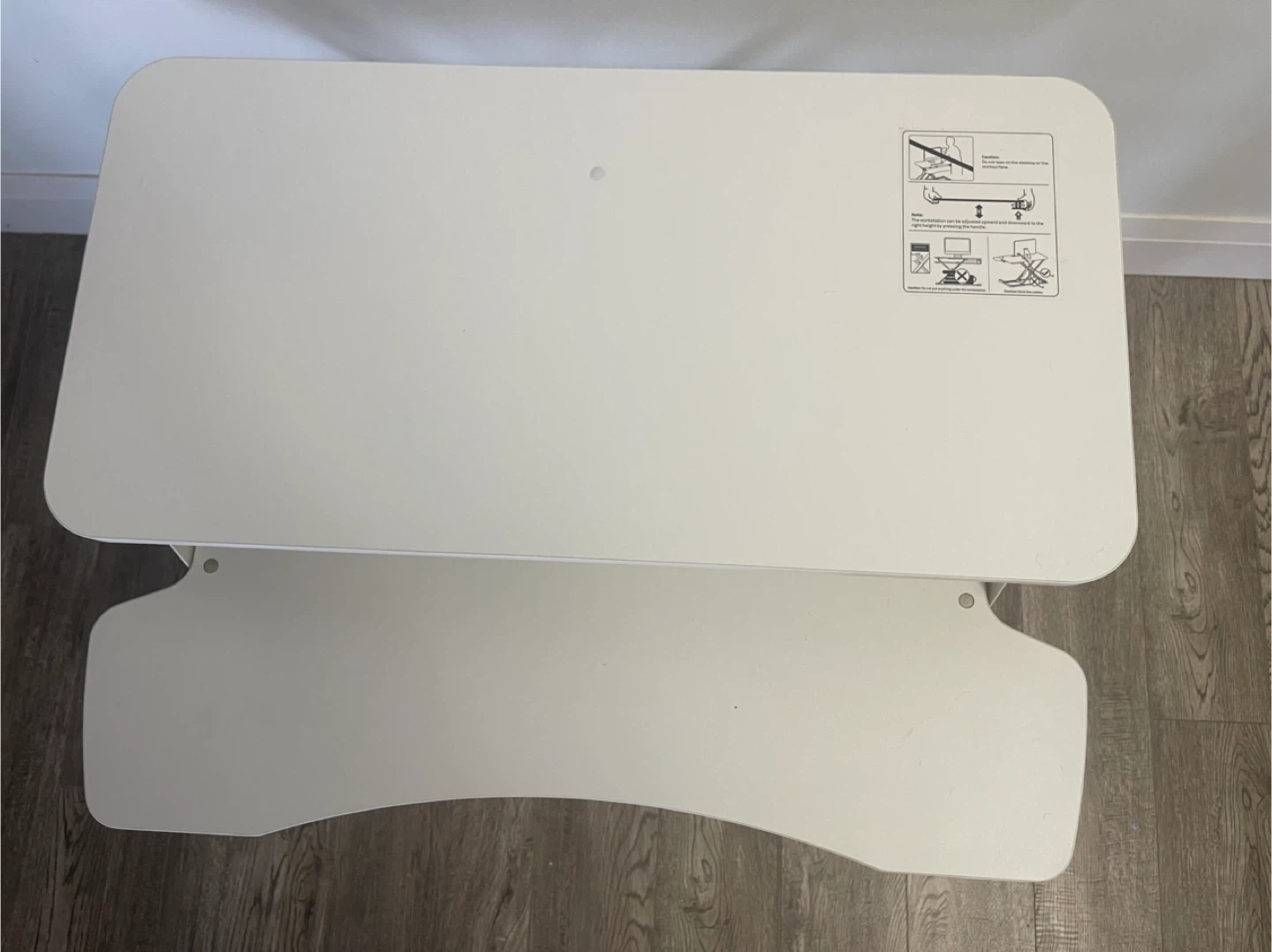 Selling a handy adjustable standing desk in white! It's perfect for working from home and easily adjusts to your preferred height. It's in great shape and ready for a new workspace
