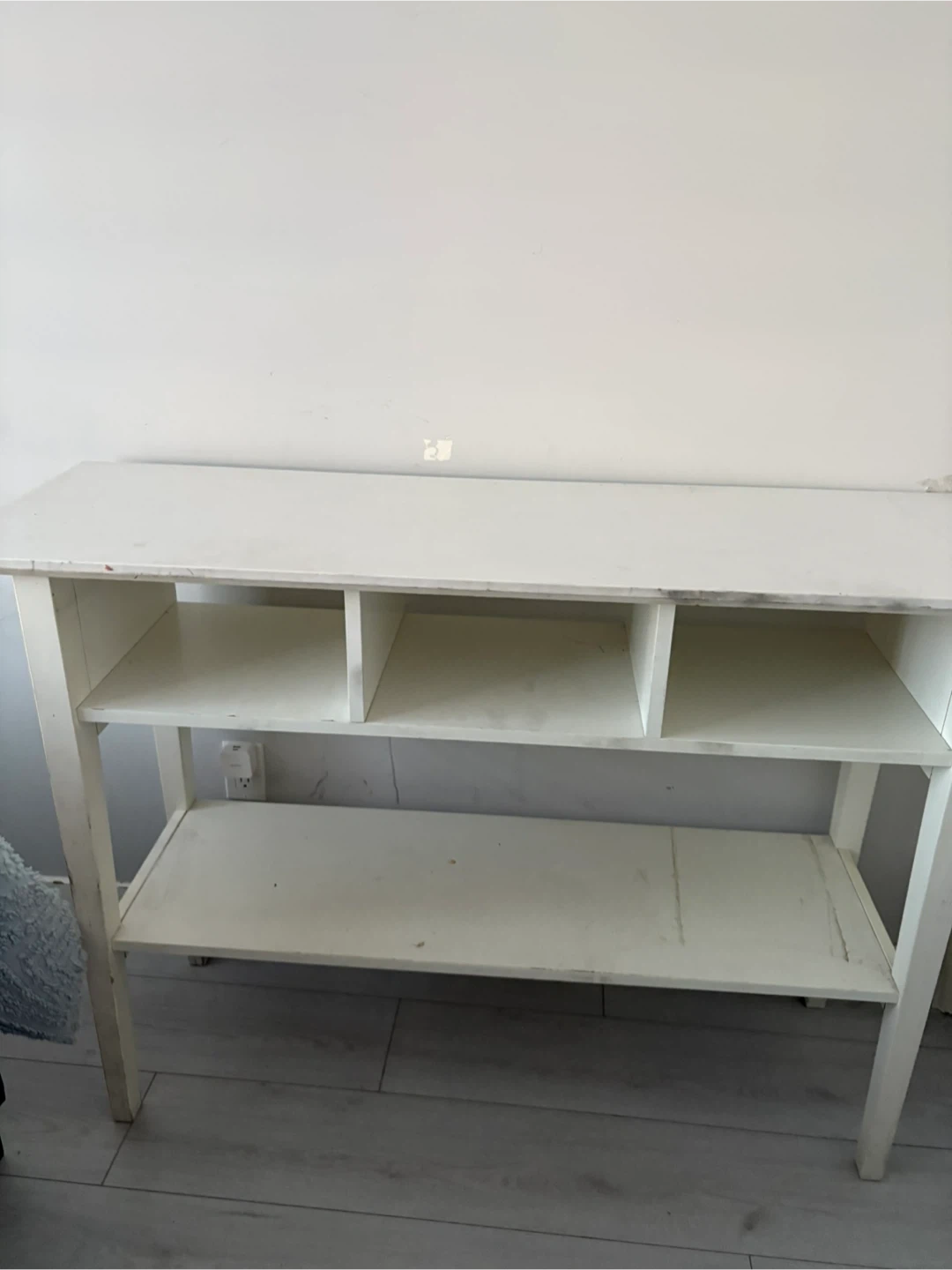 Selling a white console table that would be great for an entryway or living room! It has some wear and tear, but it still has lots of life left. There are three open shelves on top, and one long shelf at the bottom.