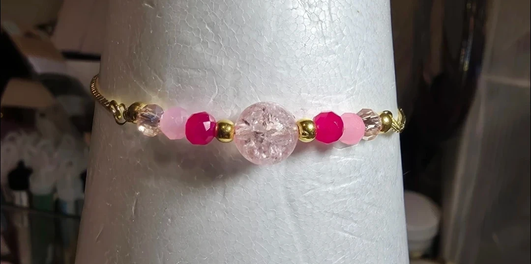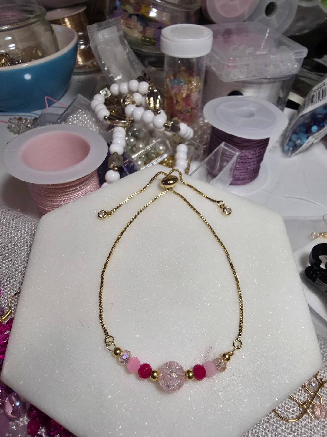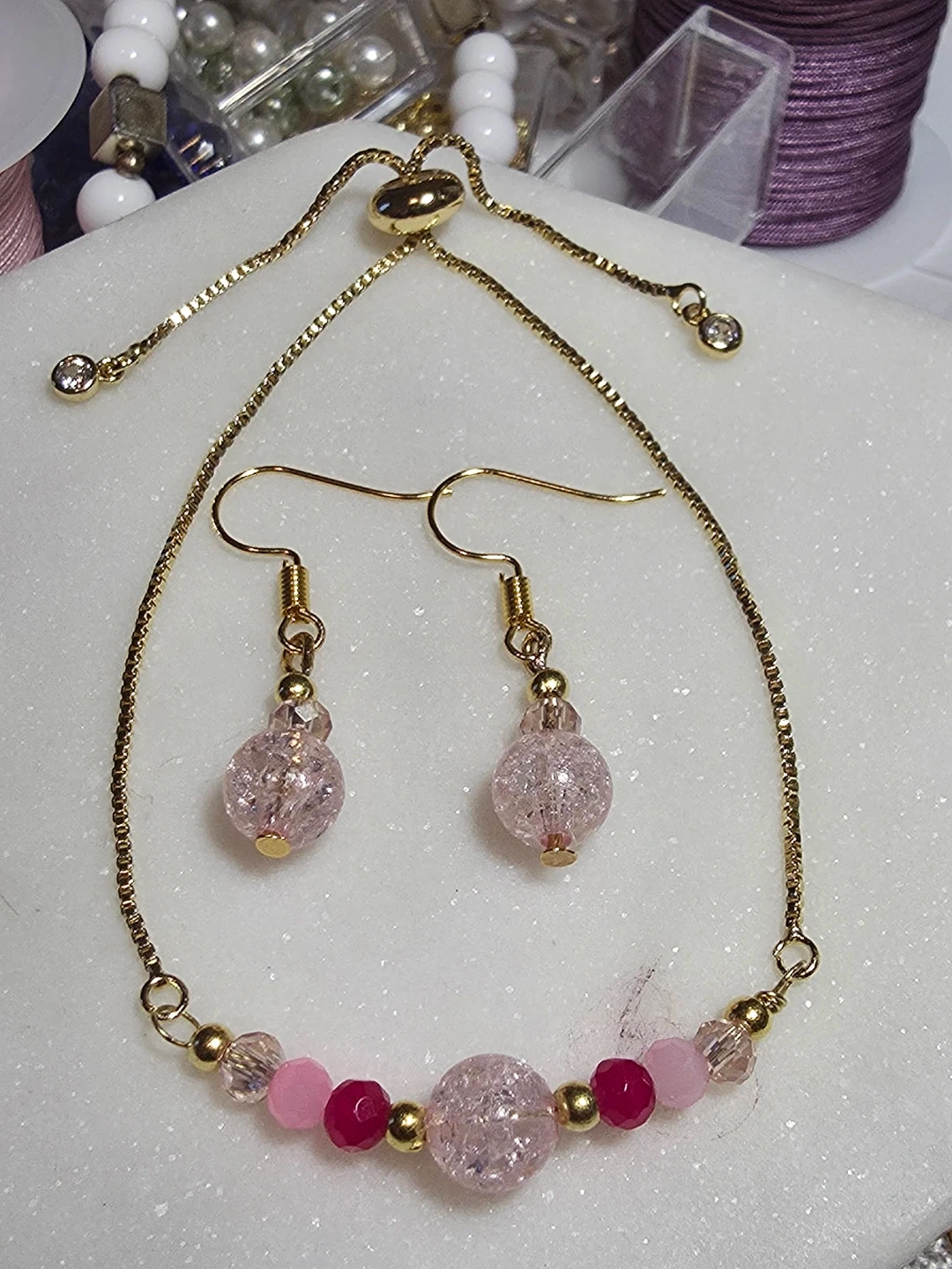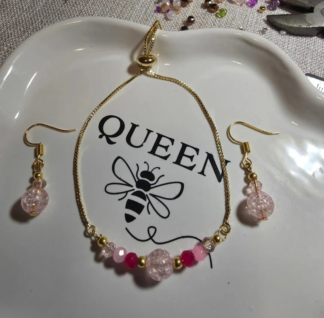 The bracelet made of a gold chain with pink and clear beads. The earrings have a matching design with a pink and gold beads. Can be adjusted to the size you prefer.