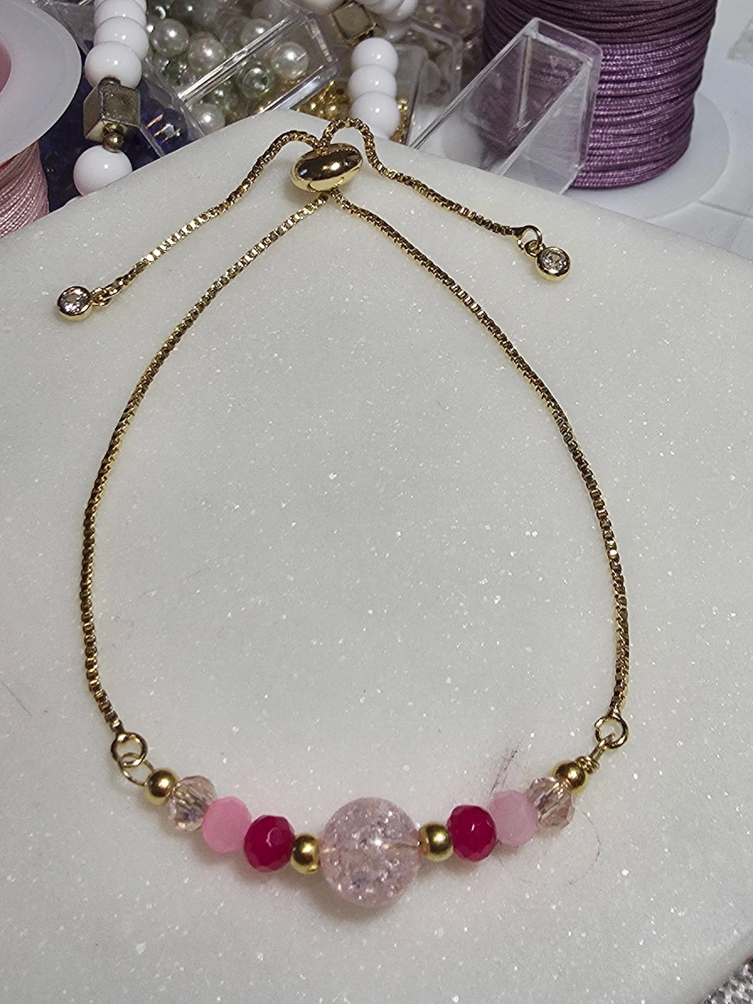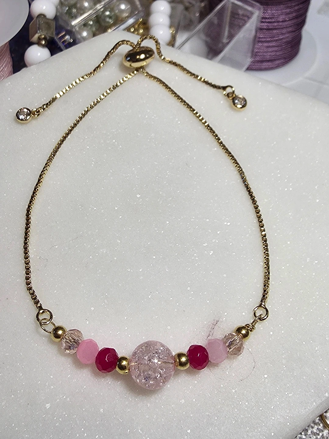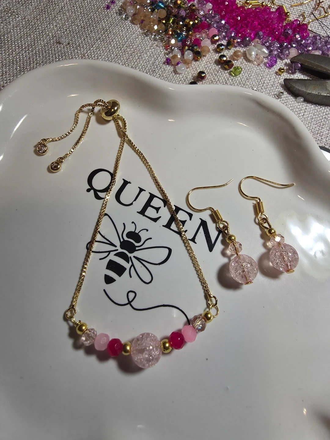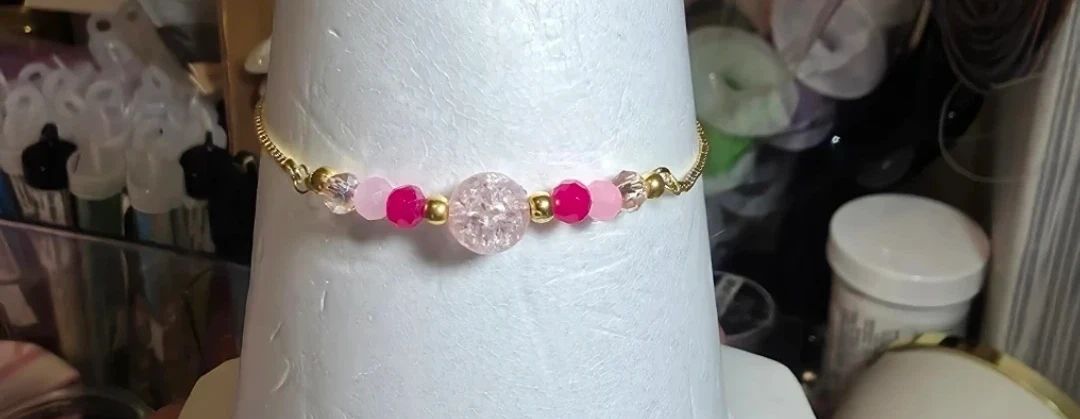 The bracelet made of a gold chain with pink and clear beads. The earrings have a matching design with a pink and gold beads. Can be adjusted to the size you prefer.