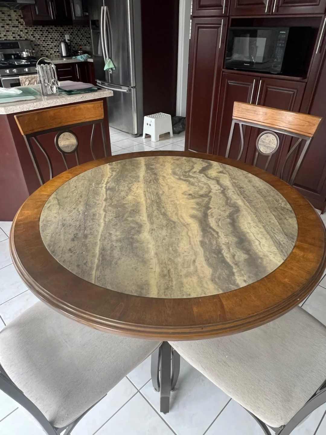 Selling a round dining table with four matching chairs. The table has a unique patterned top and a sturdy wooden frame. The chairs are upholstered and have a decorative back.