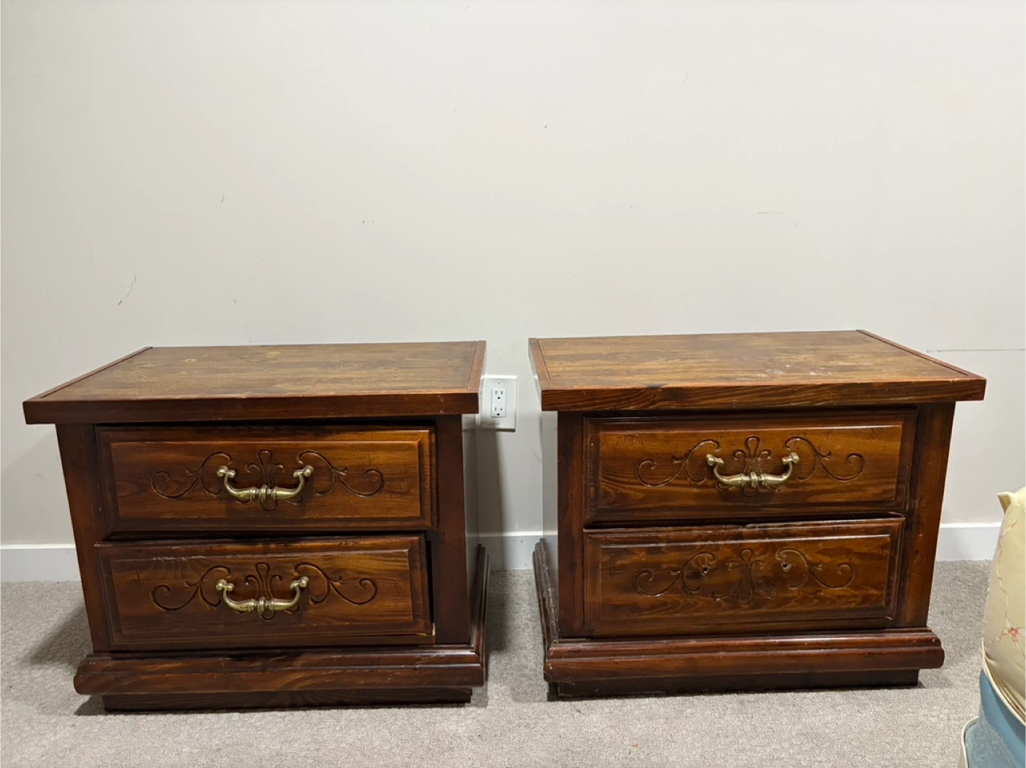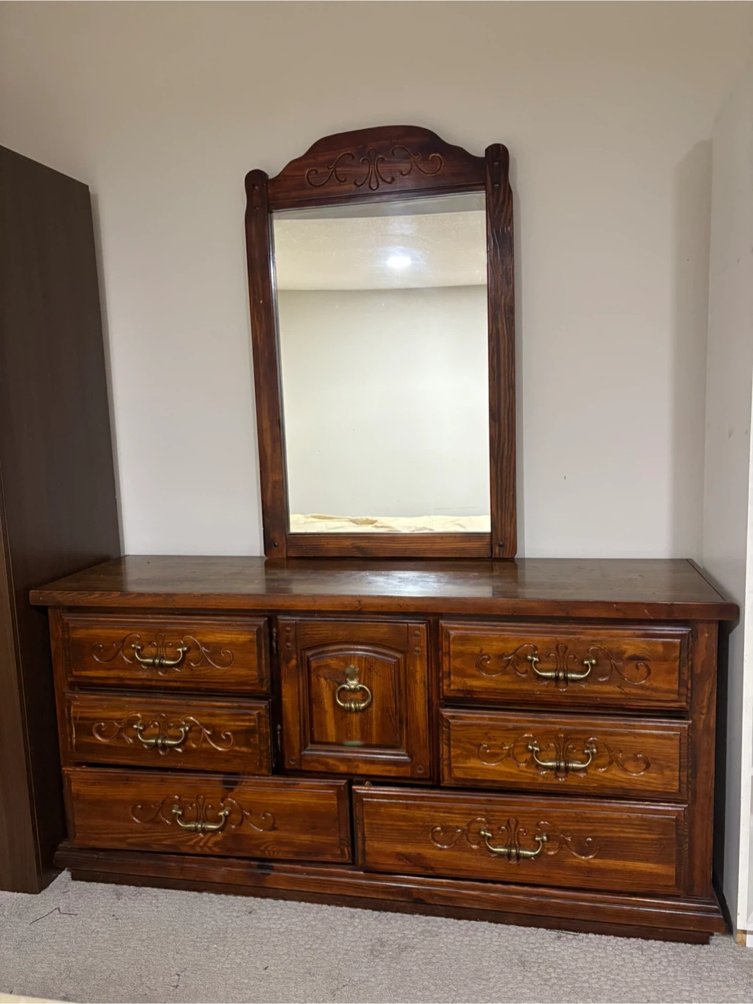 Selling a beautiful vintage bedroom set, including a dresser with a mirror and two matching nightstands. These pieces have a lovely wood finish and intricate detailing, adding a touch of classic elegance to any bedroom. They're in good condition and ready to bring charm to your home!