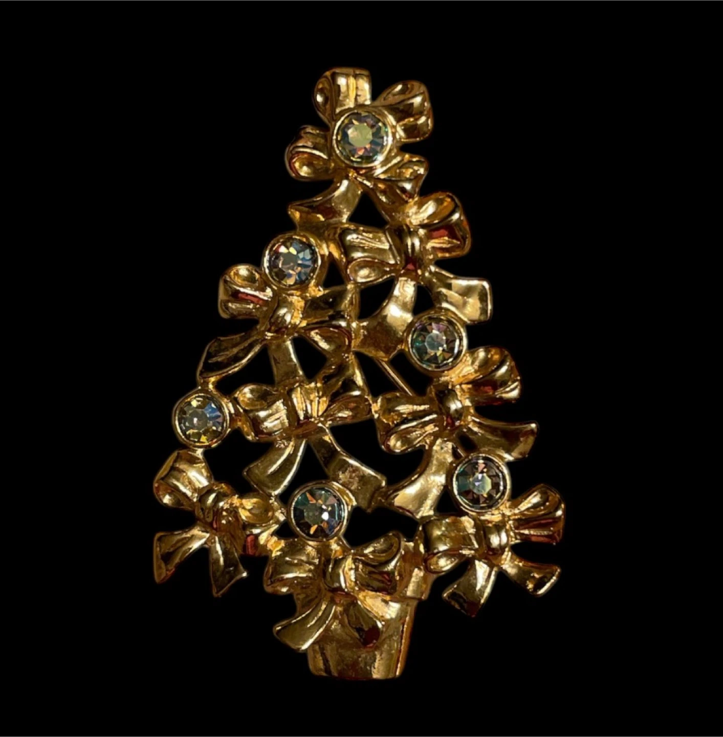 Vintage 1992 Avon gold-tone Christmas tree brooch with aurora borealis blue rhinestone bow accents. This pin is approximately 2.25 inches tall. Brand new/no box. Pick up and cash only.