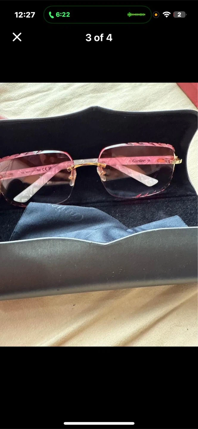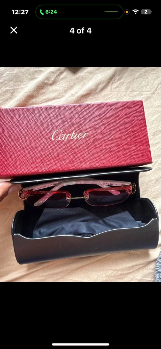 Selling a pair of stylish Cartier rimless sunglasses. They come in a lovely pink color and include the original case for protection. Perfect for adding a touch of elegance to any outfit!