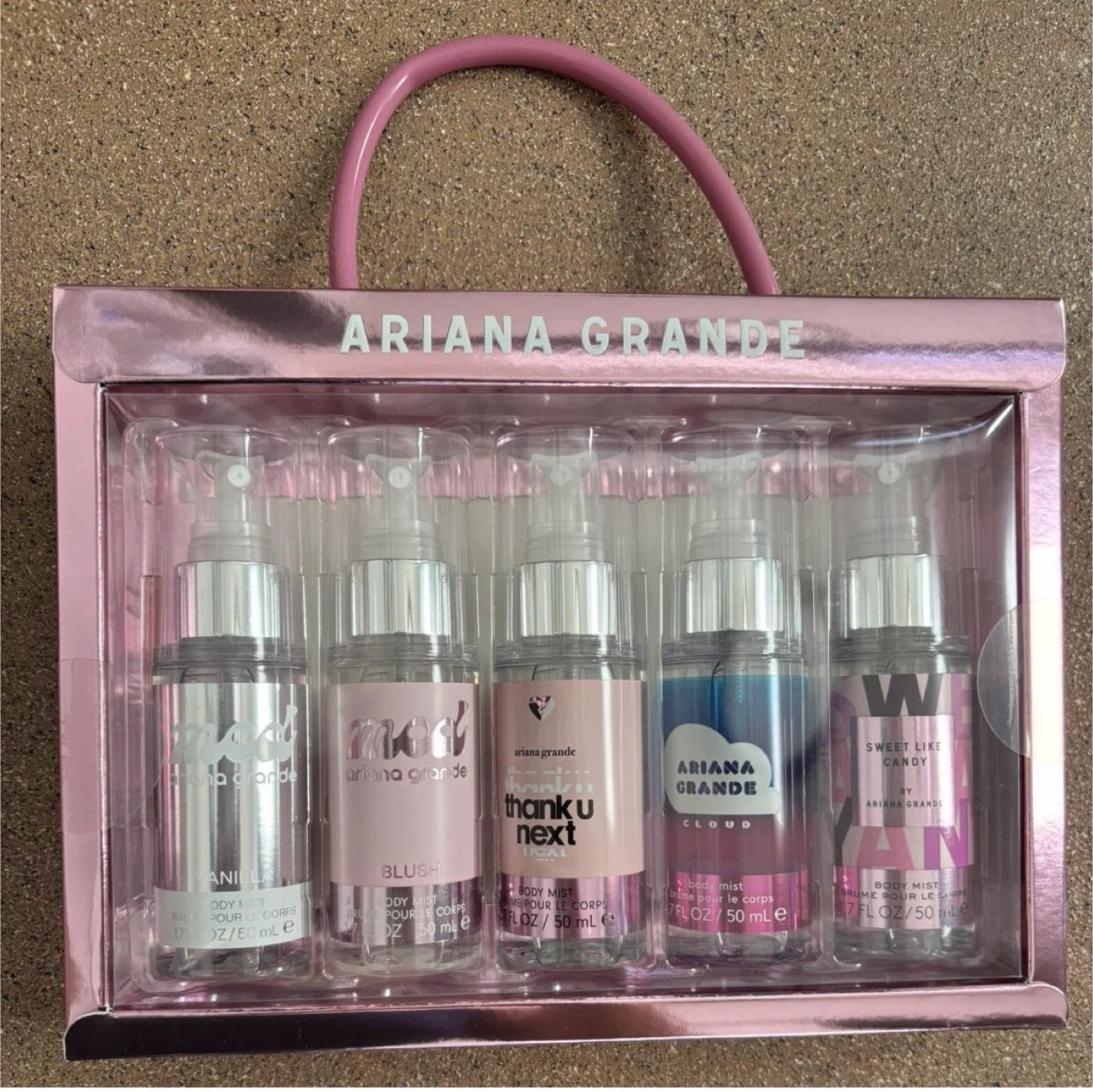 Selling a brand new Ariana Grande body mist set! This set includes five different scents: Mod Vanilla, Mod Blush, Thank U Next, Cloud, and Sweet Like Candy. Each bottle contains 1.7 fl oz / 50 mL of body mist. Perfect for trying out different fragrances!
