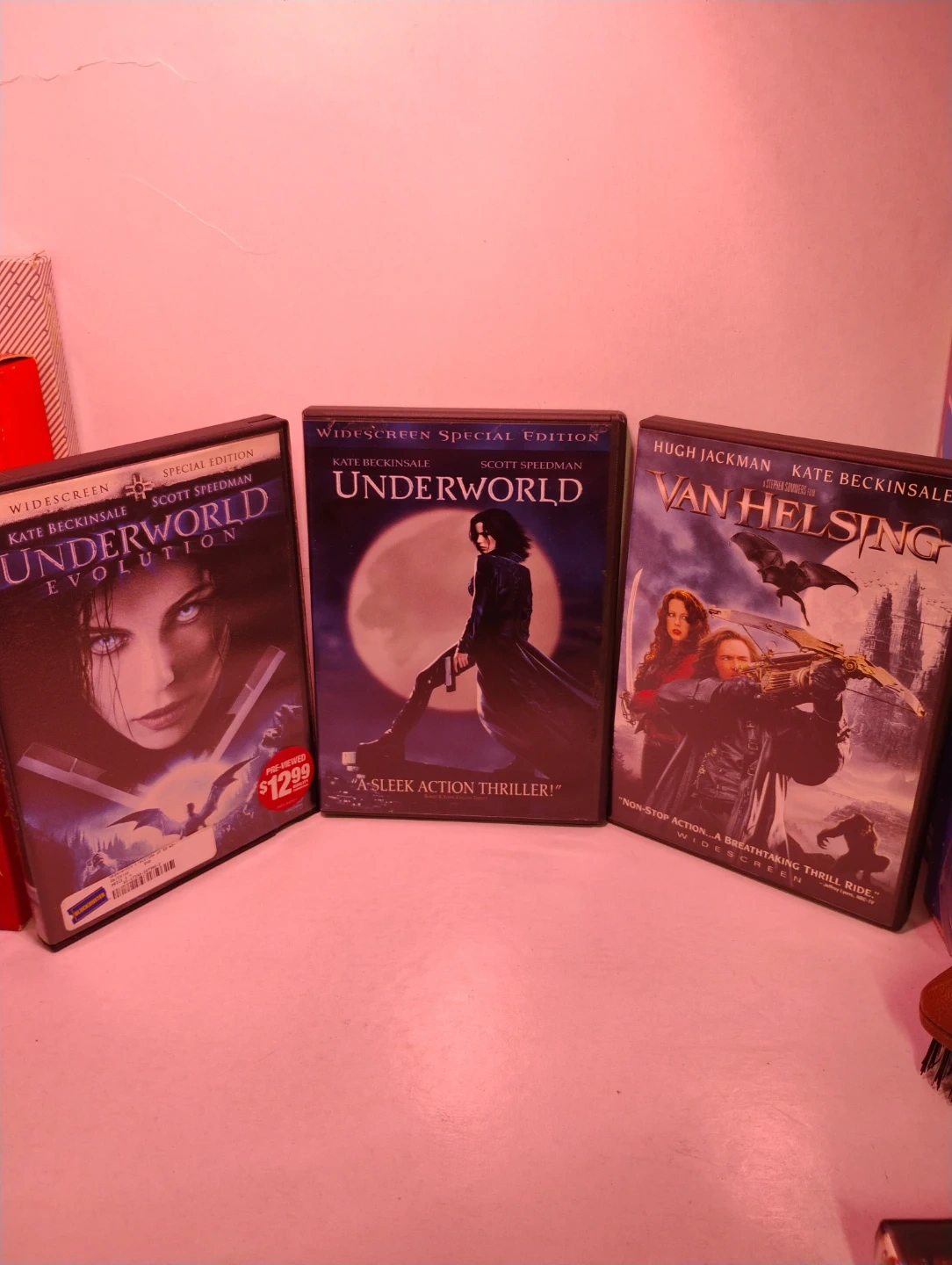 Selling a set of three widescreen special edition DVDs: Underworld, Underworld Evolution, and Van Helsing! All starring Kate Beckinsale.