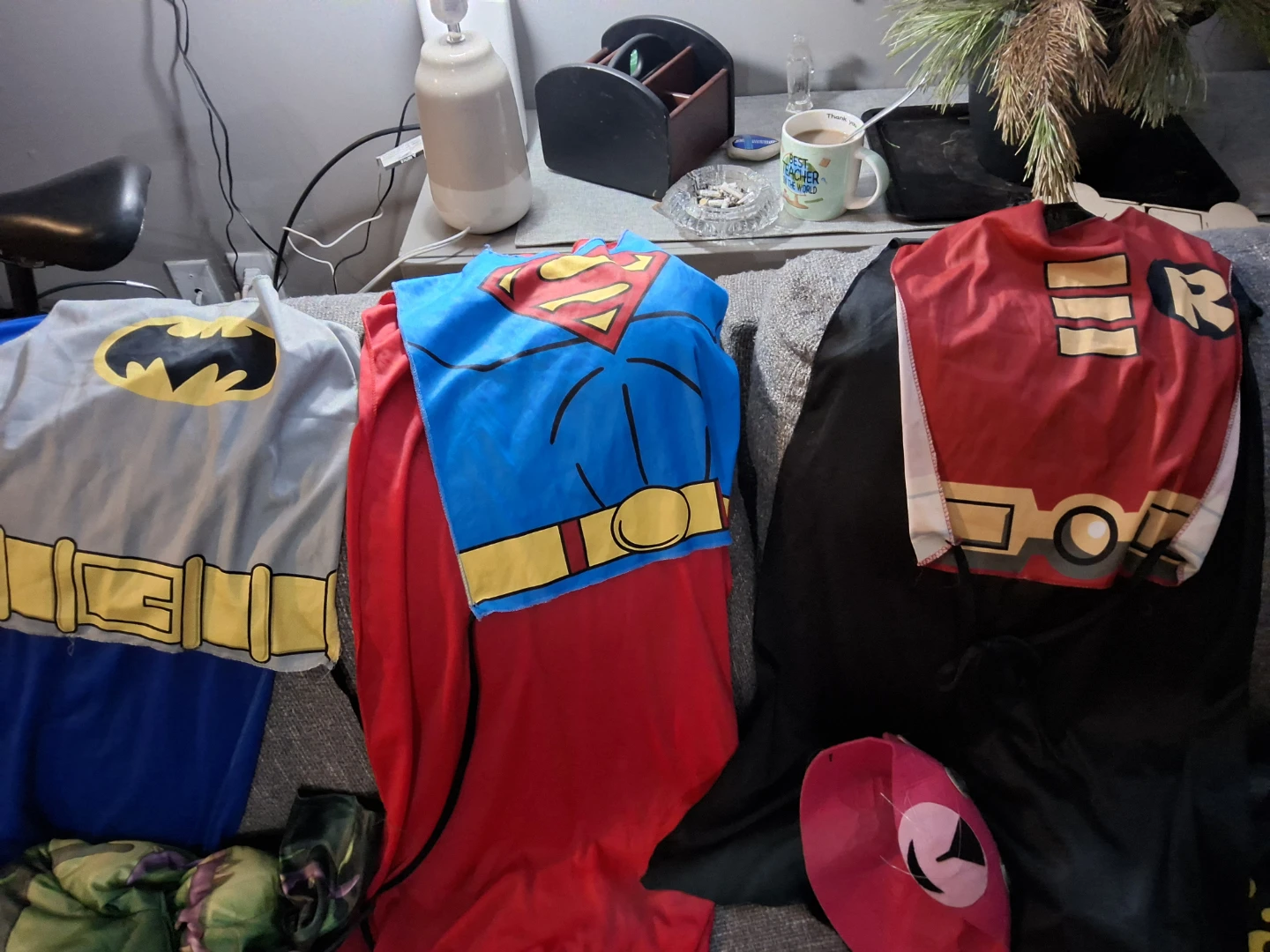 Selling a set of kids' superhero costumes! Includes Batman, Superman, Robin, and Hulk outfits. Great for dress-up or Halloween!