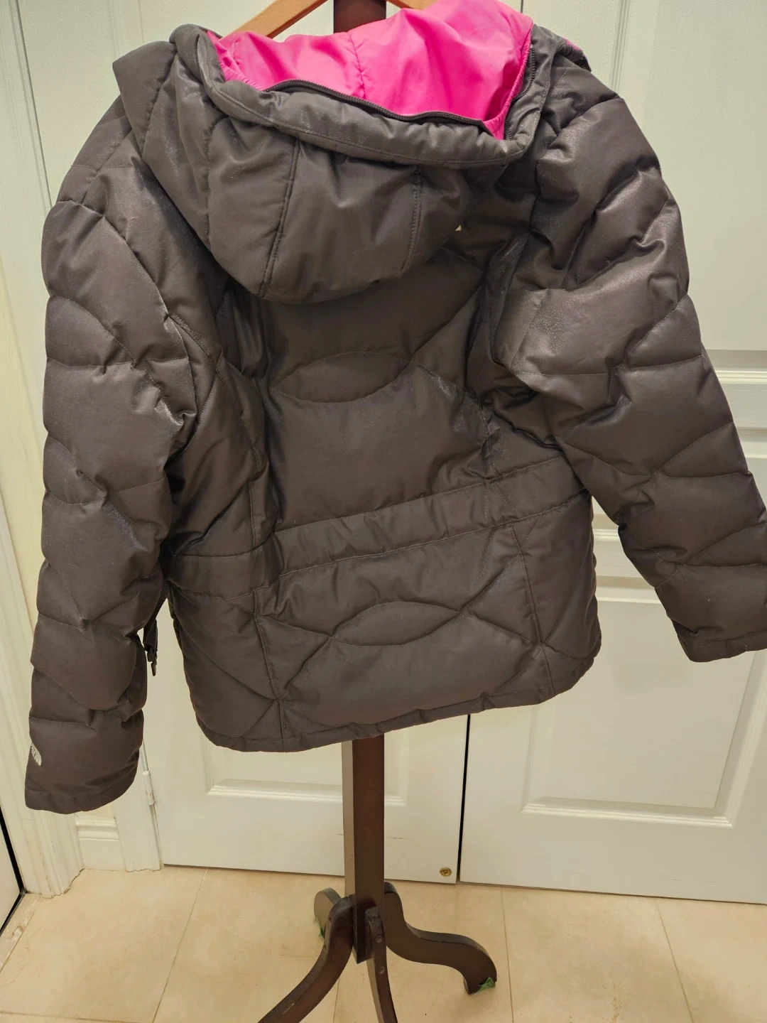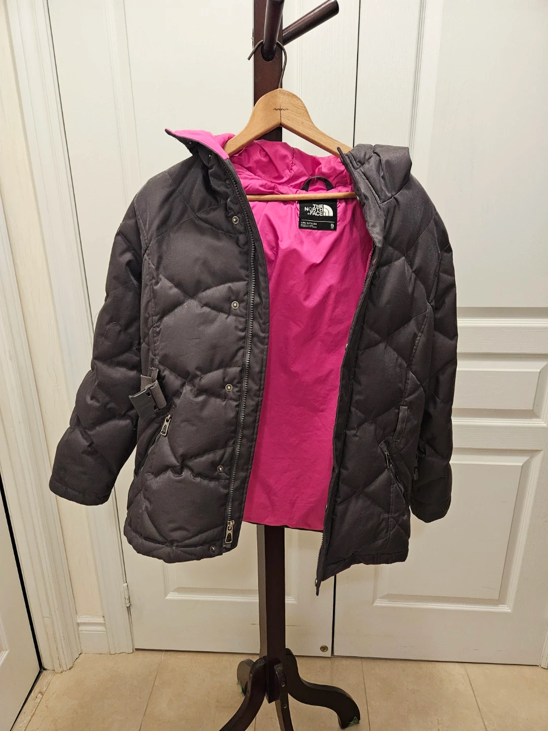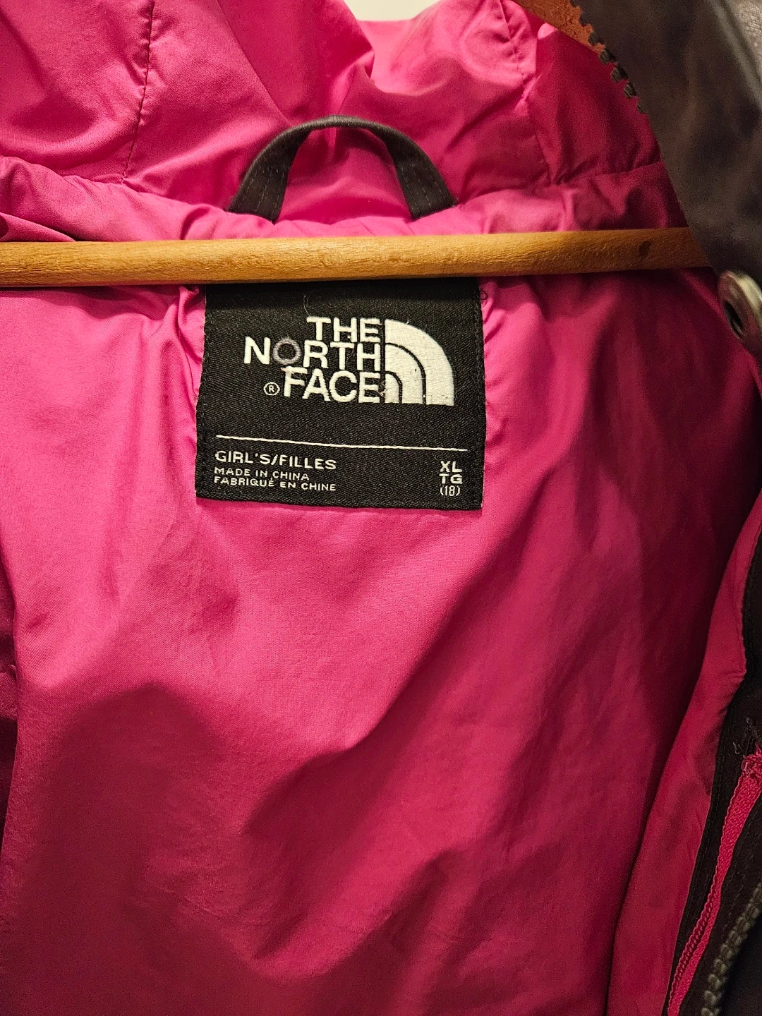 Selling a The North Face girl's puffer jacket in size XL (18). The jacket is in great condition and features a stylish design with a grey exterior and a bright pink interior lining. It's perfect for keeping warm during the colder months!