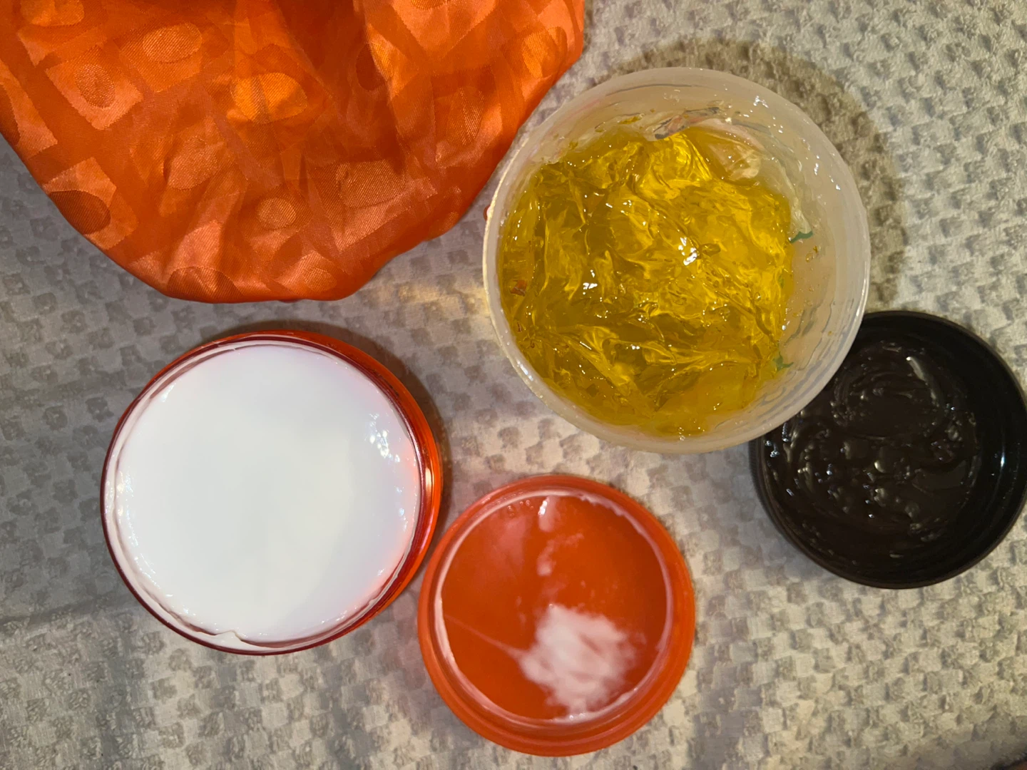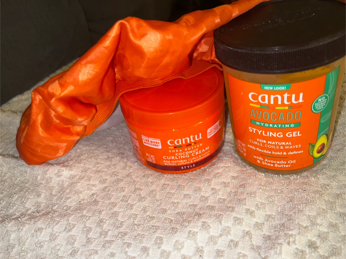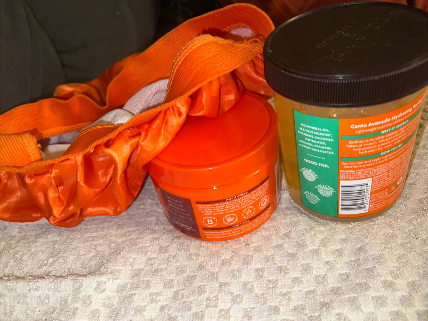 Bundle of Cantu hair products and a preloved bonnet I’ve replaced. The Curling Cream is NEW and the Styling Gel was used once or twice