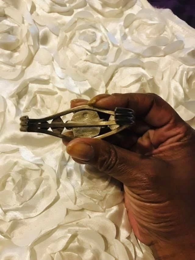 This is a turquoise stone cuff bracelet. It has a beautiful design with an oval turquoise stone in the center and two diamond-shaped turquoise stones on either side. The metal has an antique look to it.