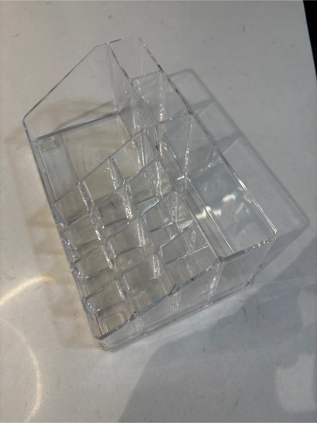 Selling a clear acrylic makeup organizer! It's perfect for keeping your cosmetics neat and tidy. It has multiple compartments for different sized items, like lipstick, brushes, and palettes. It's in great condition and ready for a new home on your vanity