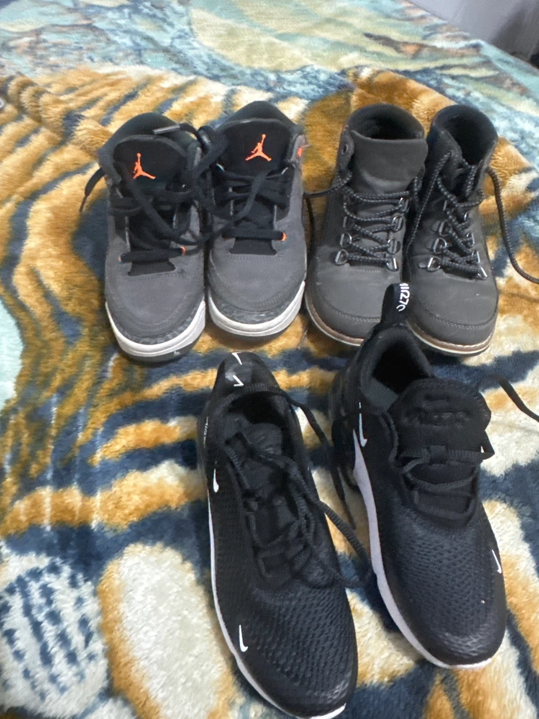 Selling a set of assorted kids' shoes. Includes a pair of Jordan sneakers, a pair of black Nike sneakers, and a pair of black boots. They're in good condition with some signs of use.