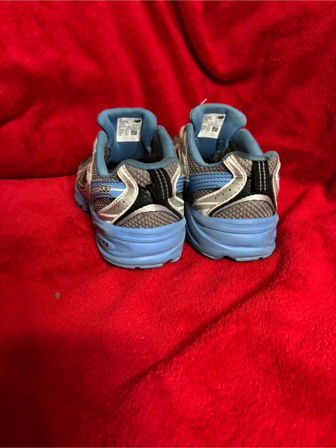 Selling a pair of New Balance 530 kids shoes. They're in great condition and perfect for everyday wear. The shoes feature a light blue, silver, and black color scheme. They're comfortable and stylish for your little one!