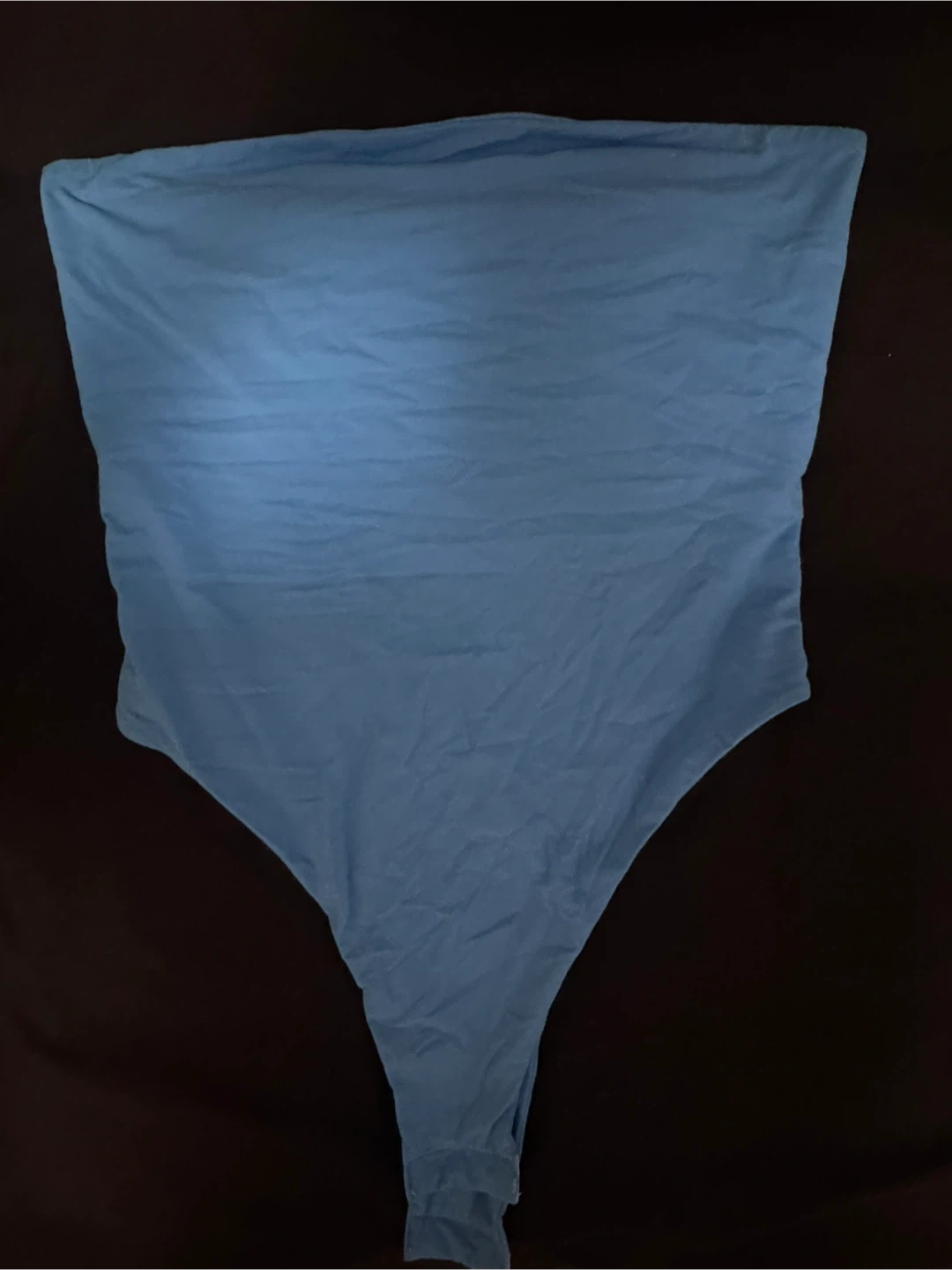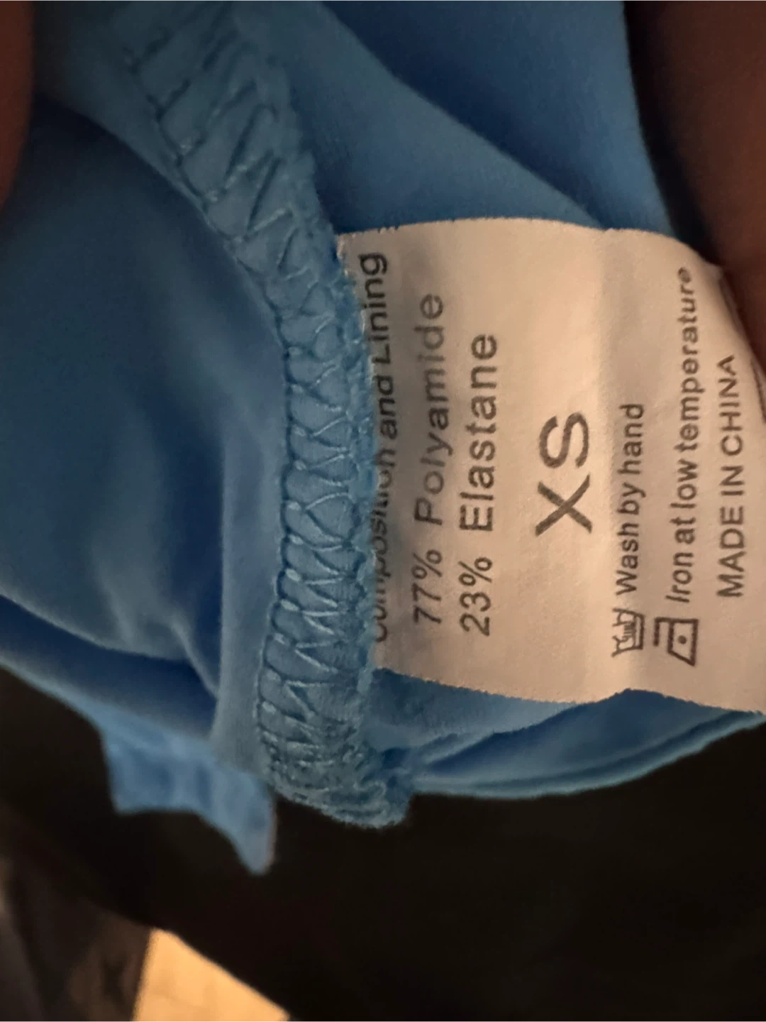 Here's a light blue bodysuit in size XS! The material is 77% Polyamide and 23% Elastane. It's recommended to wash by hand and iron at low temperature