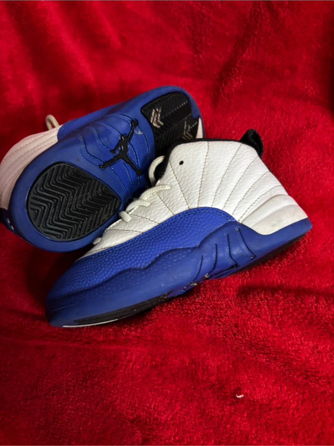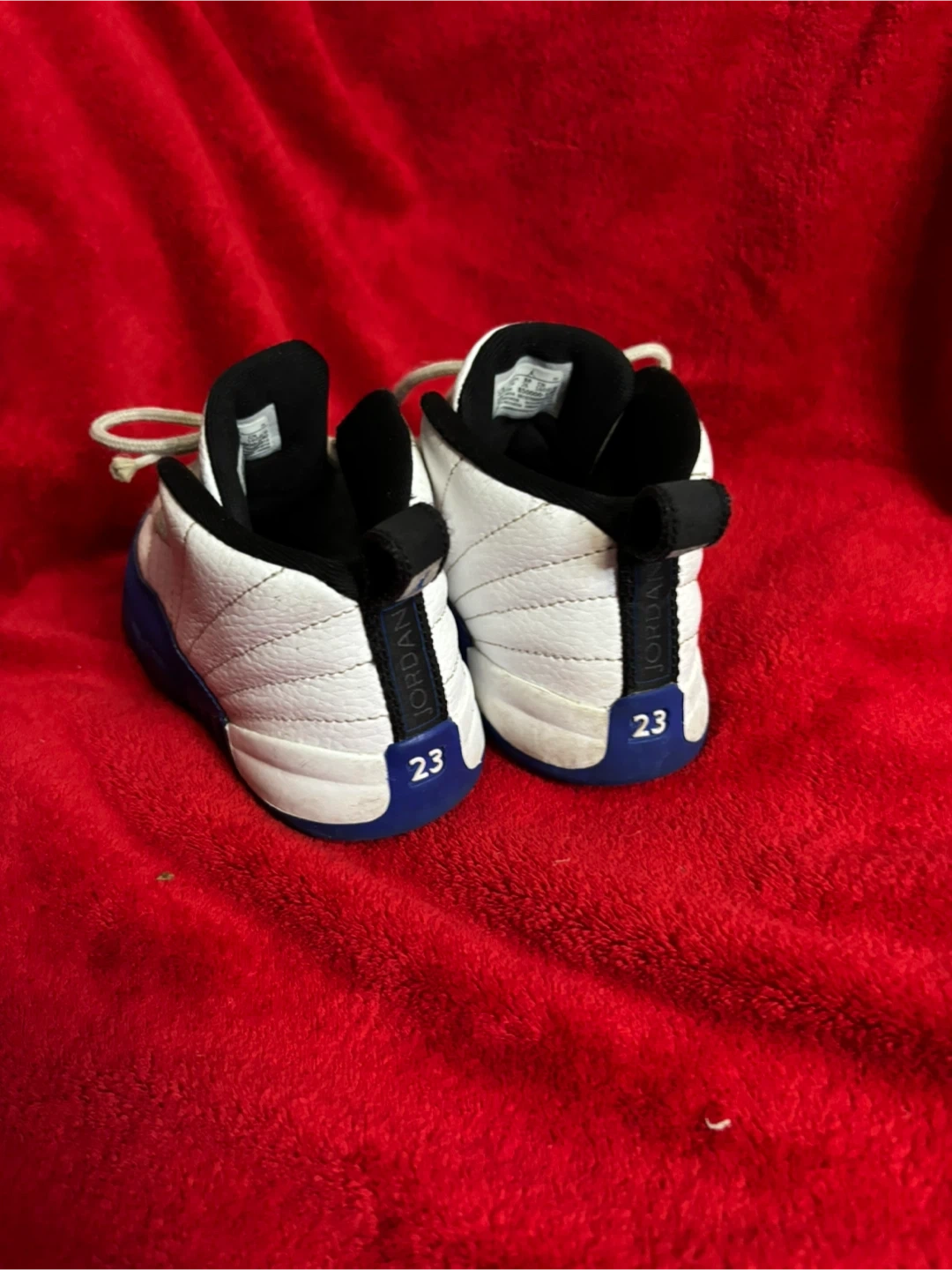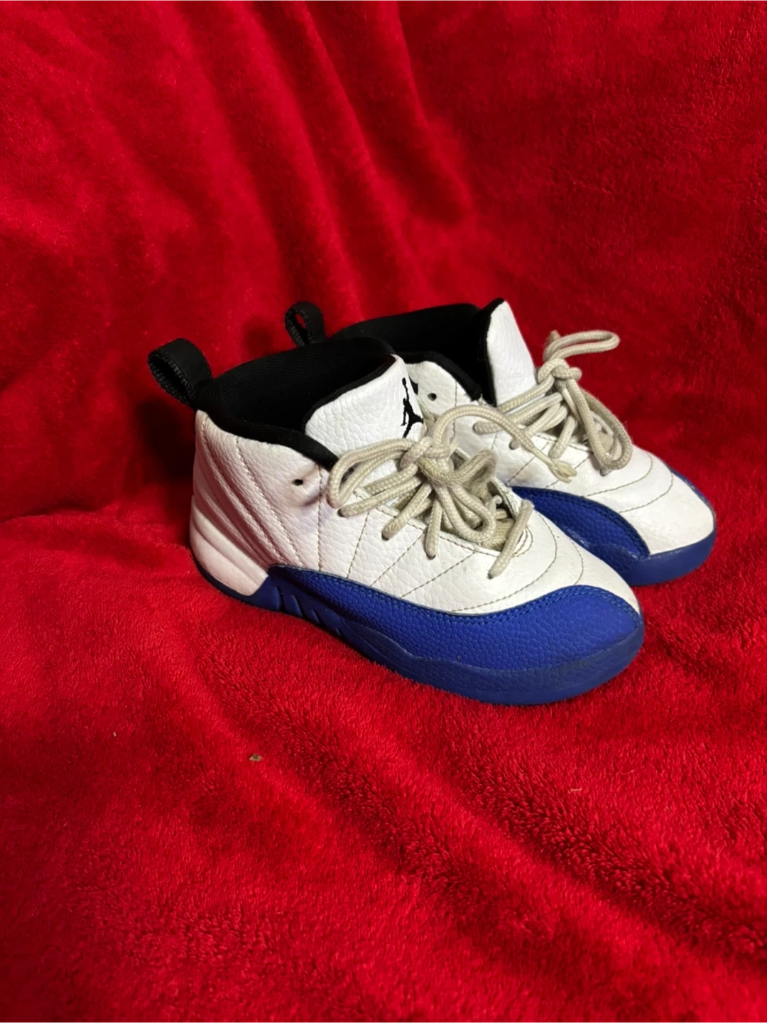 Selling a pair of Jordan 12 Retro toddler shoes in white and blue. They are in good condition and ready for a new little owner! Size is 5C.