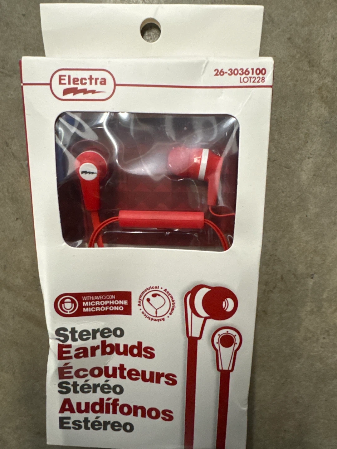 Selling a pair of Electra stereo earbuds in red! They feature neodymium magnets for stereo sound with powerful bass, and a microphone on the control. They are compatible with MP3, MAC/PC, stereo systems, CD players, gaming consoles and TVs. The design blocks outside noise, so you can focus on your music or game