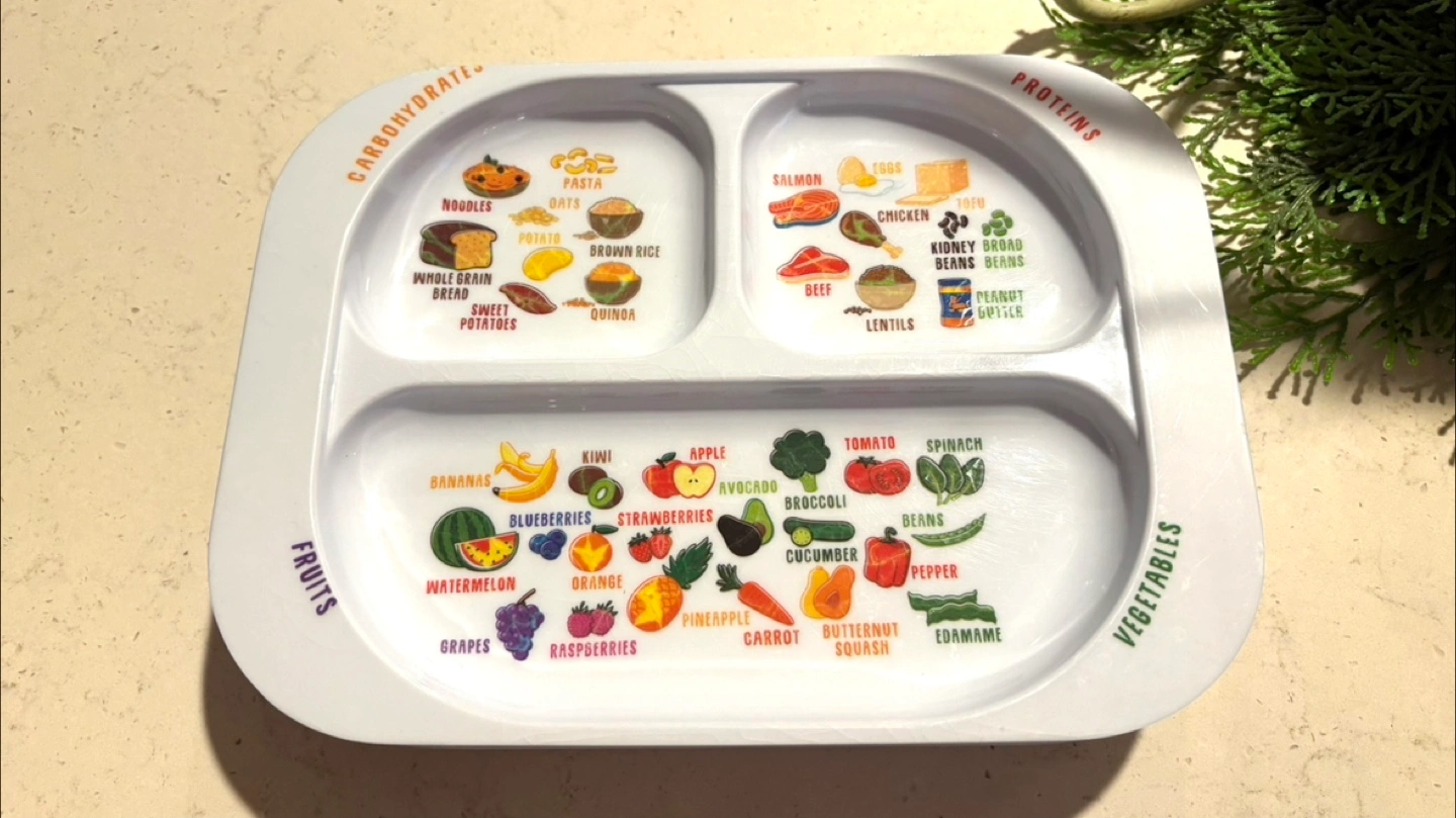 The plate is divided into sections for carbohydrates, proteins, fruits, and vegetables, with cute illustrations of different food options in each category.