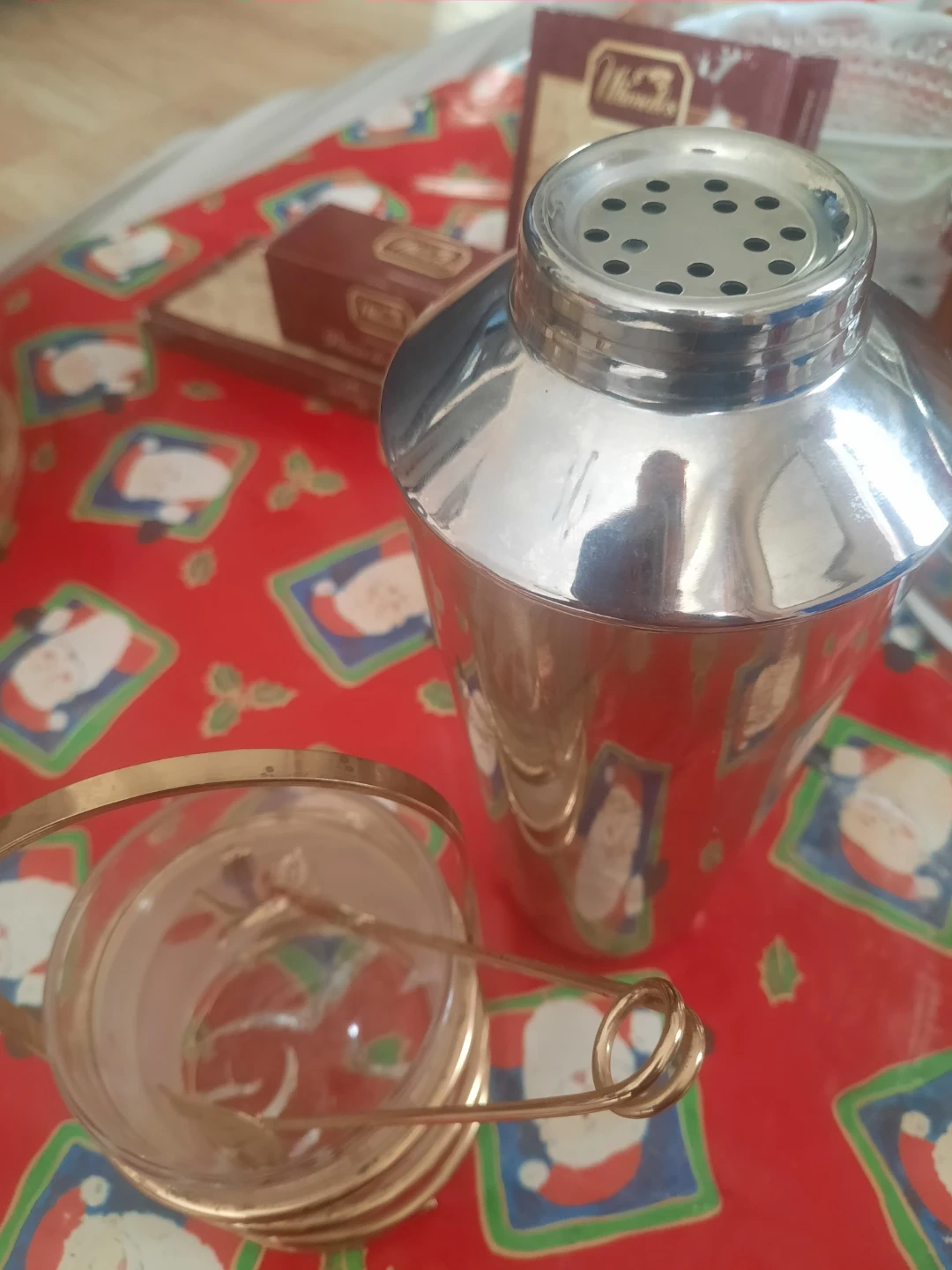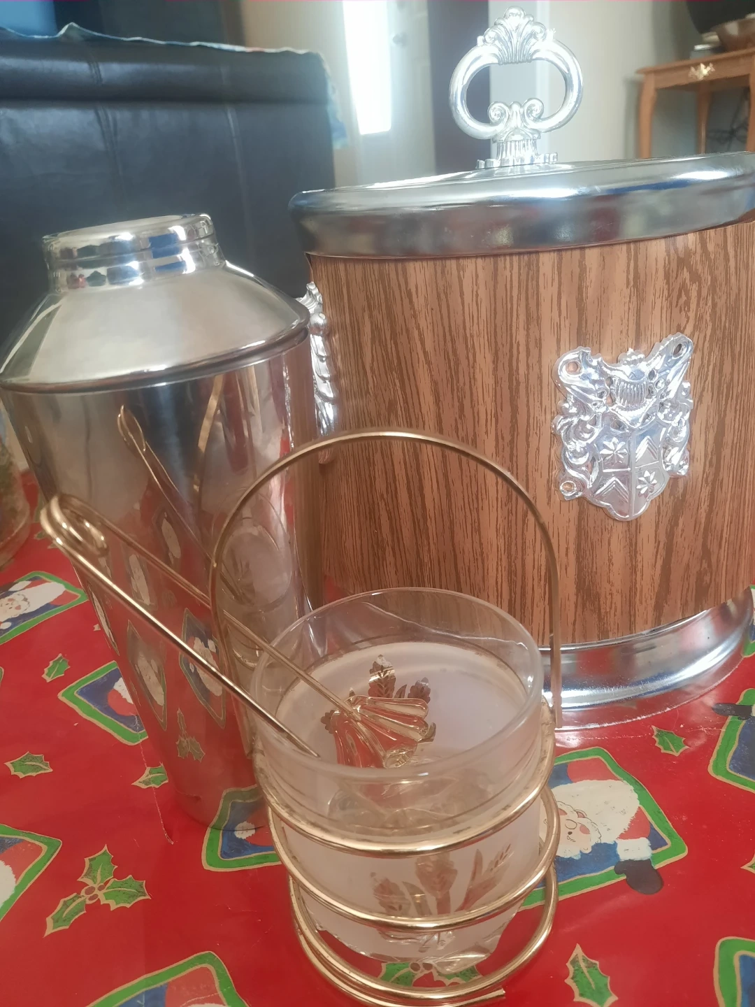 Here's a charming vintage bar set! It includes an ice bucket with a wood-look finish and a silver-tone top and handle, a cocktail shaker, and a unique glass with a gold-tone holder and tongs. Perfect for adding a touch of retro style to your home bar