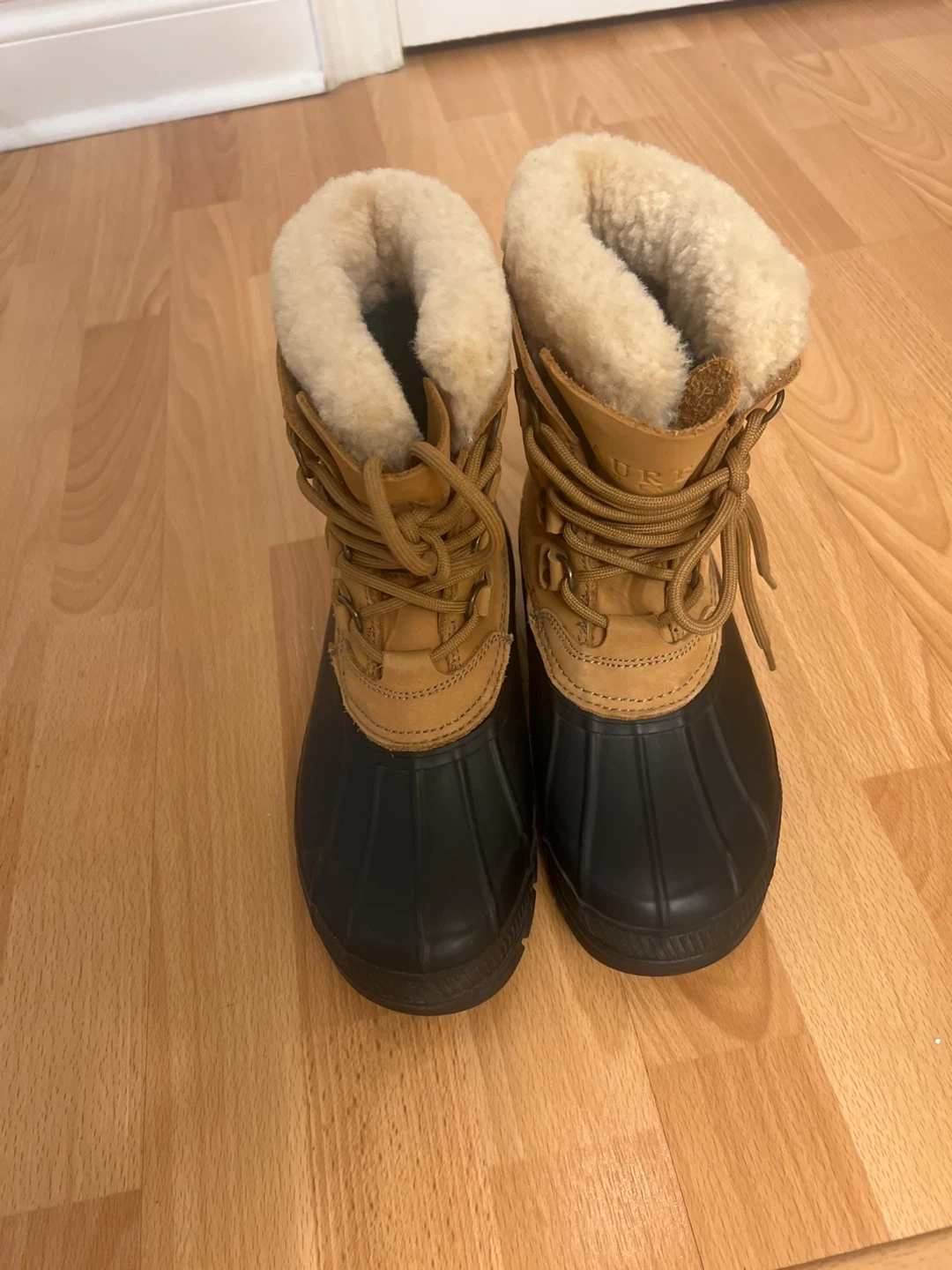 New Lauren winter boots for women on sale are perfect for keeping your feet warm and dry this winter! They feature a tan upper with a black rubber base and cozy faux fur lining. They look great and are in good condition!