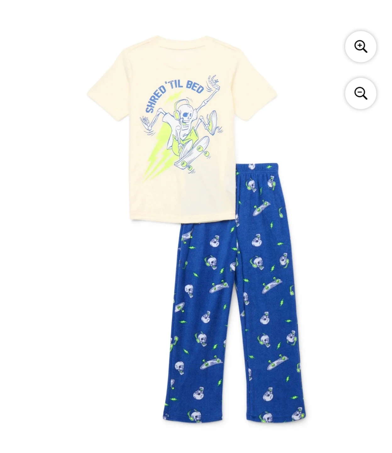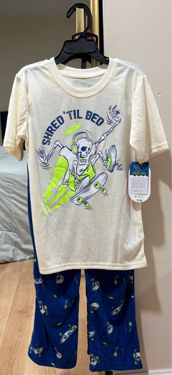I have a Wonder Nation boys' pajama set for sale. It's a size 6/7 and features a cool "Shred 'Til Bed" skeleton design on the shirt and skull pattern on the pants. Perfect for any young skater!