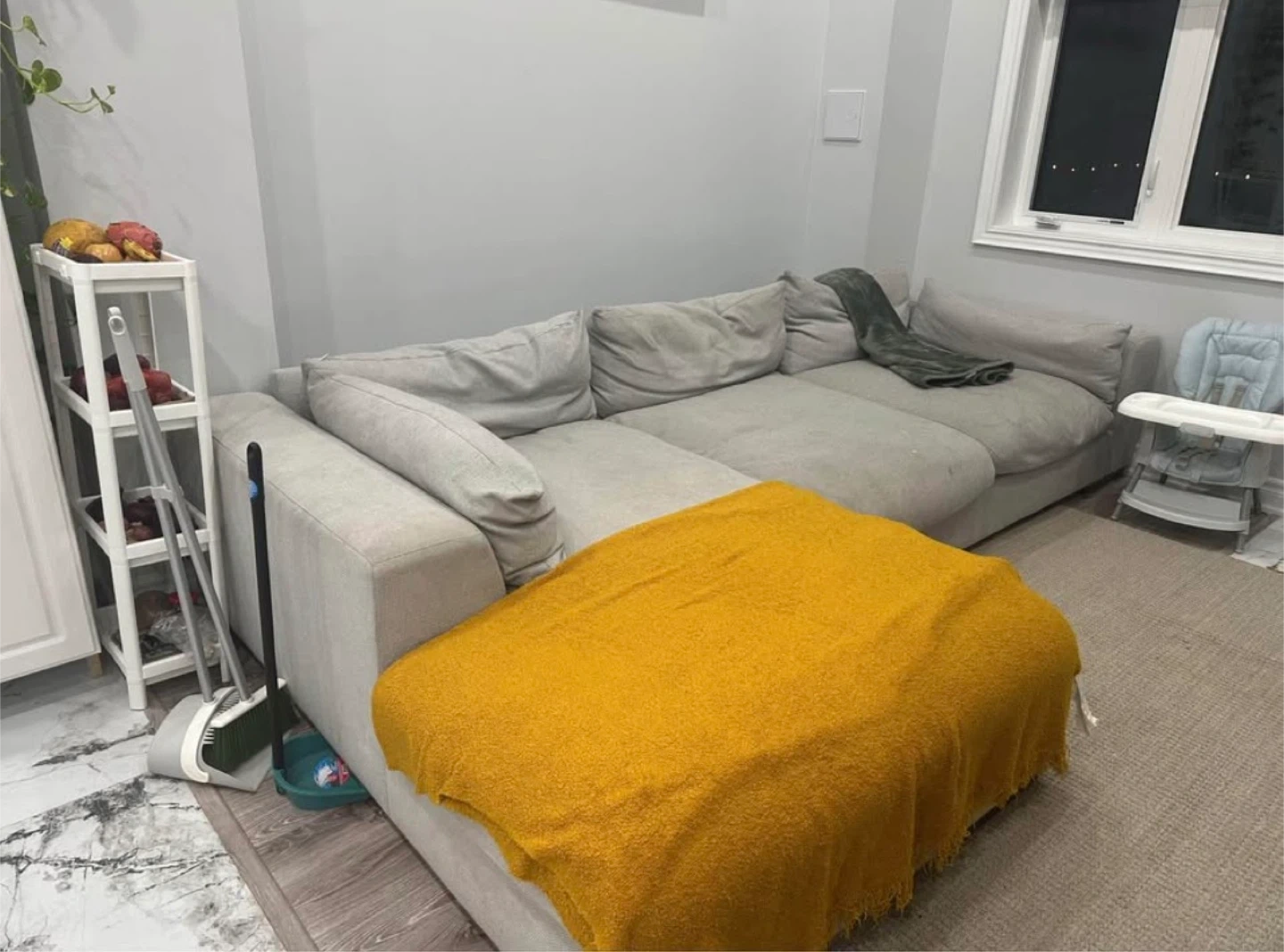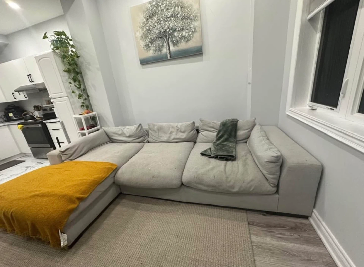 • Some minor coffee stains (can be cleaned or covered with throws).