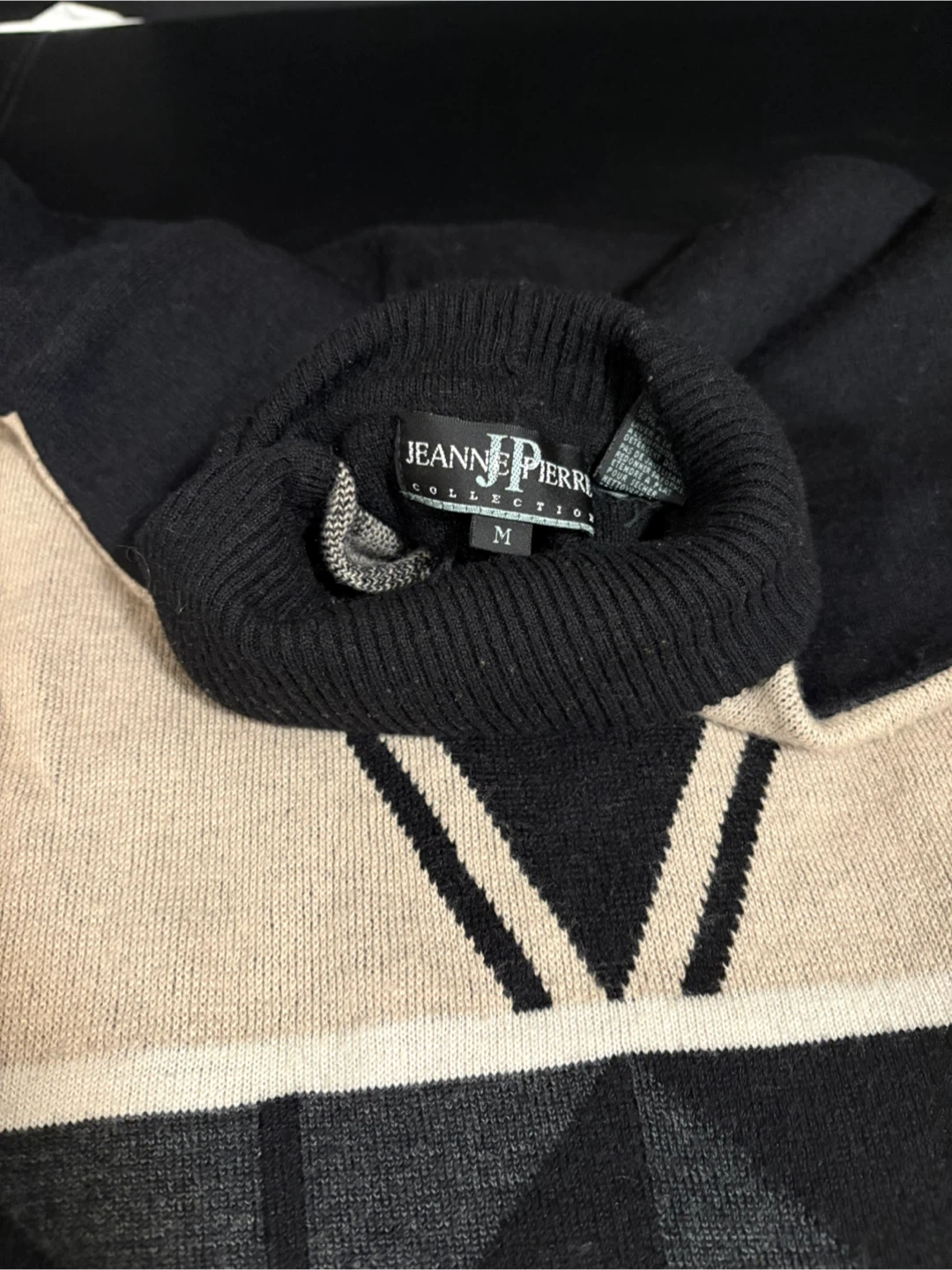 Selling a Jeanne Pierre Collection sweater in size M. It features a unique geometric pattern in black and beige. The material is a blend of 50% wool and 50% acrylic, making it cozy and comfortable for cooler weather