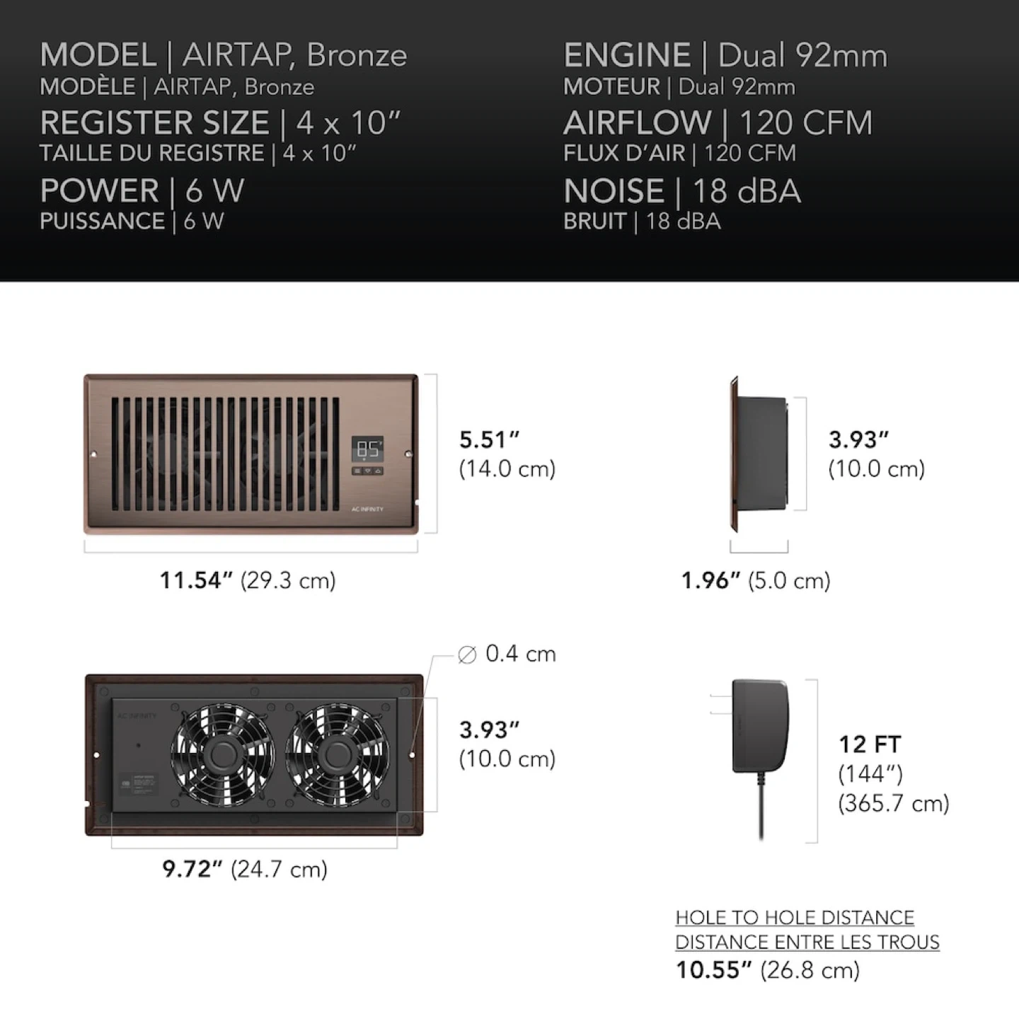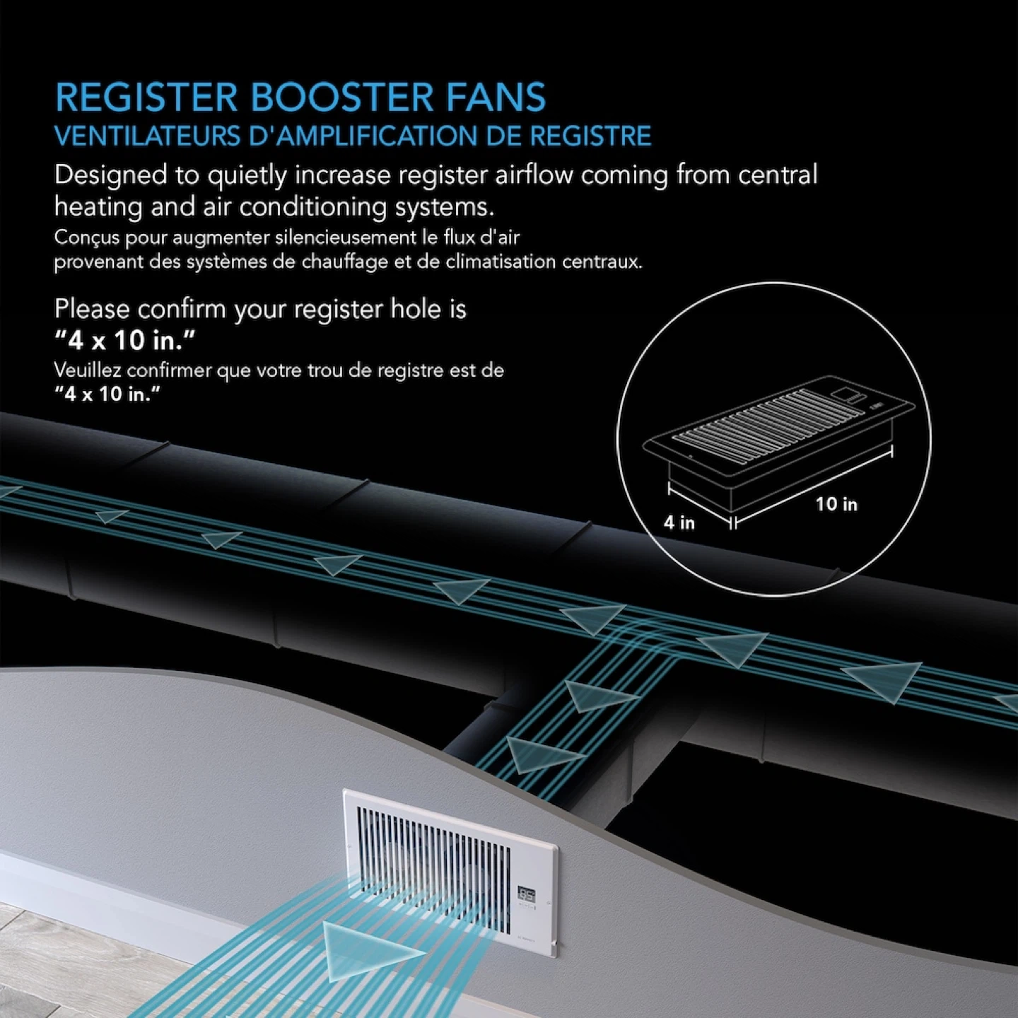 Looking to boost airflow from your central heating and air conditioning? This AC Infinity AIRTAP T4 register booster fan is designed to quietly increase airflow. It fits a 4 x 10 inch register hole.