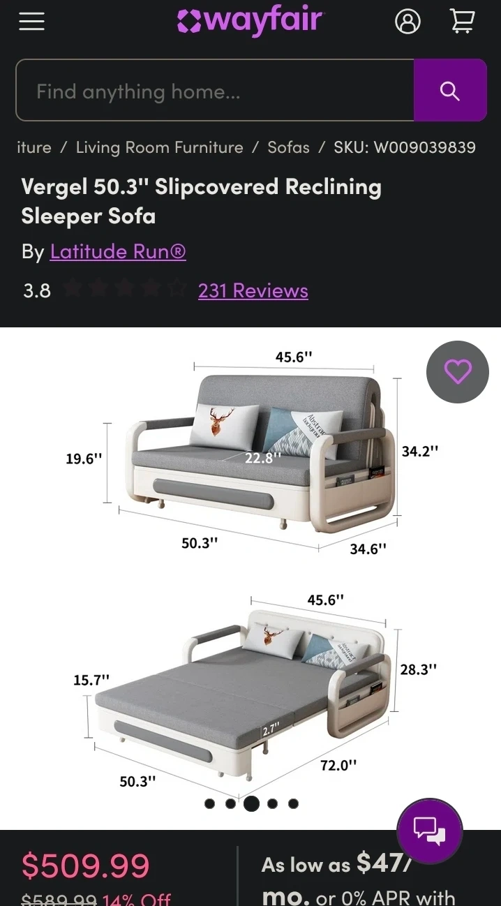 Selling a Latitude Run Vergel 50.3" Slipcovered Reclining Sleeper Sofa. I only took it out of the box, never assembled. Just don't want to go through the hassle of returning it.