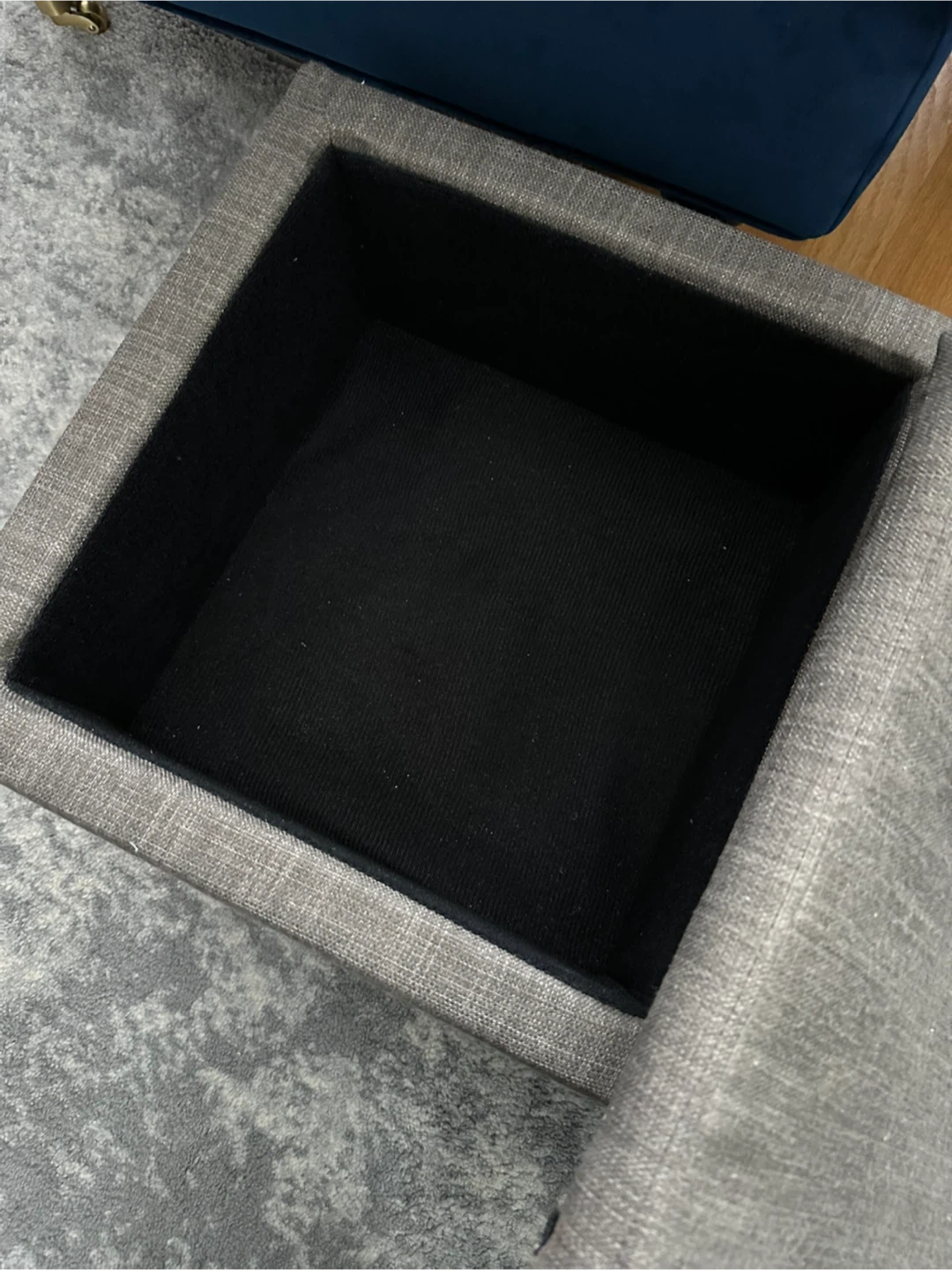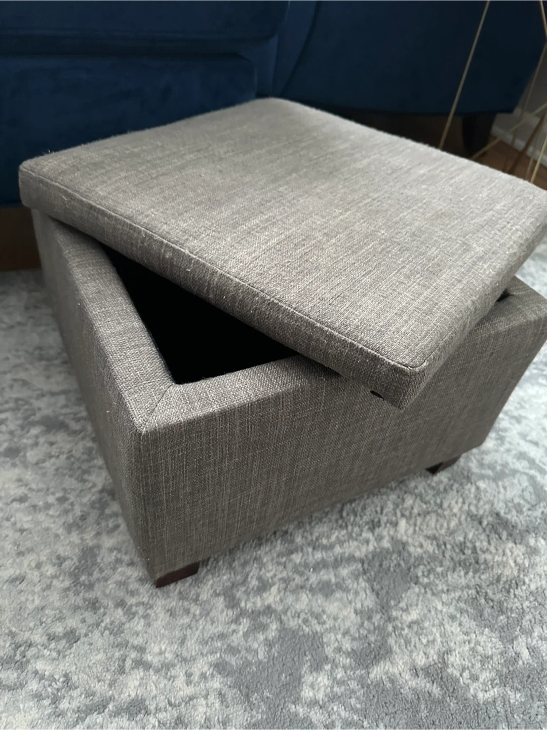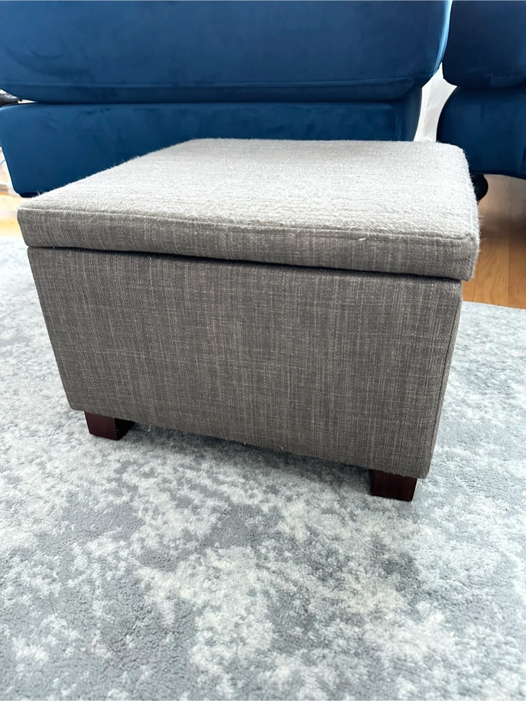 Selling a gray storage ottoman that is perfect for storing items you want to keep out of sight. The neutral color will match any decor.