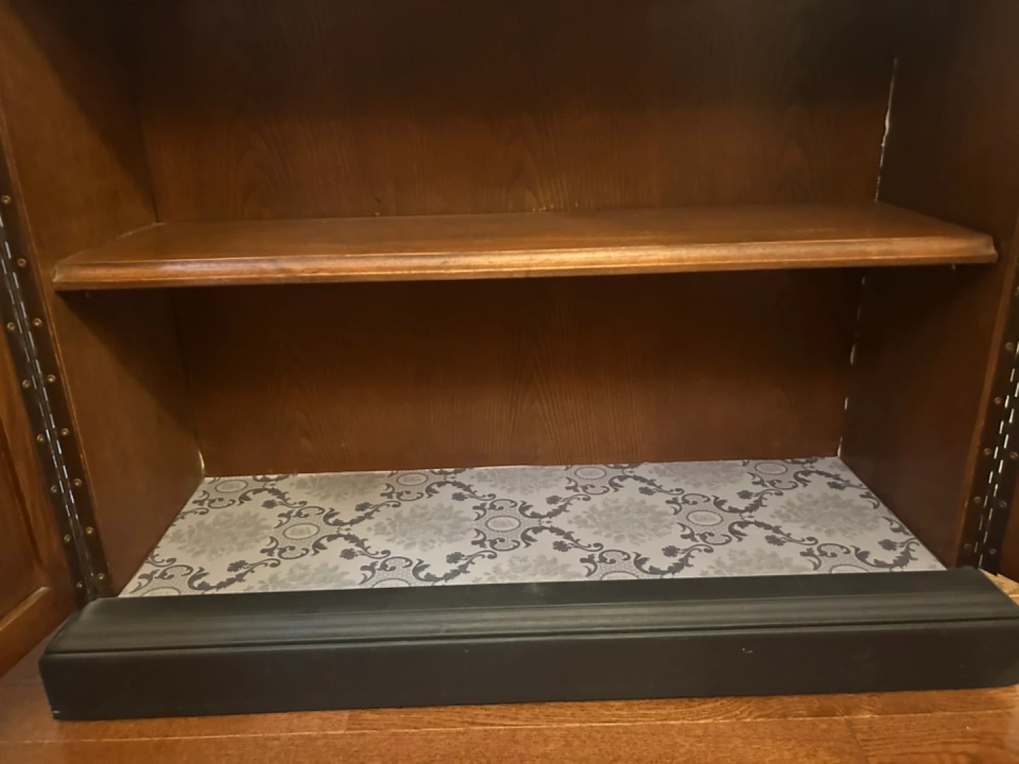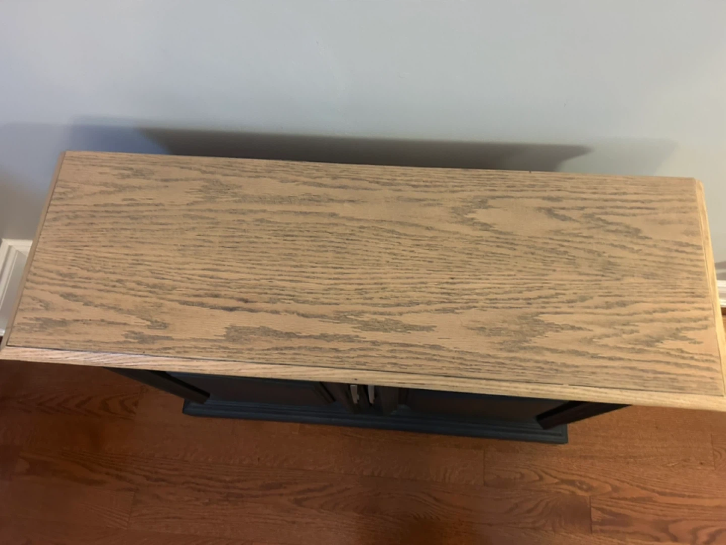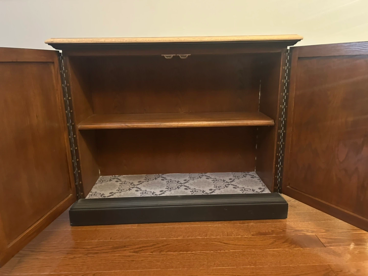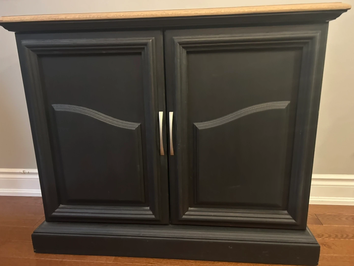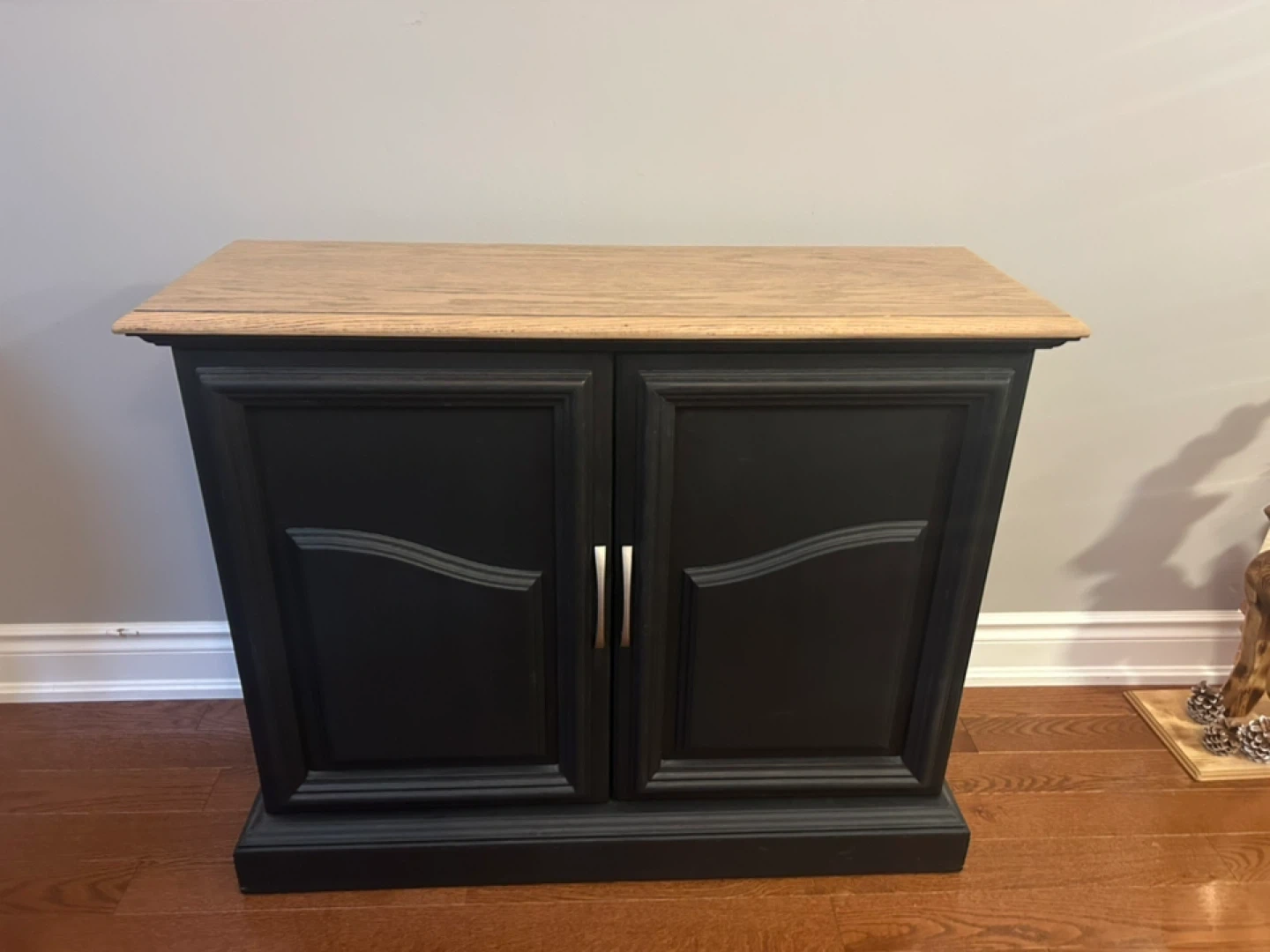 Selling a refinished cabinet with a black painted finish and a light wood top. The cabinet has two doors and interior shelving for storage. It's in great condition and would be an amazing addition to any room!