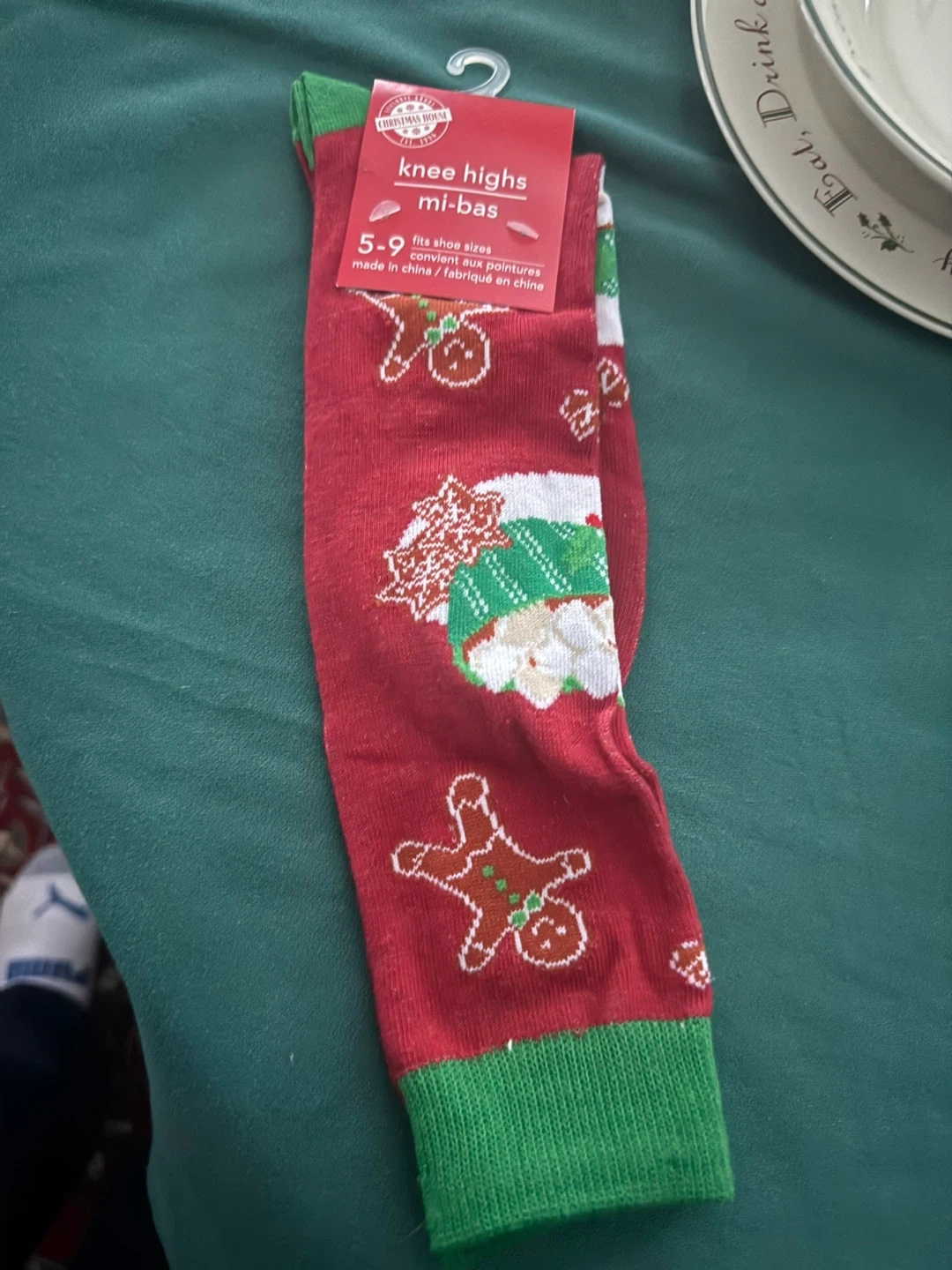 Cute pair of Christmas House knee high socks! They fit shoe sizes 5-9 and feature a fun gingerbread man design. Perfect for the holiday season!