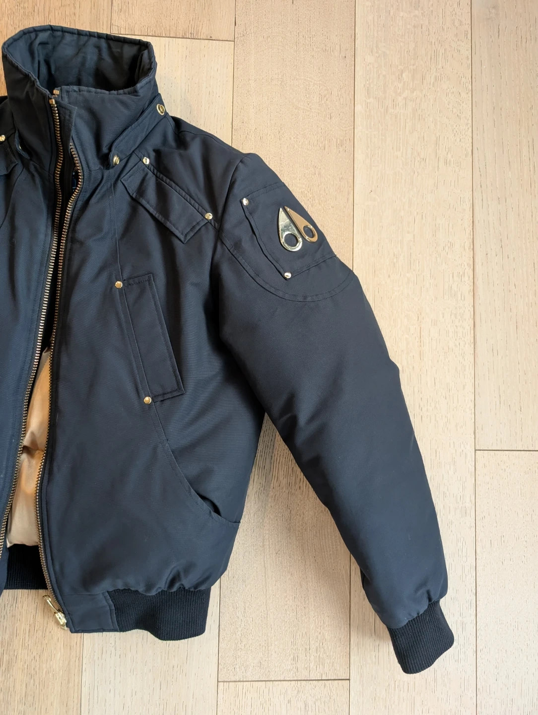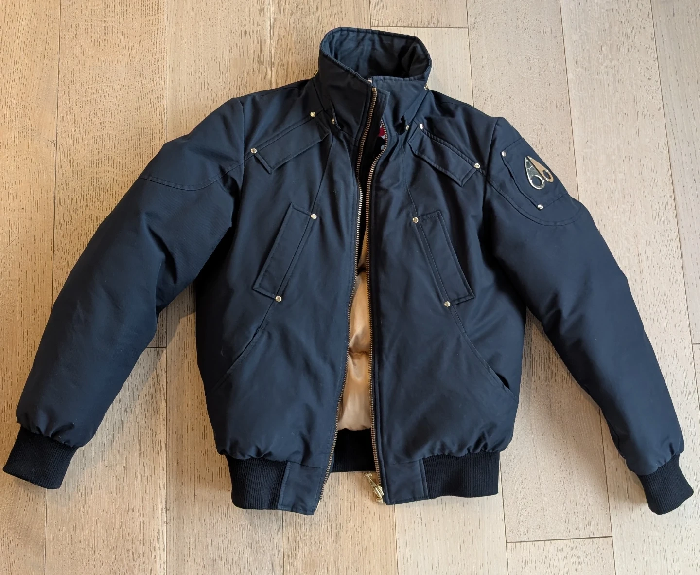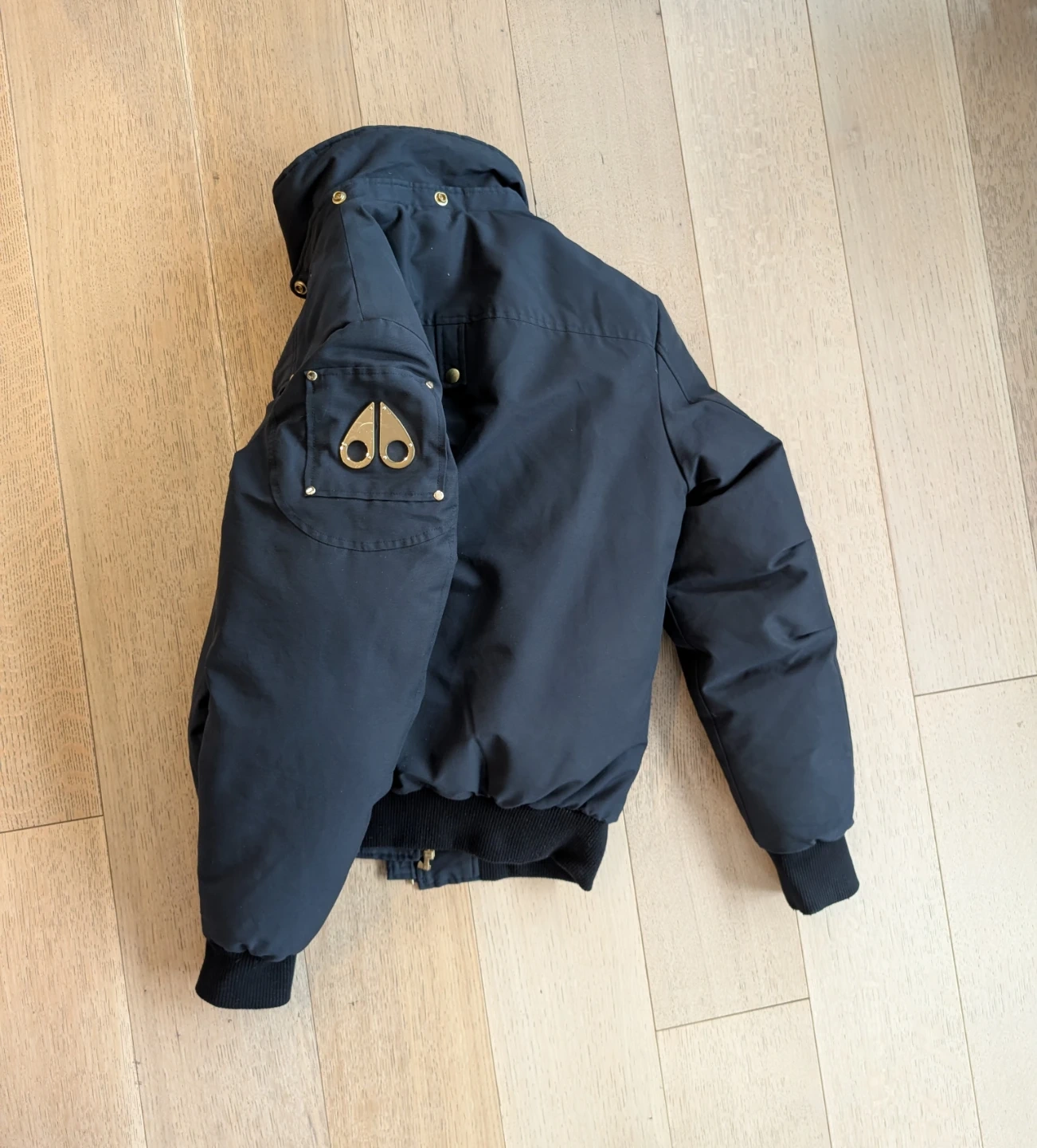 Selling a stylish Moose Knuckles bomber jacket in navy blue. It's in great condition and ready for the colder weather! It's missing the hood :(