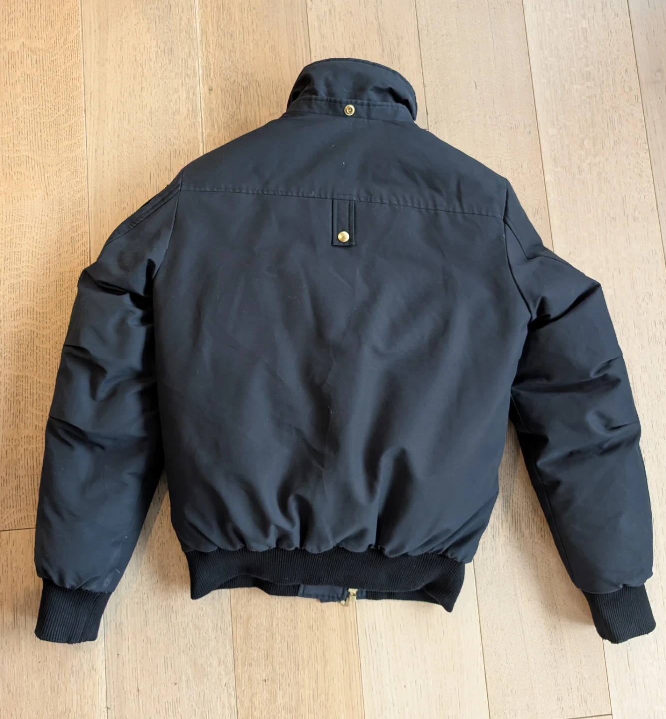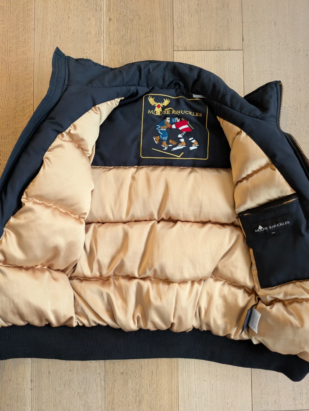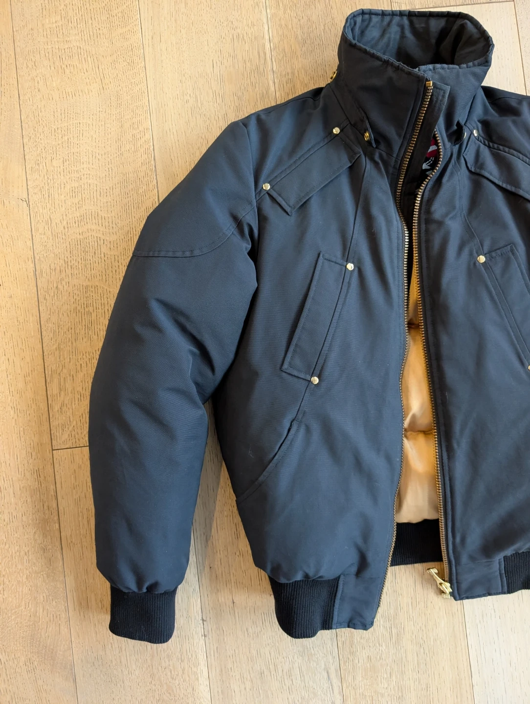 Selling a stylish Moose Knuckles bomber jacket in navy blue. It's in great condition and ready for the colder weather! It's missing the hood :(