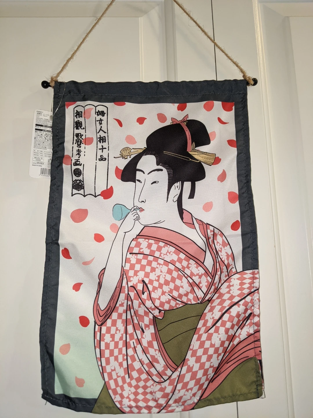 Here's a lovely Japanese Geisha wall hanging! It adds a touch of elegance and culture to any room. The details in the artwork are really beautiful. It's in great condition and ready to brighten up your space