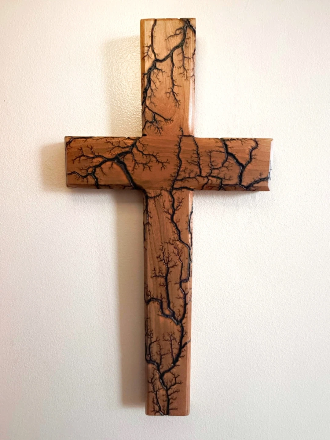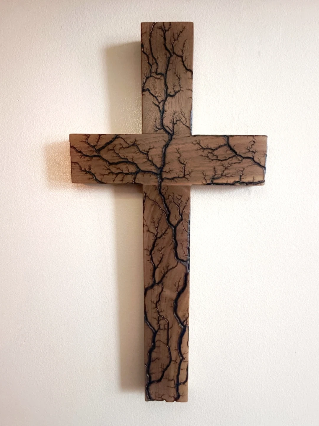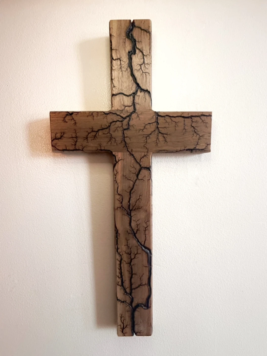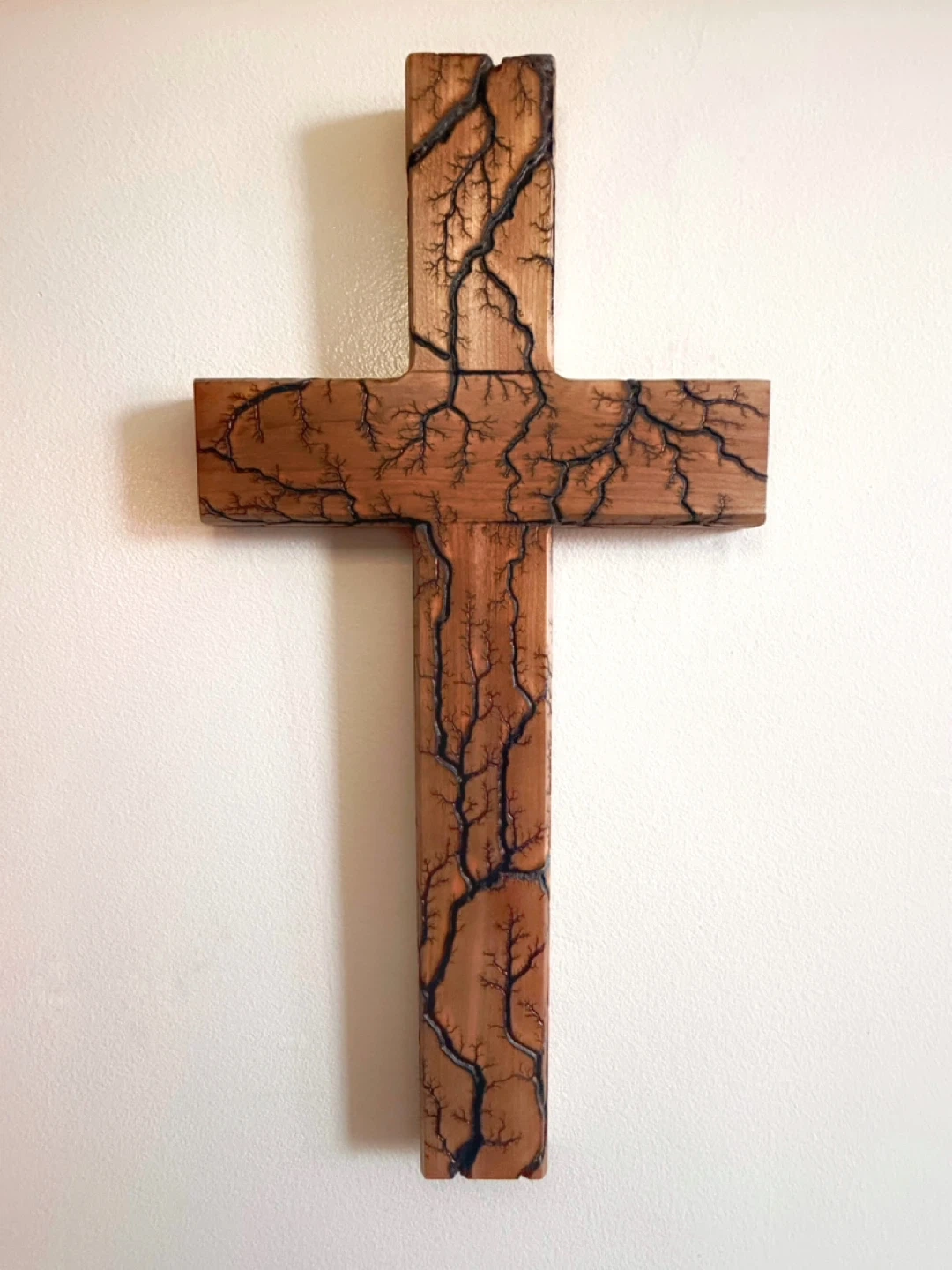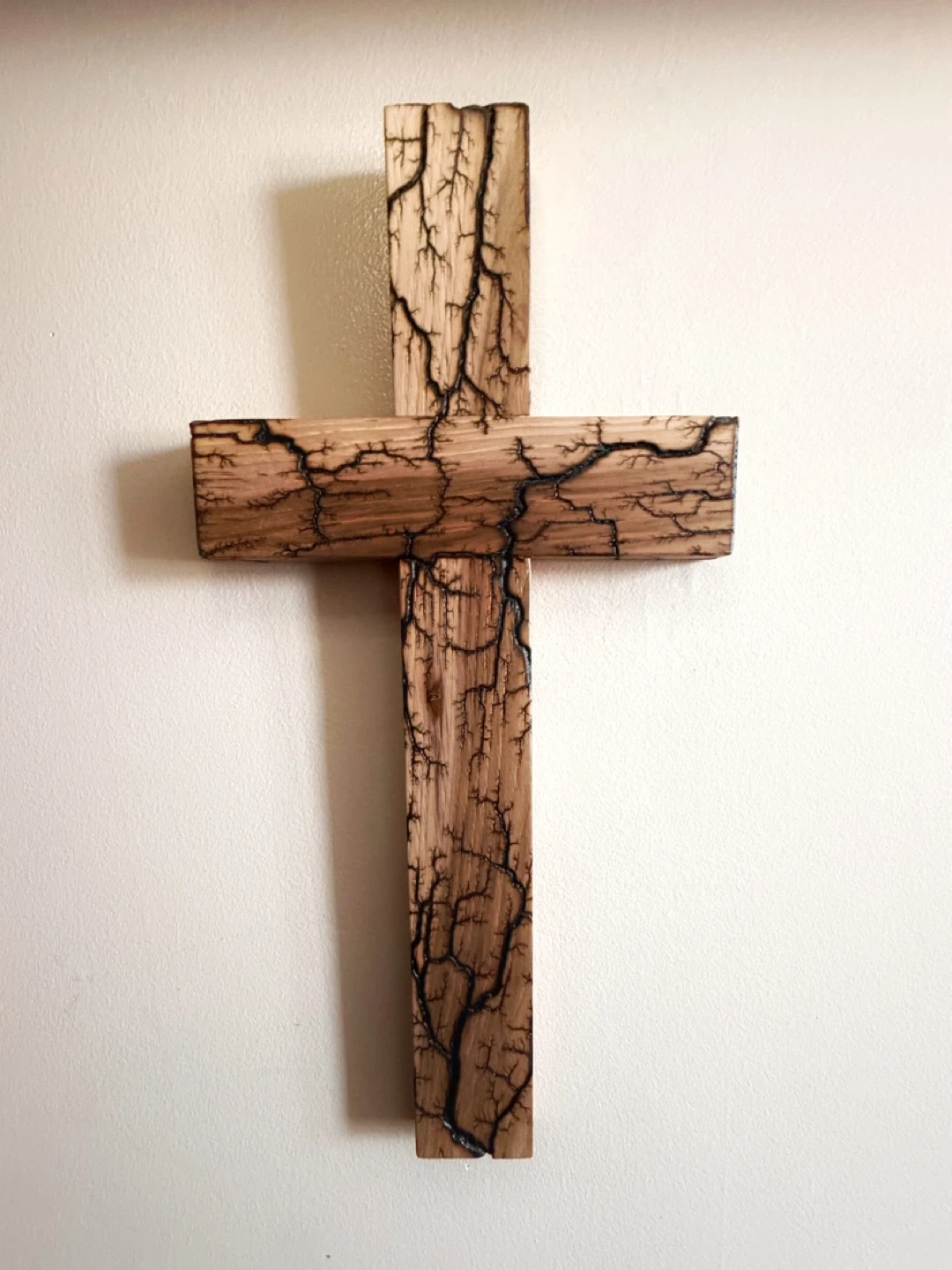 • Each cross has its own unique burn pattern, created by electricity traveling through the grain of the wood