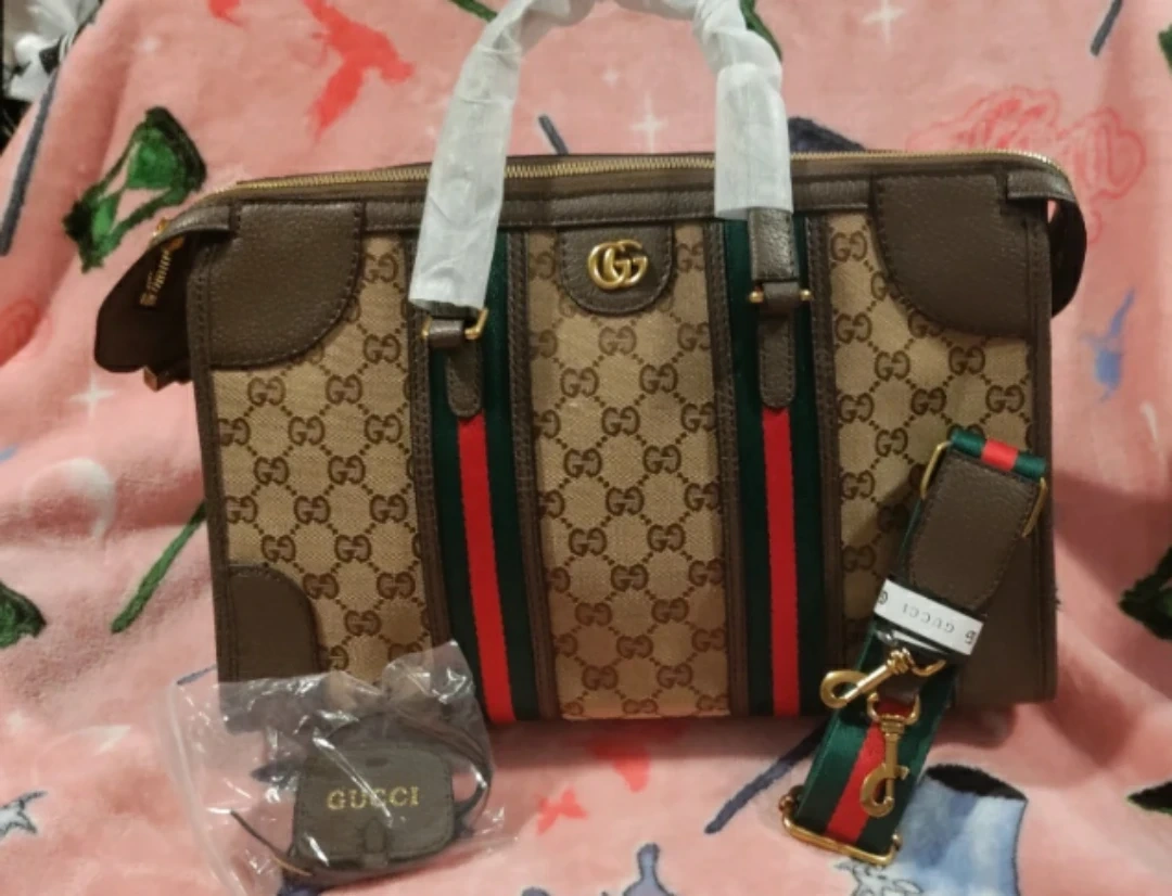 Selling a brand new Gucci Boston bag! It features the classic Gucci monogram pattern with green and red stripe detailing. Comes with an adjustable strap and a Gucci tag. Perfect for everyday use!