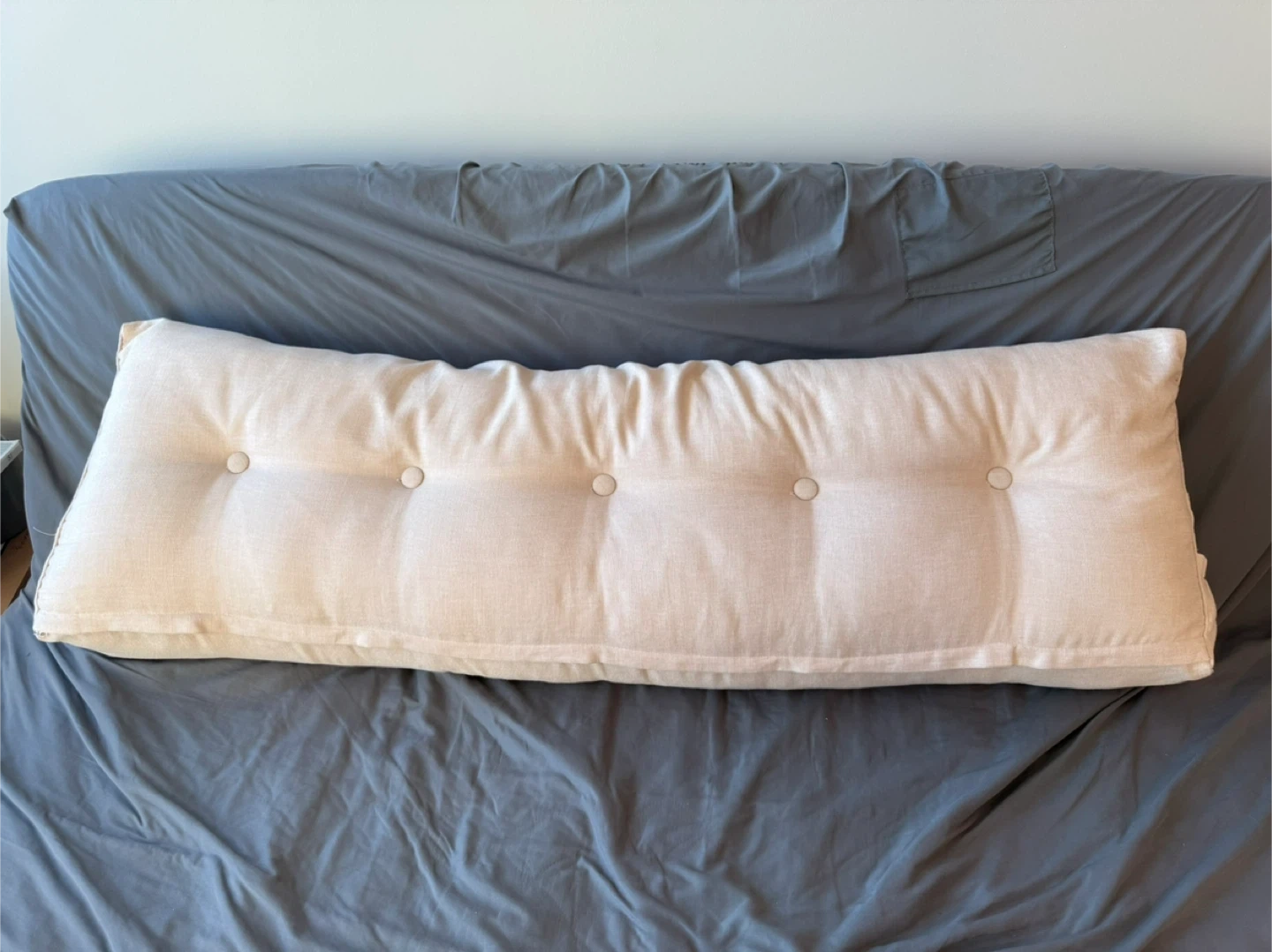 Selling a Wankei triangular headboard pillow in beige, queen size. It's perfect as a decorative body throw pillow or a reading bolster lumbar cushion for your sofa bed. Dimensions are 59(L)x7.8(W)x19.7(H) inches.