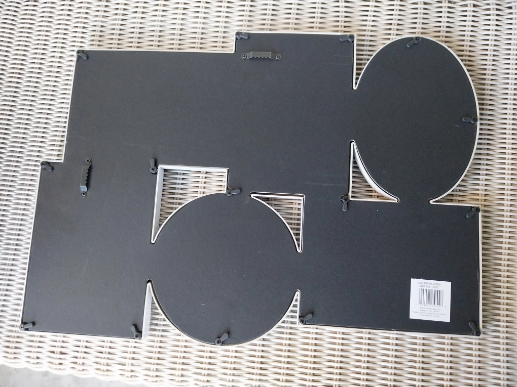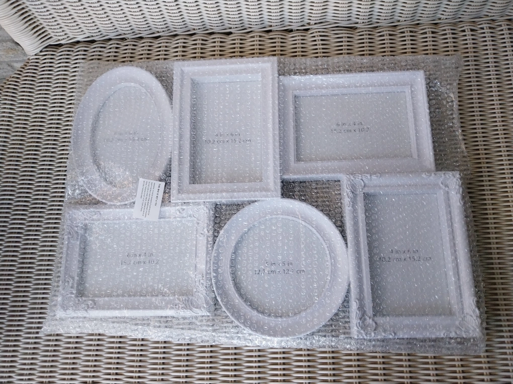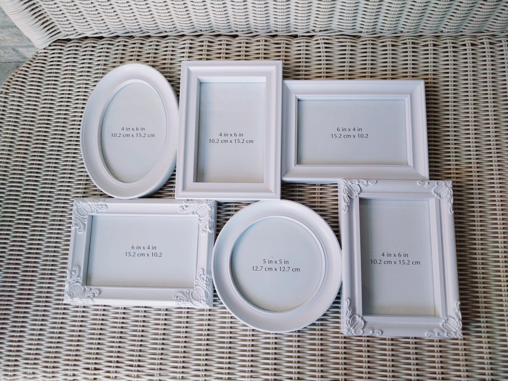 One piece with 6 openings to add your photos too. Fits 4"x 6" and a 5"x 5" print. White colour. Elegant style. Plastic/resin material makes it light to hang. Overall size. Can hang landscape or horizontal. Overall size 18.75" x 13.5"