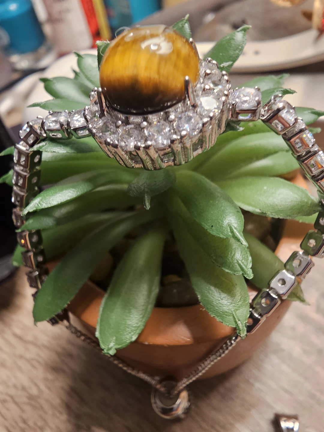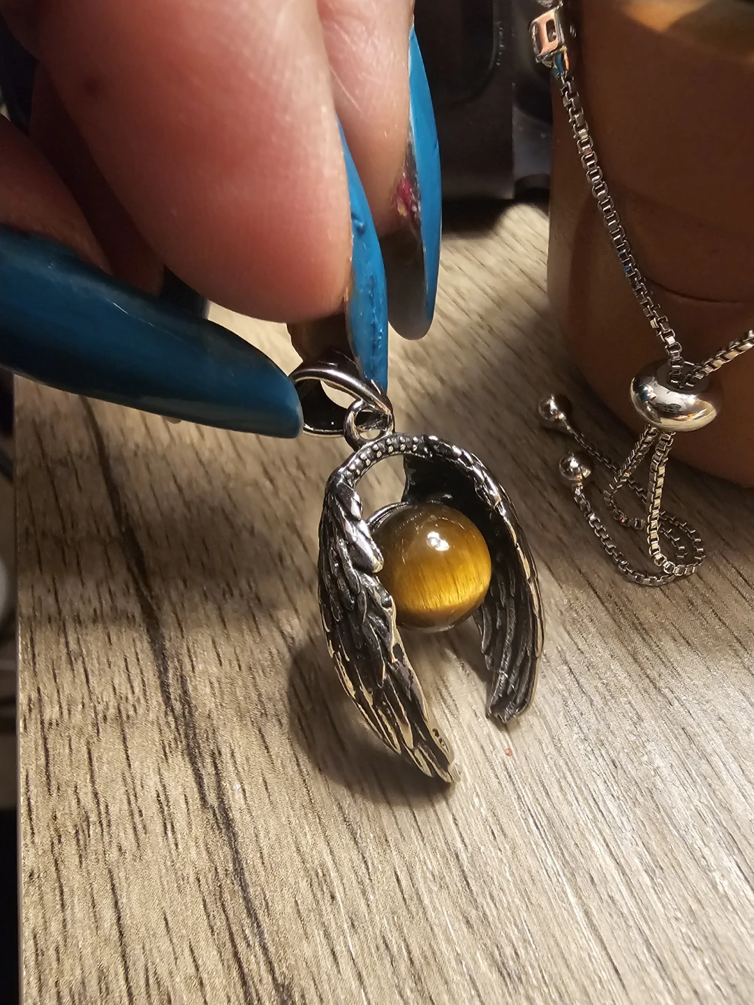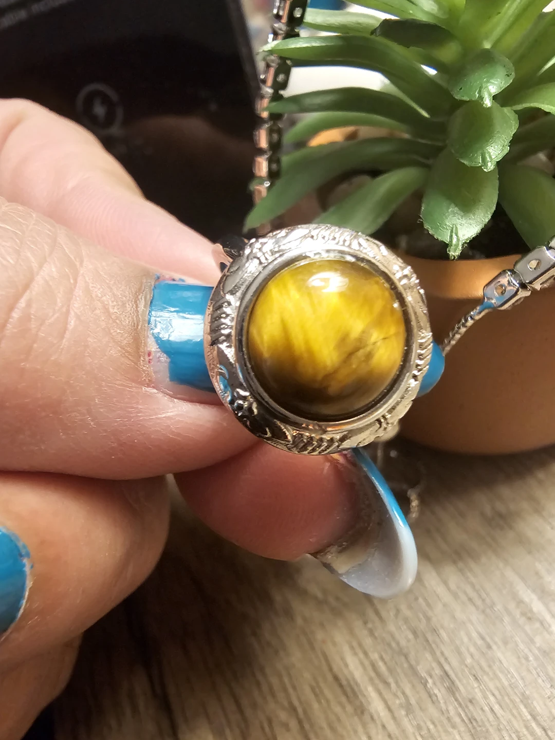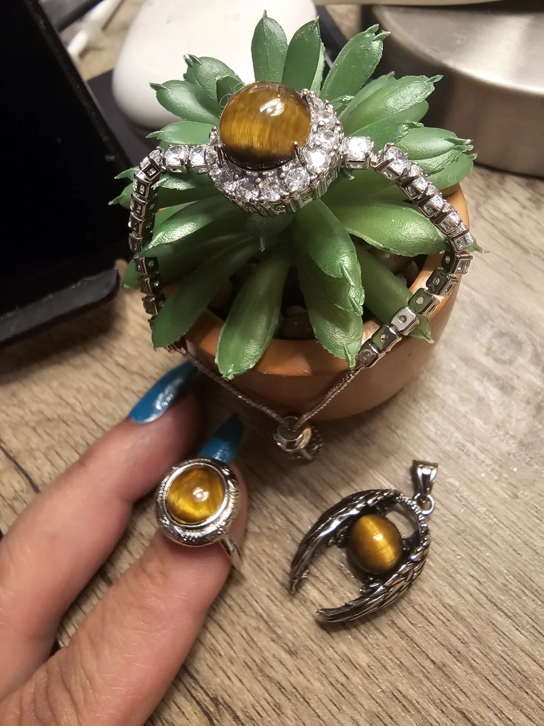 Selling a beautiful jewellery set featuring tiger eye stones. Includes a pendant with angel wings, a ring, and a bracelet. The stones have a lovely golden brown colour. Perfect for adding a unique touch to your style!