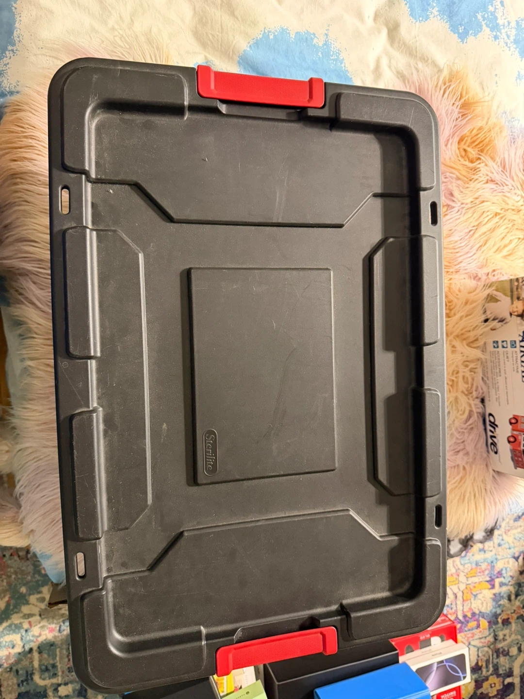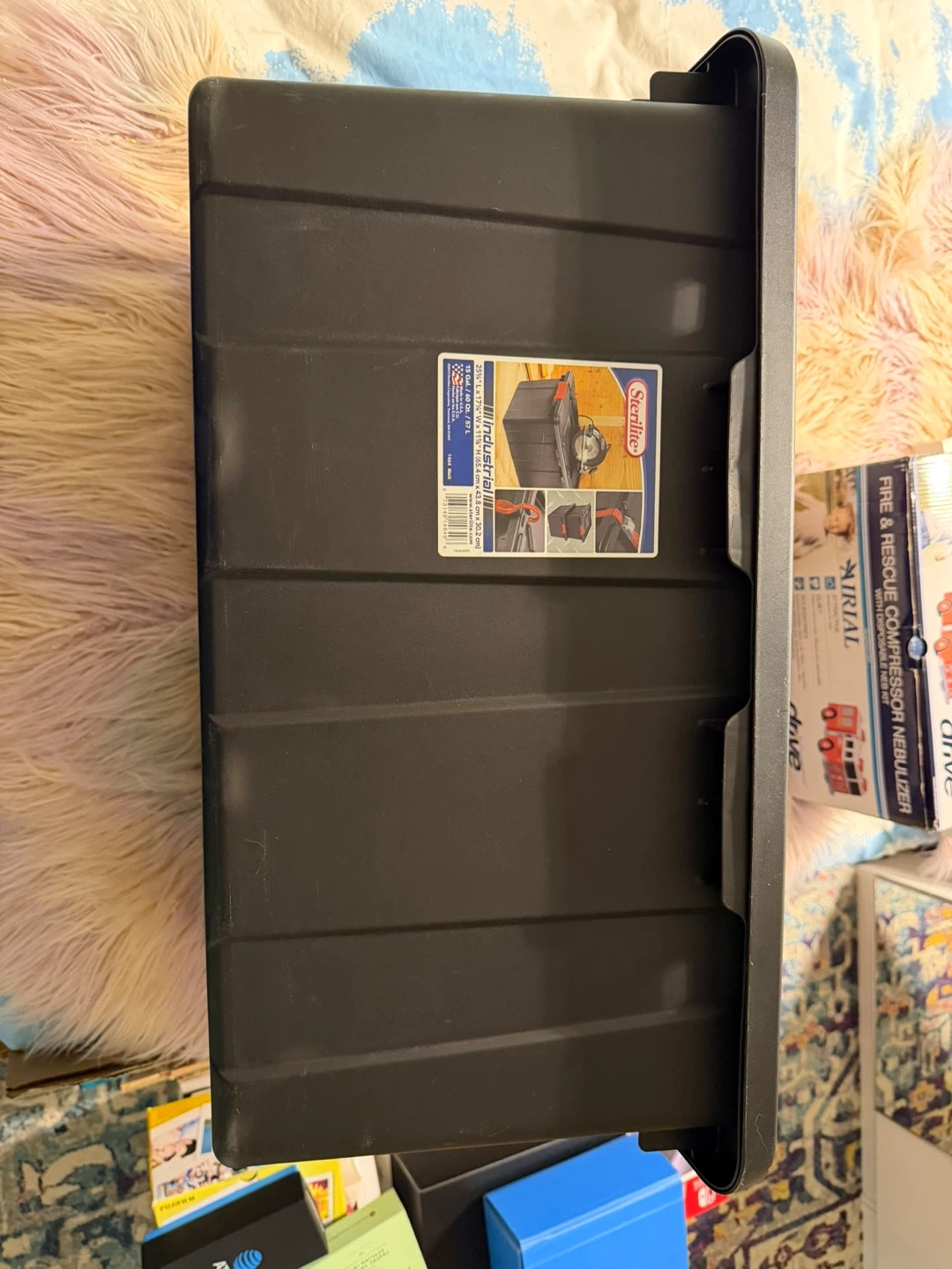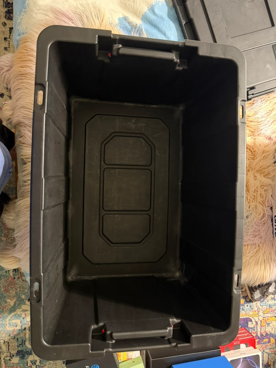 Selling a Sterilite Industrial Tote in black. It's in great condition and ready to help you organize! It's super durable and perfect for storing all sorts of things.