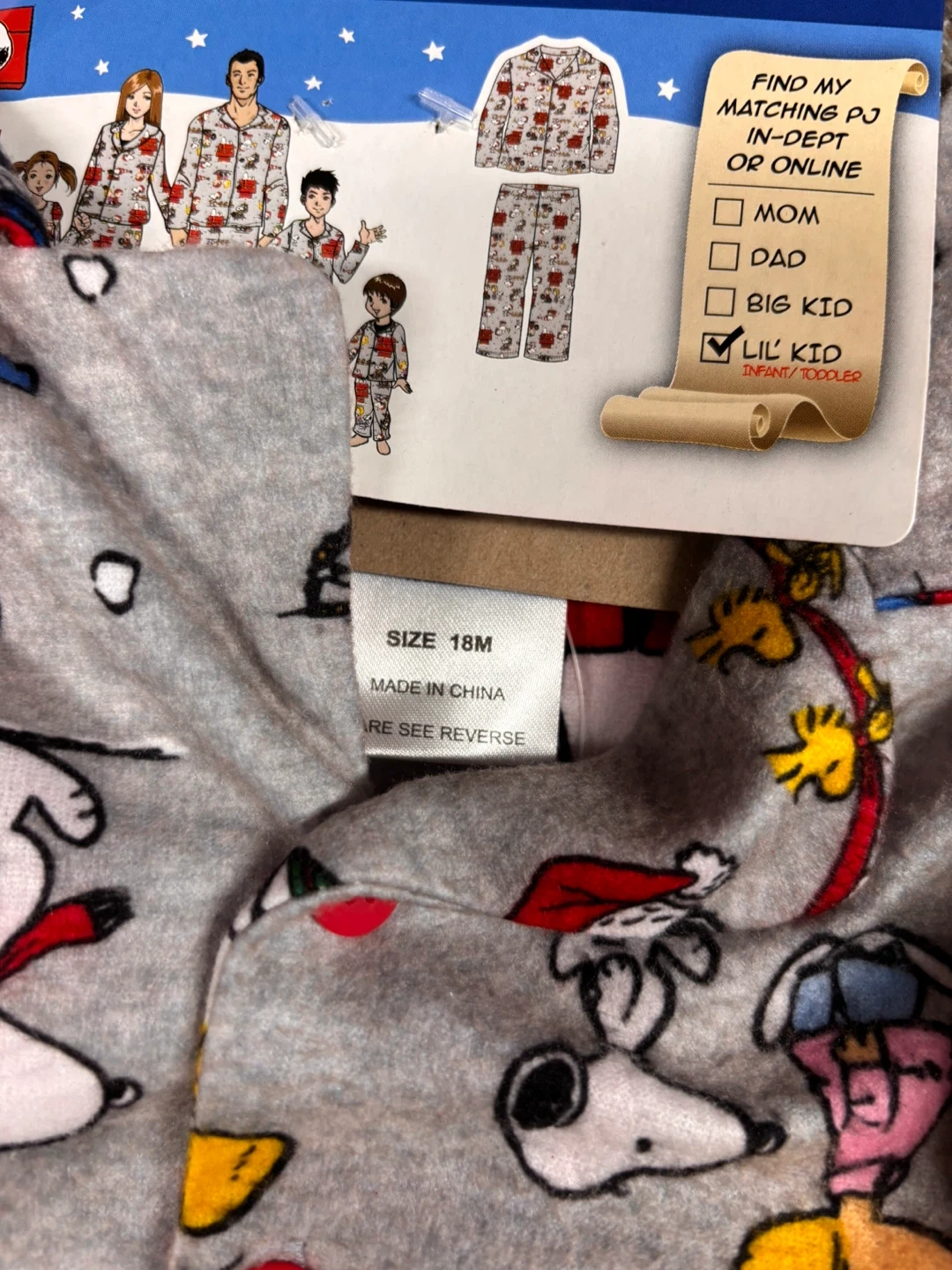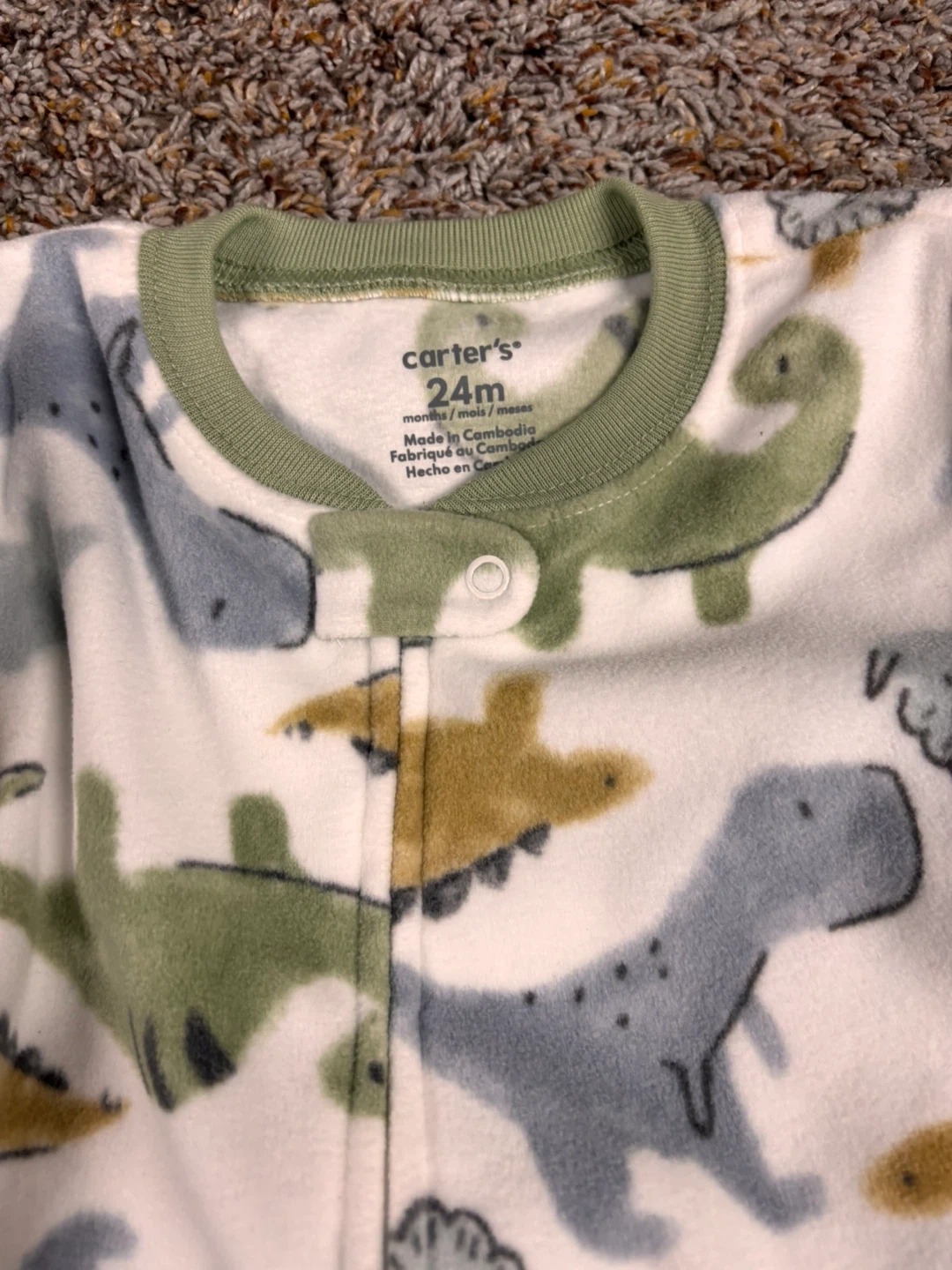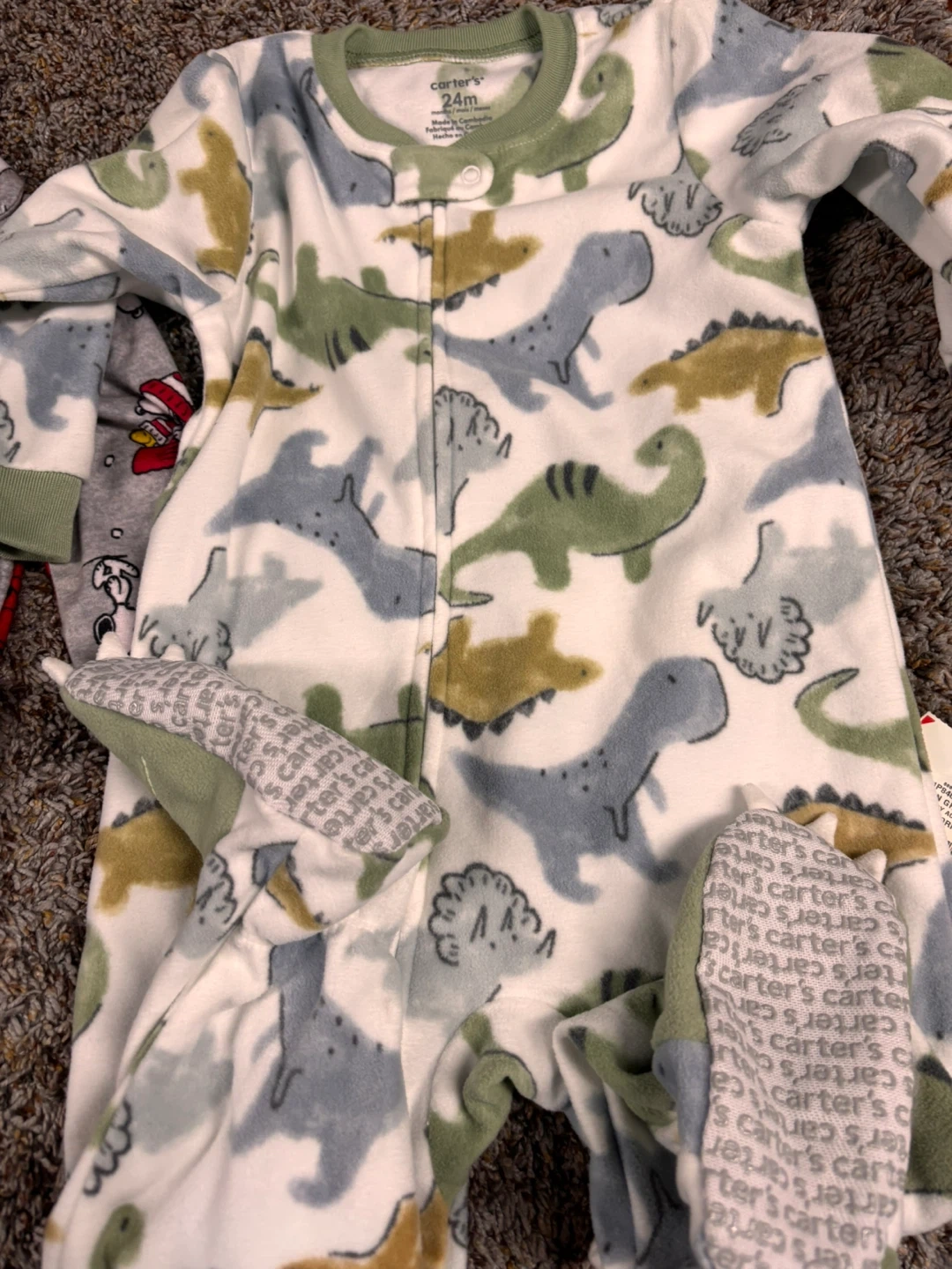 Here are two sets of pajamas for your little one! One is a Carter's dinosaur-themed footed pajama in size 24 months. The other is a Snoopy pajama set, size 18 months.