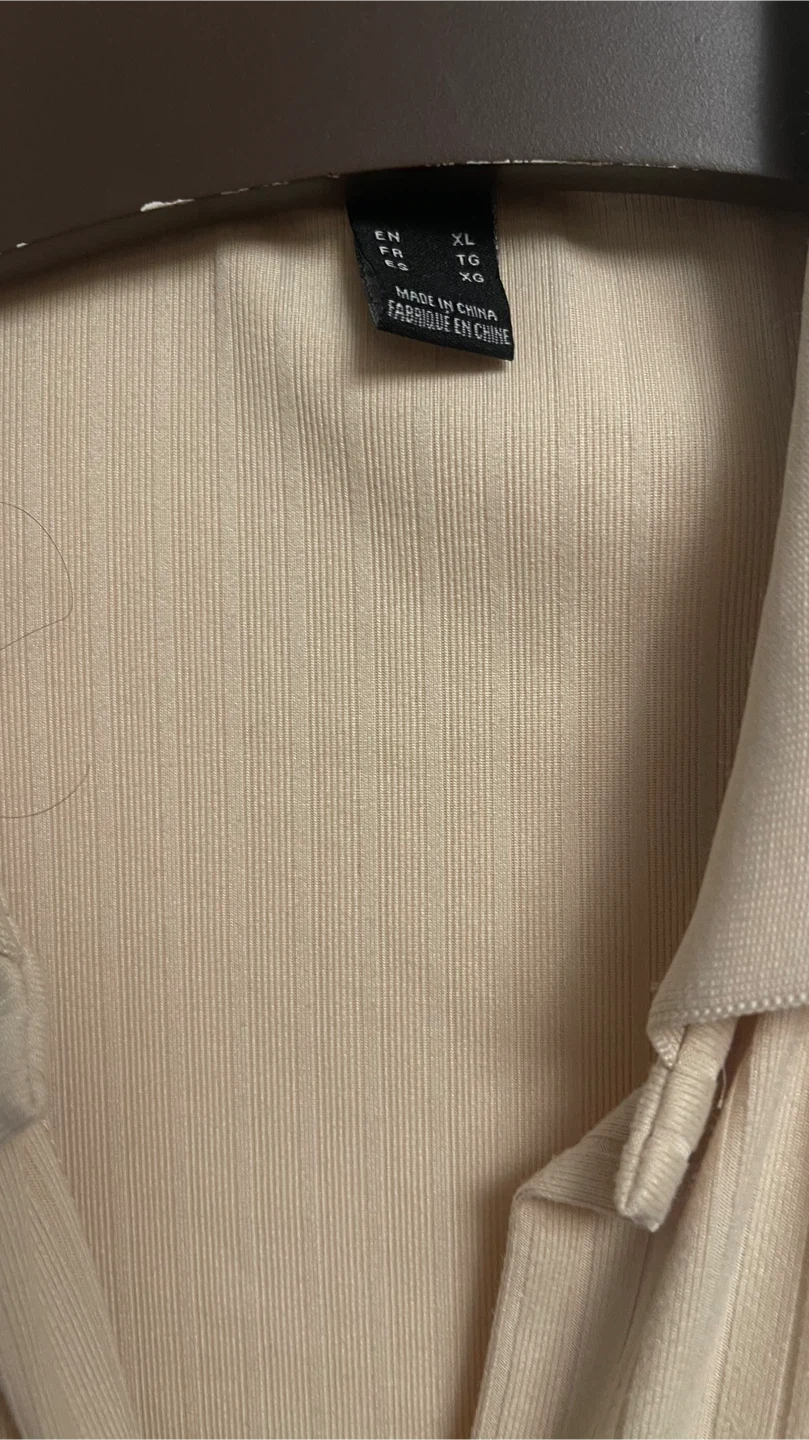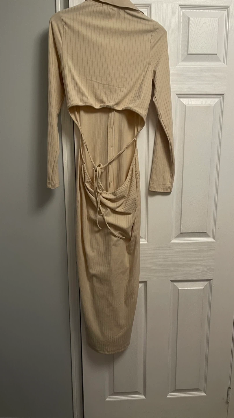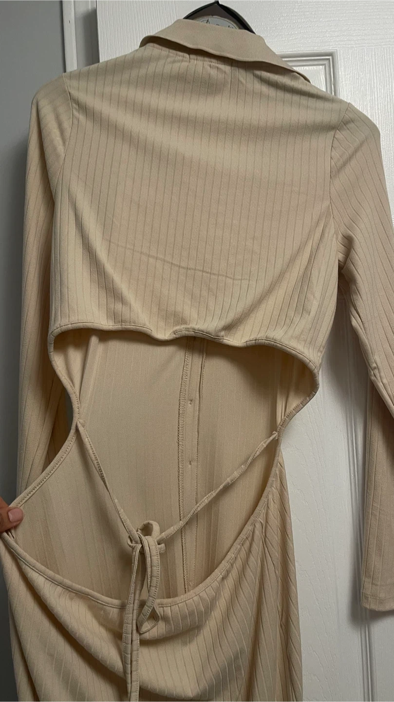 Selling a beige ribbed cutout dress in excellent condition. It's a size XL and features a stylish cutout design. Perfect for a night out or a special occasion!