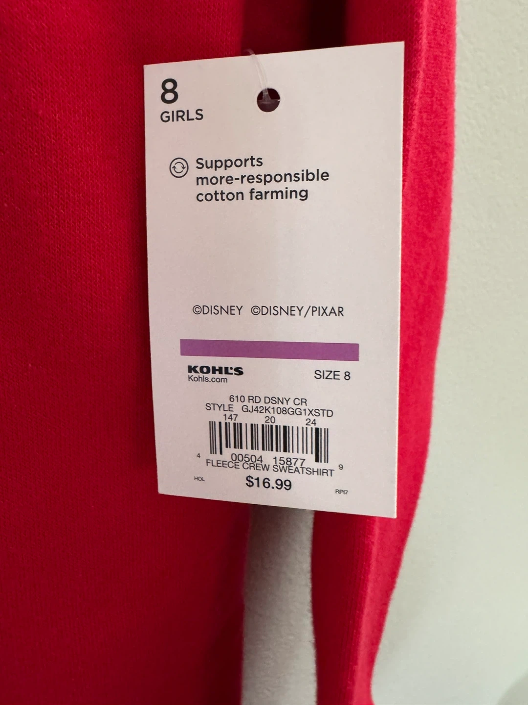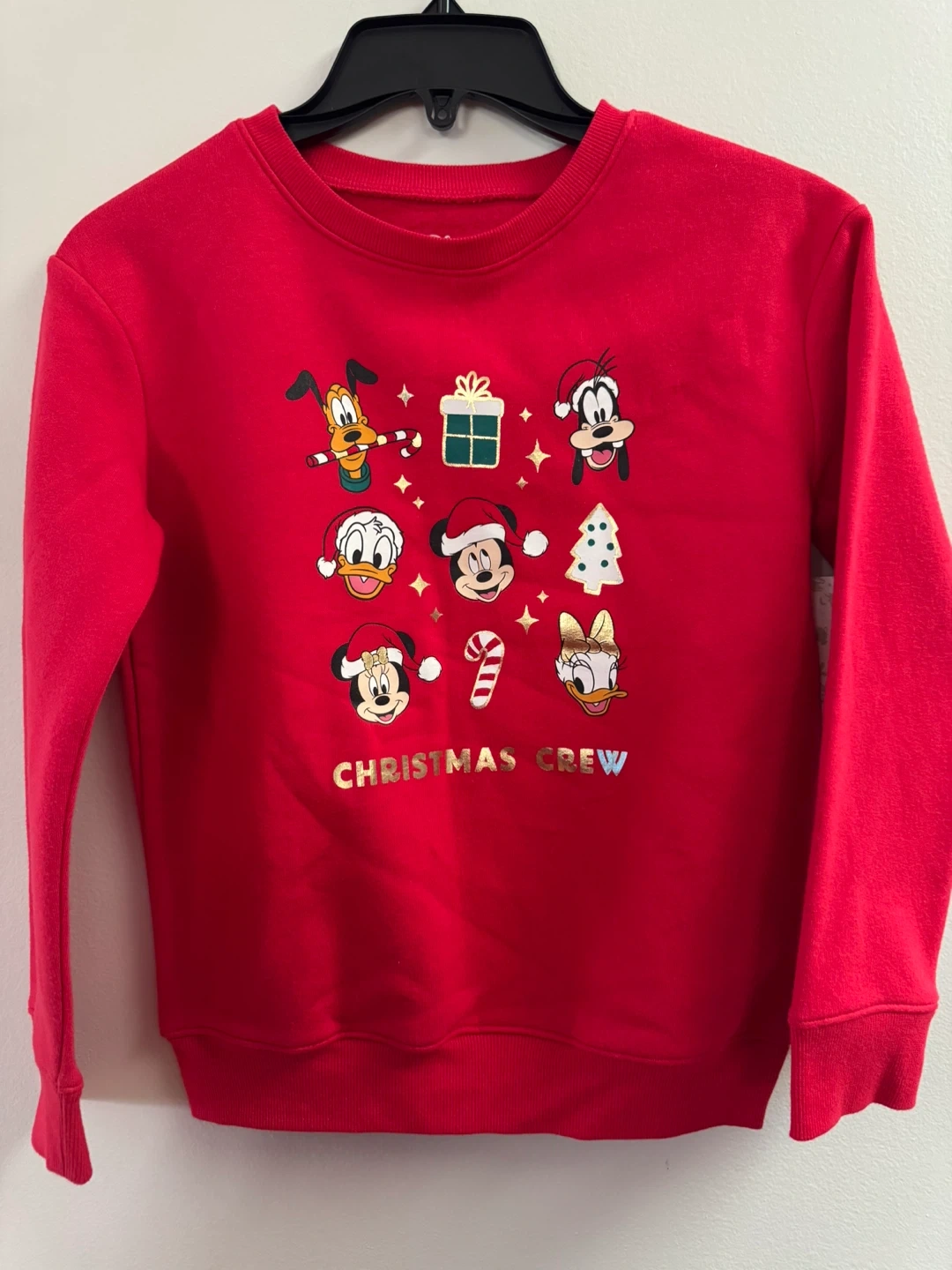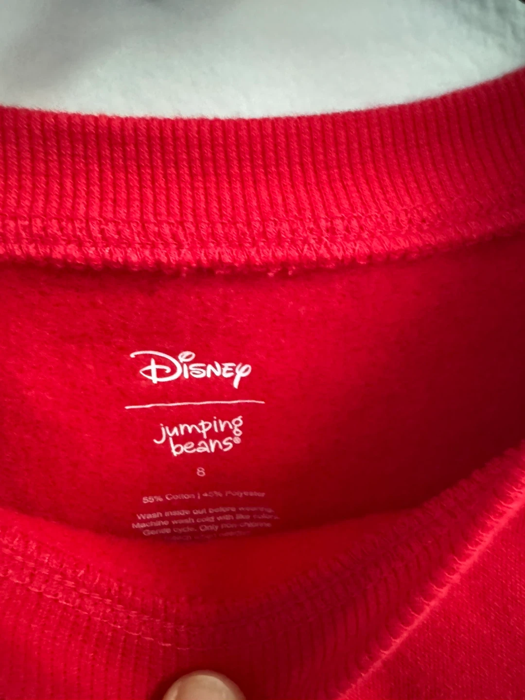 Disney Jumping Beans sweatshirt. It's a vibrant red and features a fun Christmas Crew design with Mickey Mouse and friends. Size 8 .55% cotton and 45% polyester.