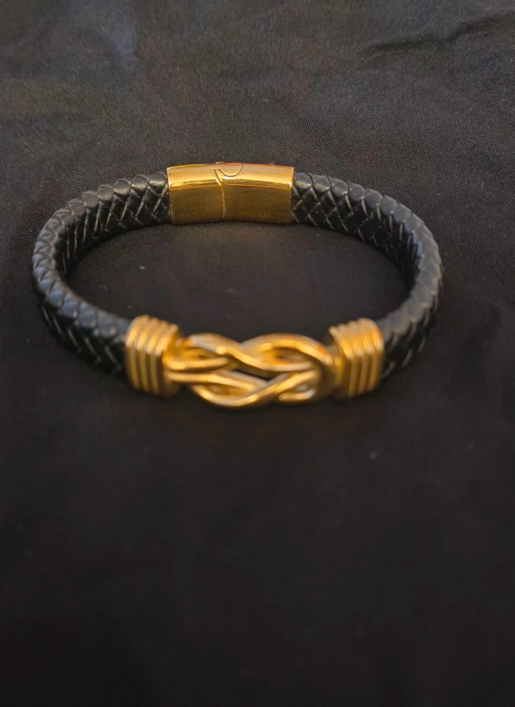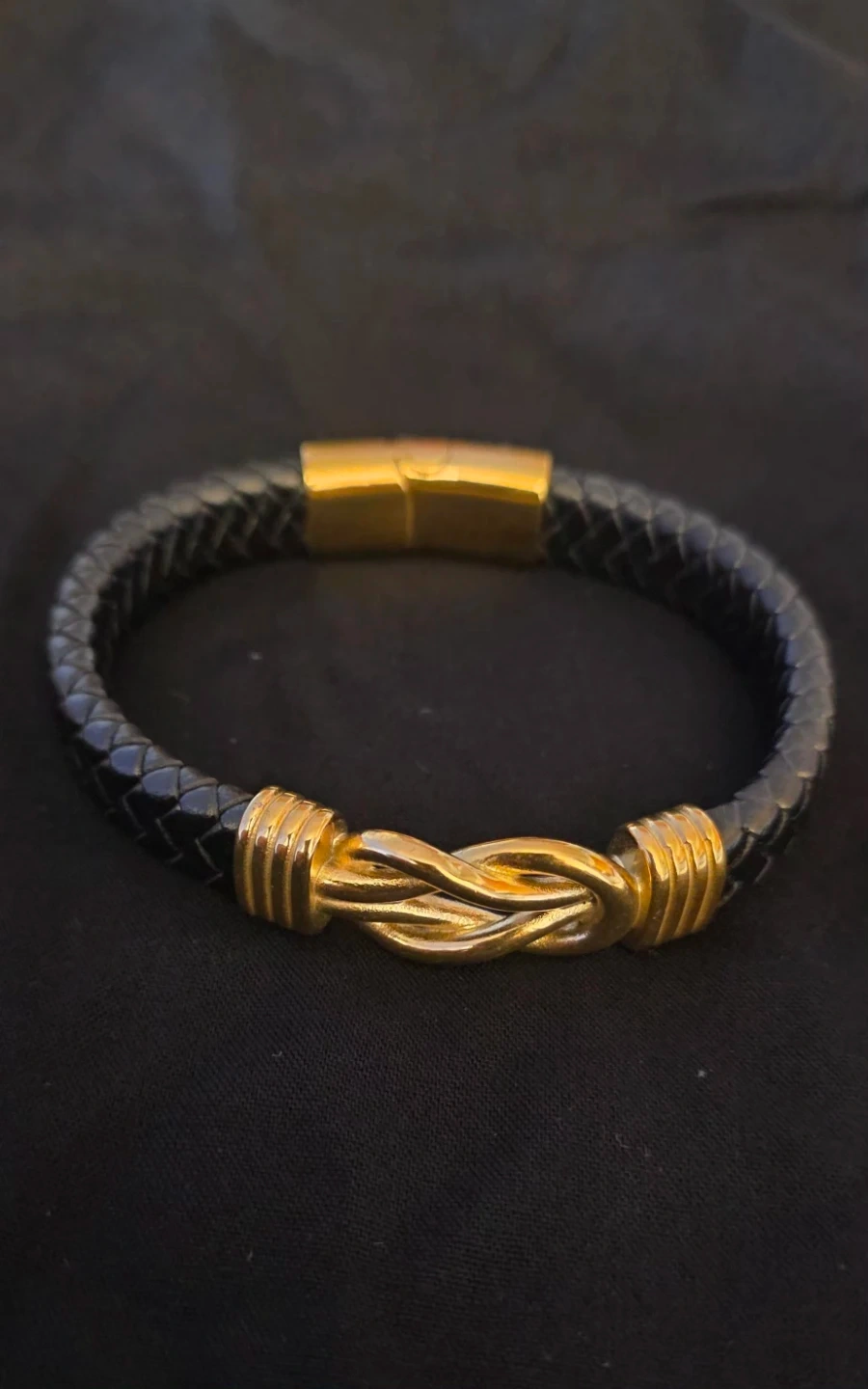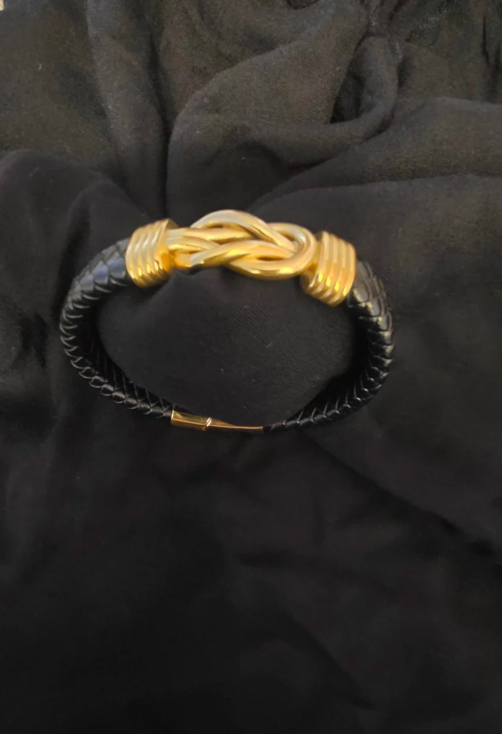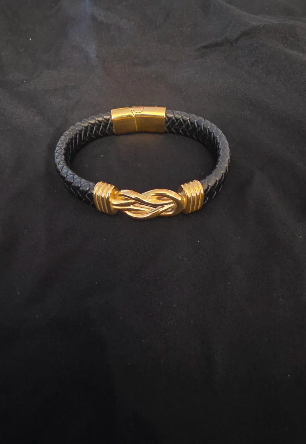 Selling a stylish braided leather bracelet with gold-tone accents! It features a unique knot design in the center and a magnetic clasp for easy wear. The bracelet make a nice addition to any outfit